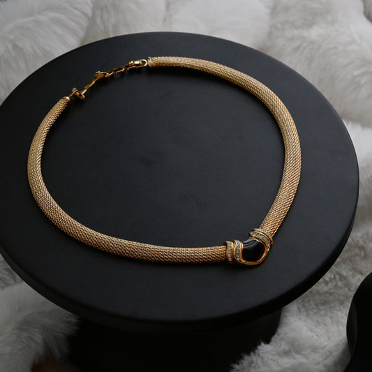 Christian Dior Vintage Rhinestones Black Enamel Gold Mesh Chocker Necklace
