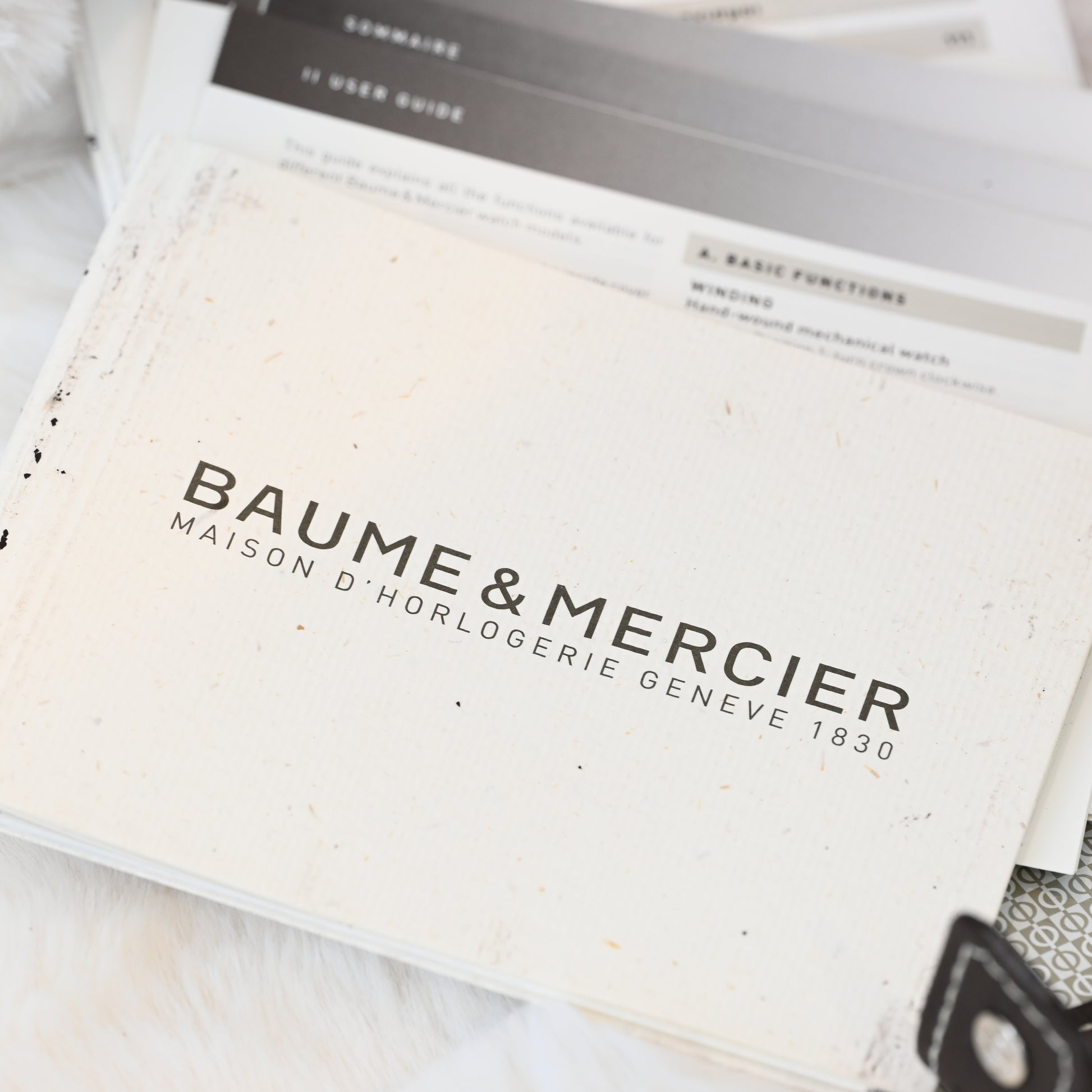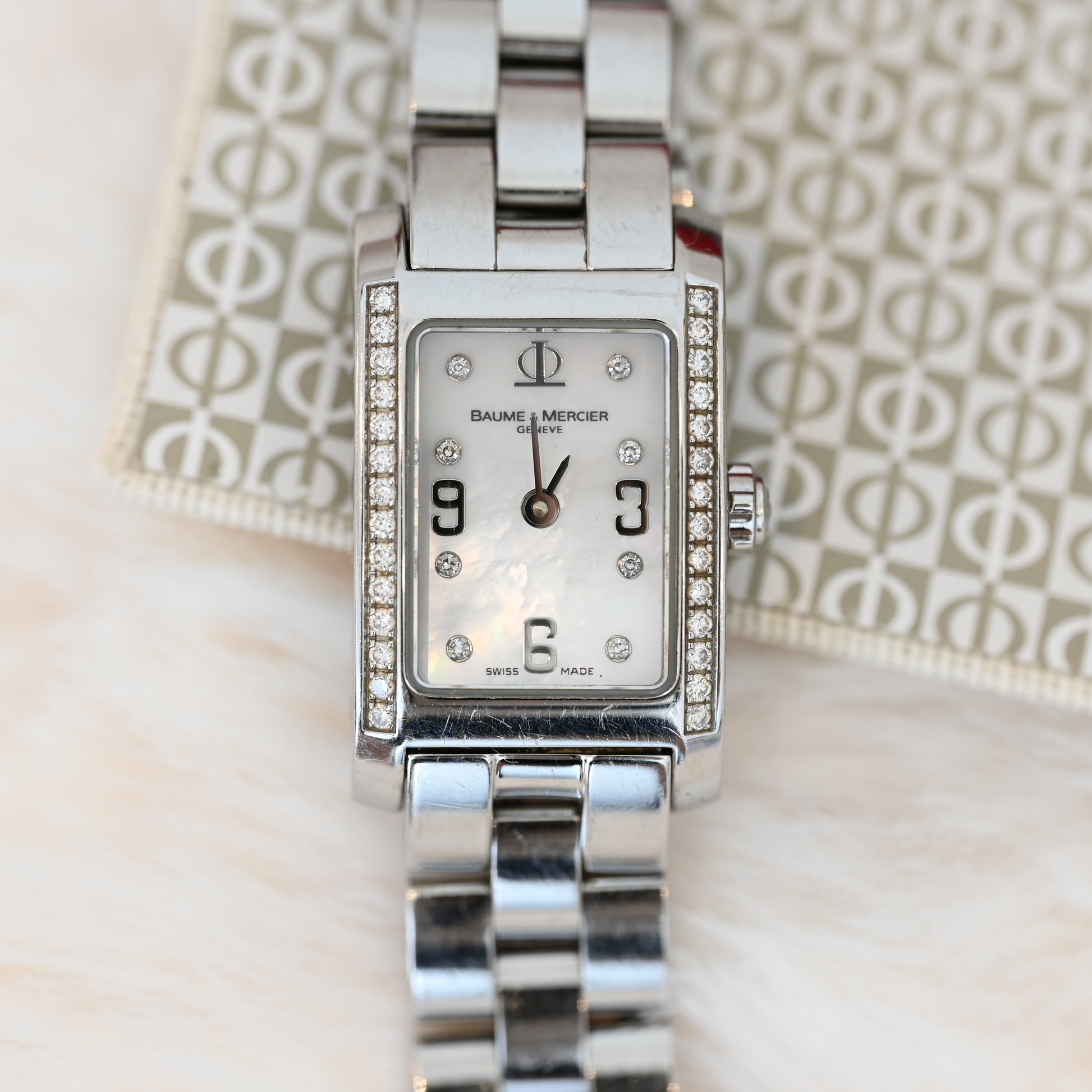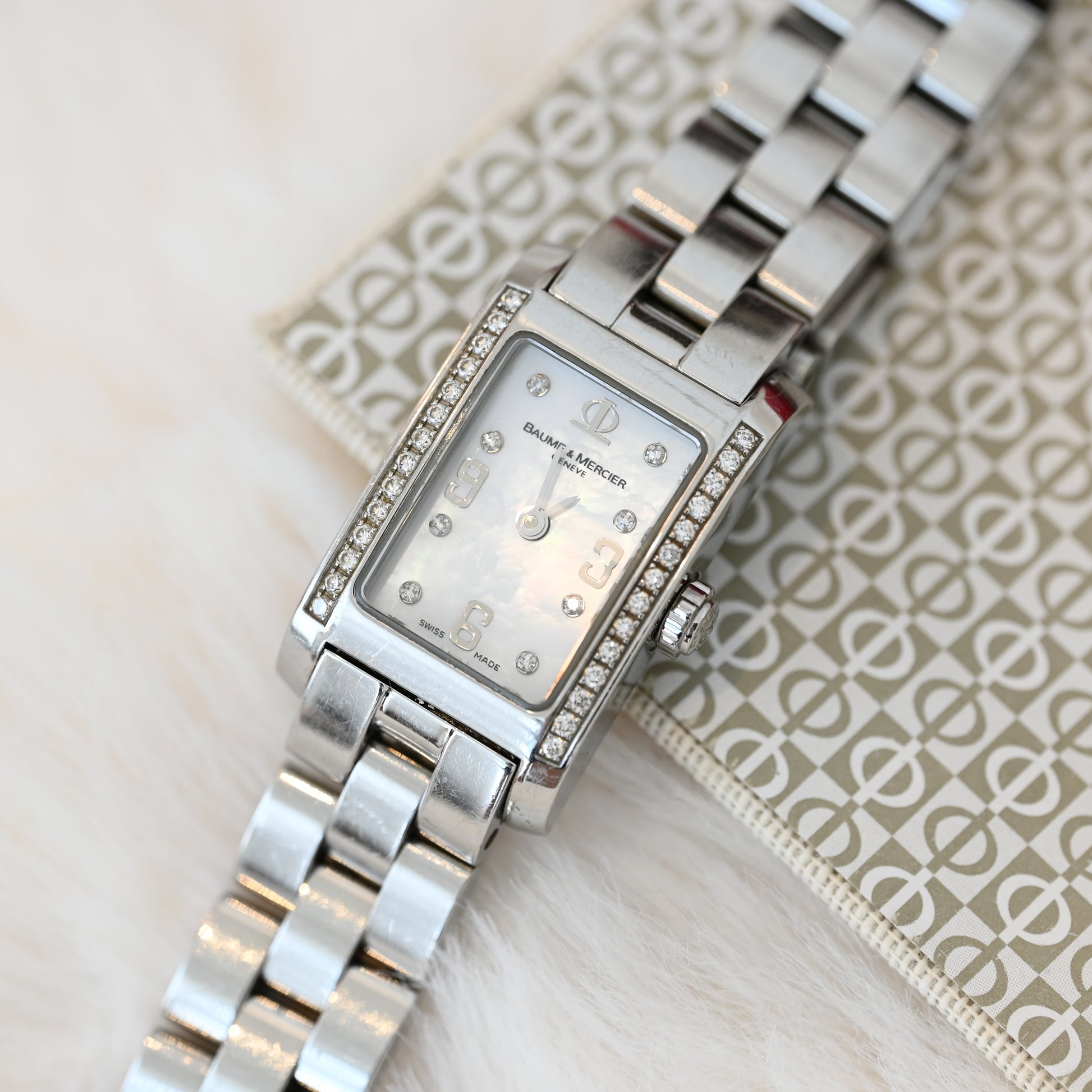 This Baume & Mercier watch features a rectangular stainless steel case framed with a double row of diamonds that catch the light beautifully from every angle. Its mother-of-pearl dial shimmers with soft iridescent tones, paired with diamond hour markers and bold numerals at 3, 6, 9, and 12 for a refined yet modern touch.