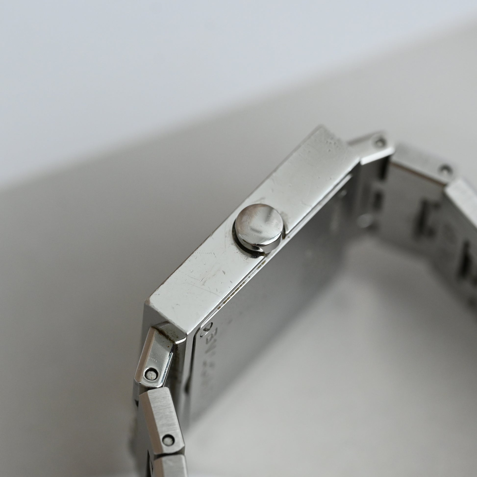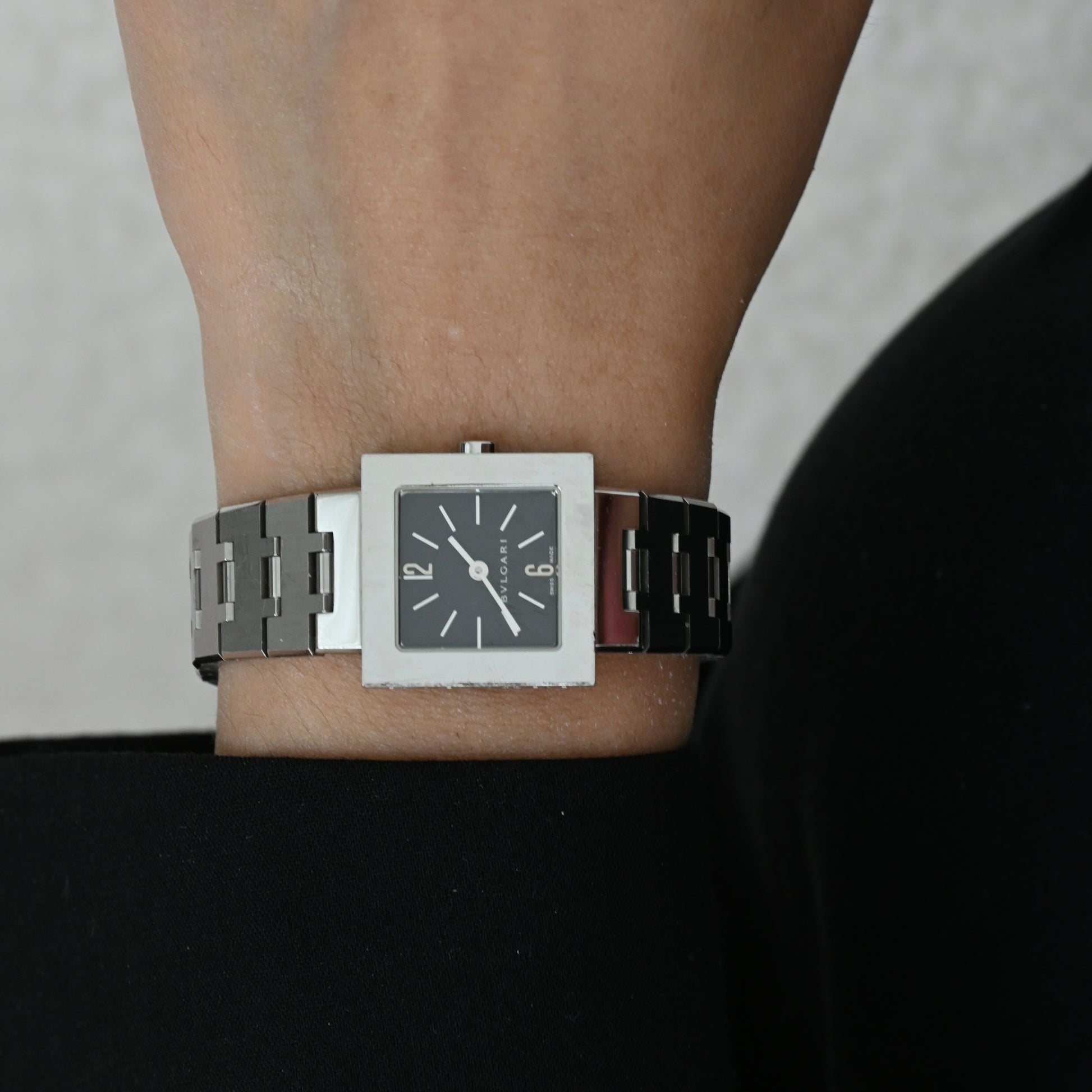This Bvlgari stainless steel square watch redefines contemporary elegance. Featuring a bold geometric design, minimalist dial with striking white markers, and a brushed steel bracelet, it embodies the brand’s signature fusion of luxury and architecture.