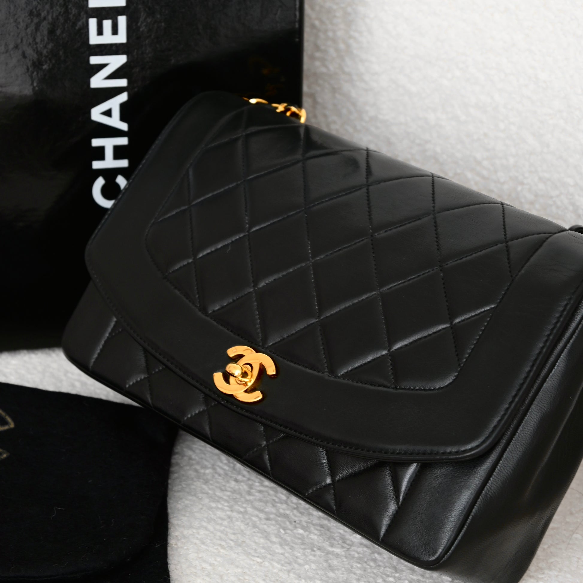 Chanel Diana Flap—named after Princess Diana, this vintage classic features soft black lambskin, elegant curves, and signature gold CC hardware. Timeless 90s royalty, forever in vogue.