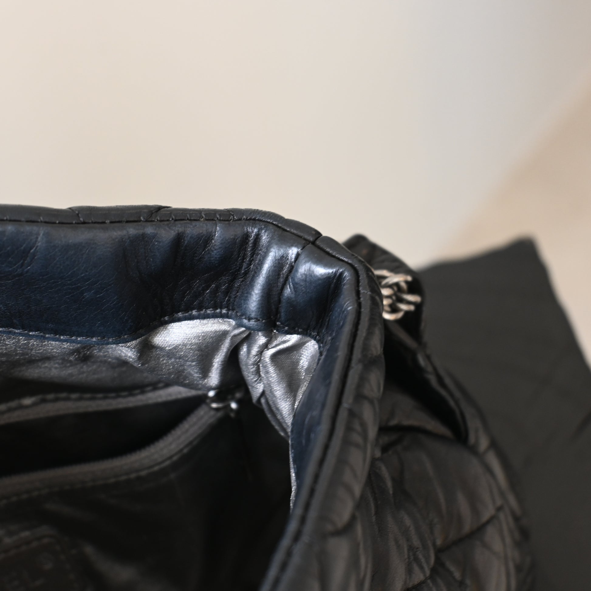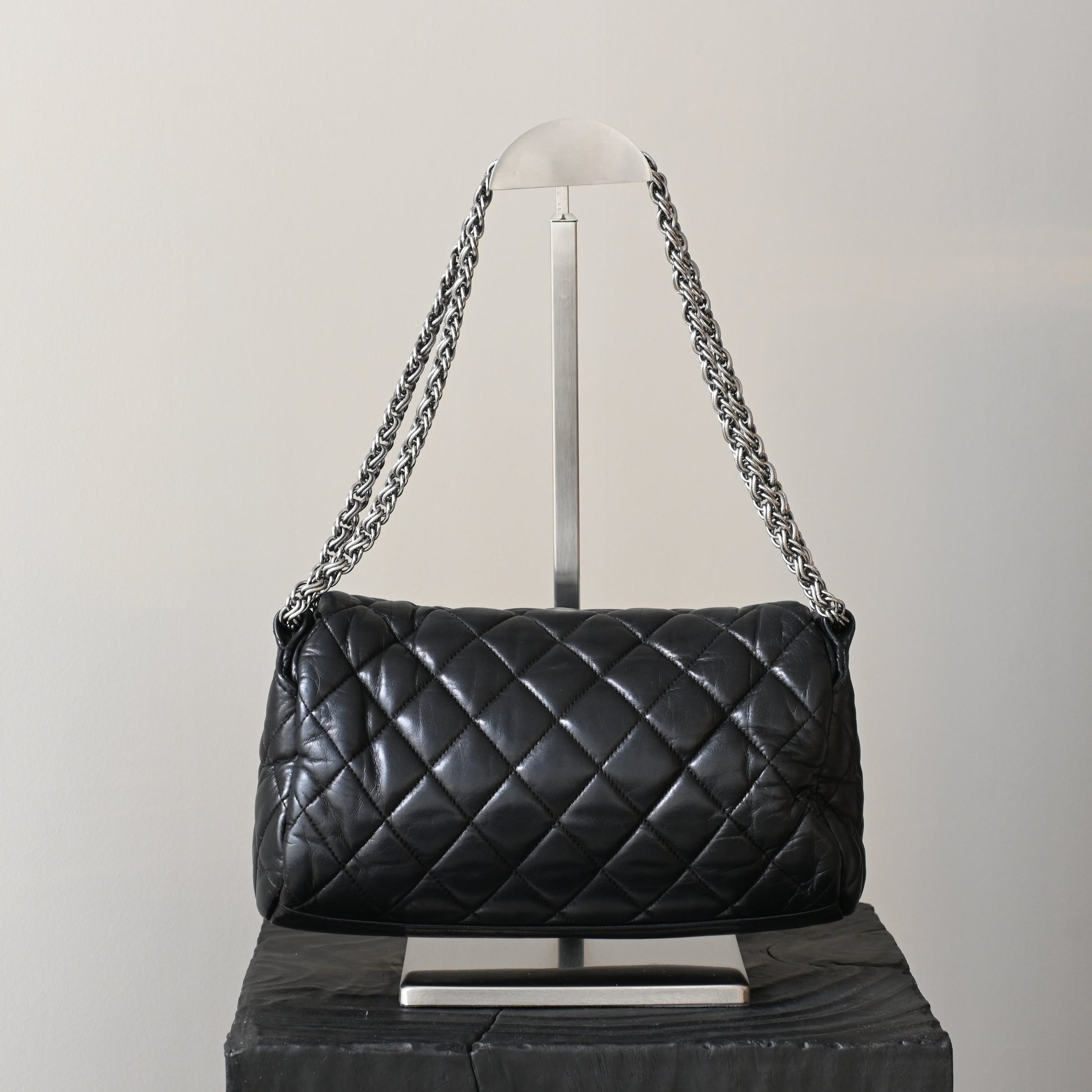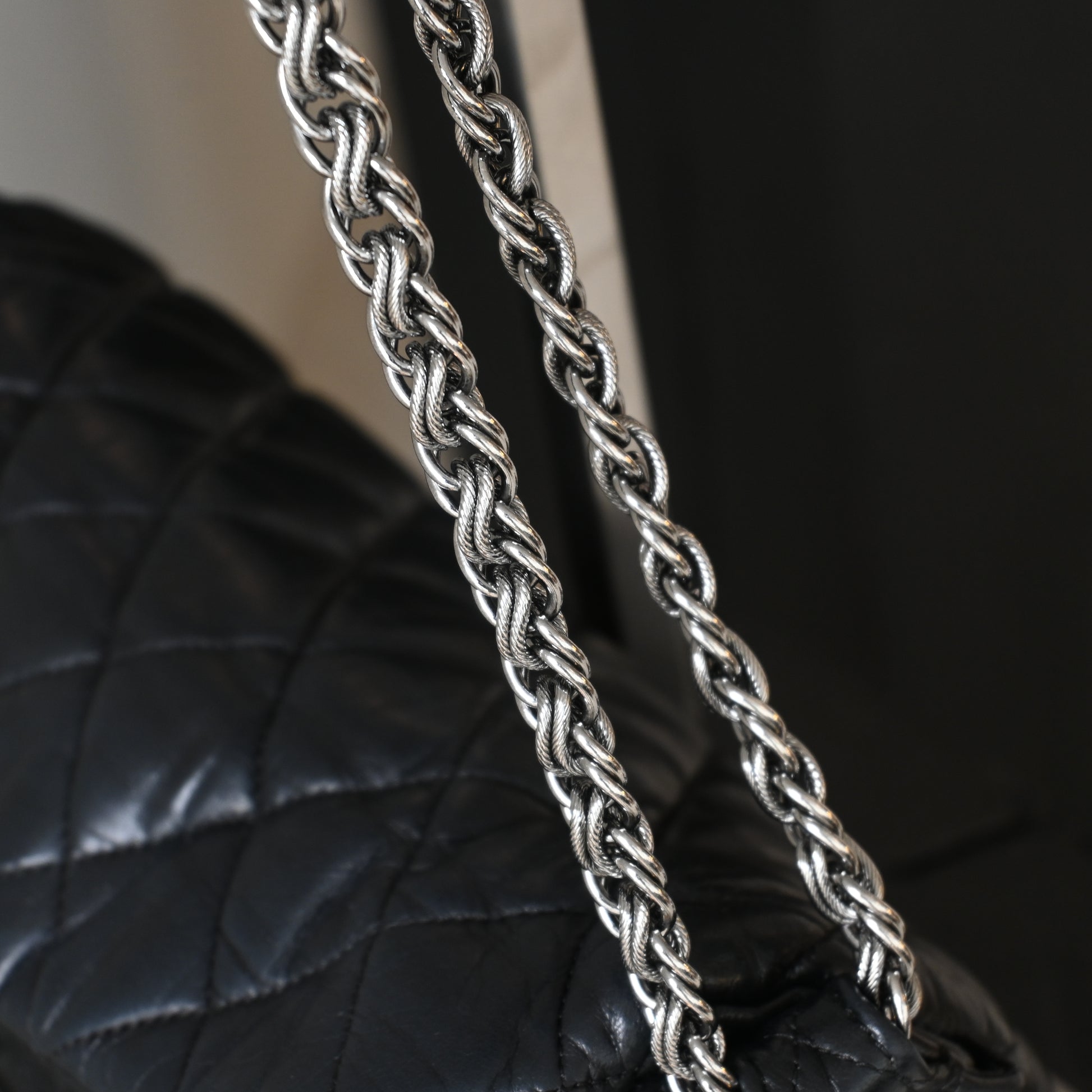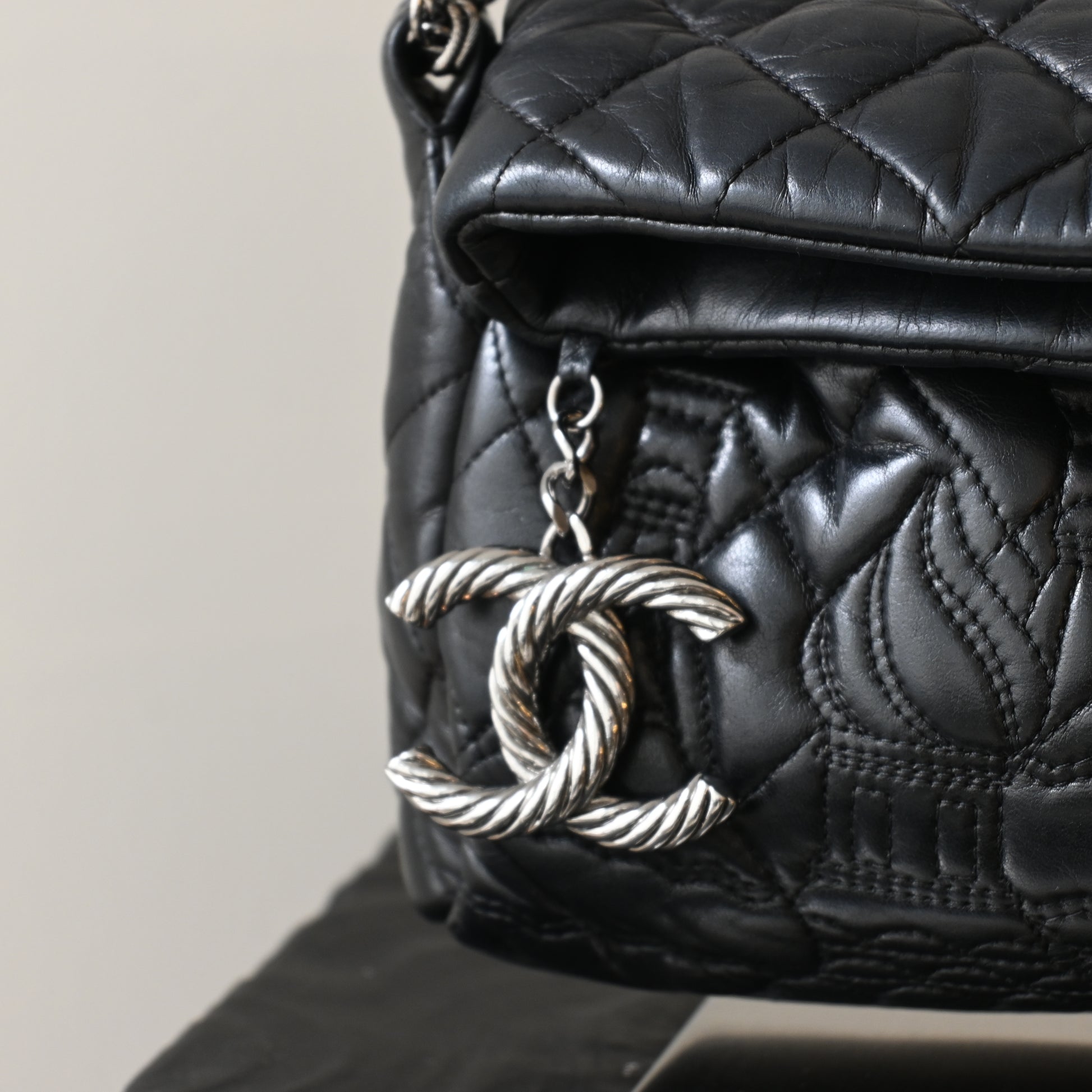 Crafted from luxurious black leather, the bag features intricate ornamental quilting inspired by Russian folk motifs, giving it a rich texture and depth that instantly sets it apart from standard Chanel designs. The front is adorned with a striking rope-style CC logo in silver-tone hardware, a signature detail unique to this collection.