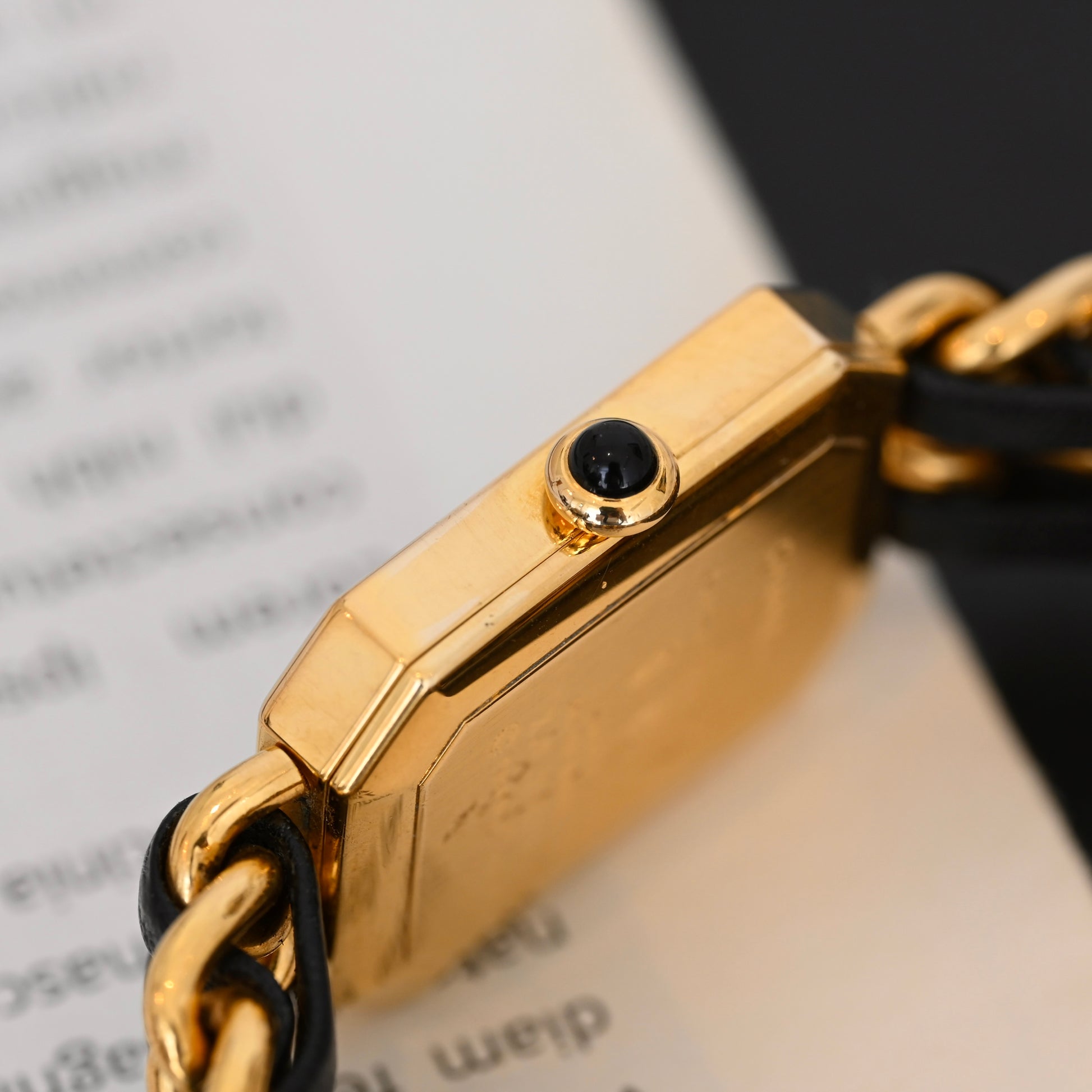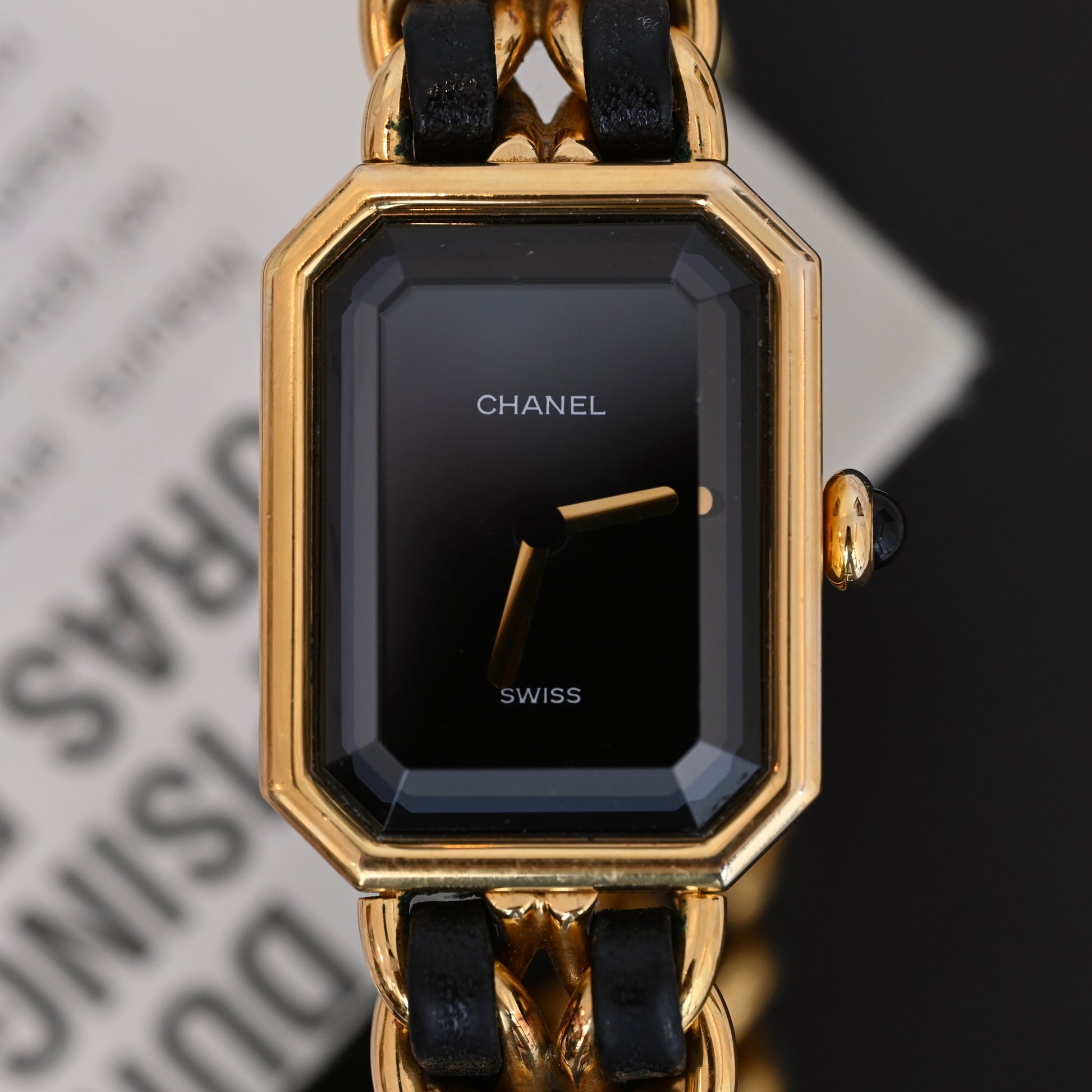 Bold in gold — a sharp octagonal case, a jet-black dial, and a chain-link strap woven with leather. Power dressing, distilled into a watch.