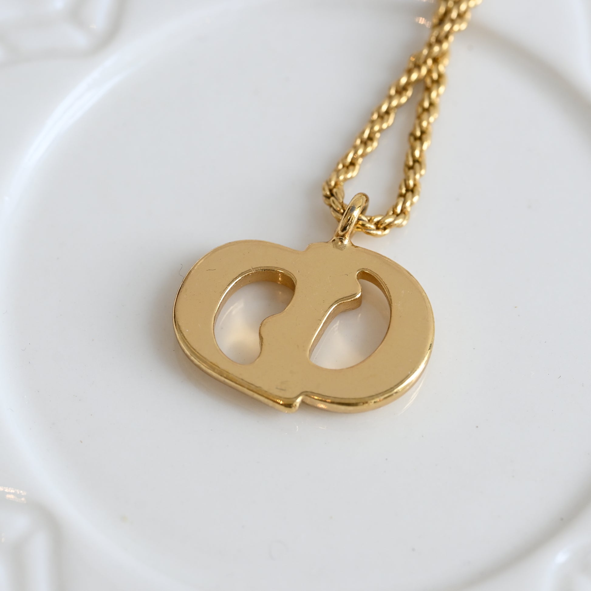 This gold Dior pendant brings 90s boldness with a chic twist, dangling on a rope chain that’s all about timeless glam.