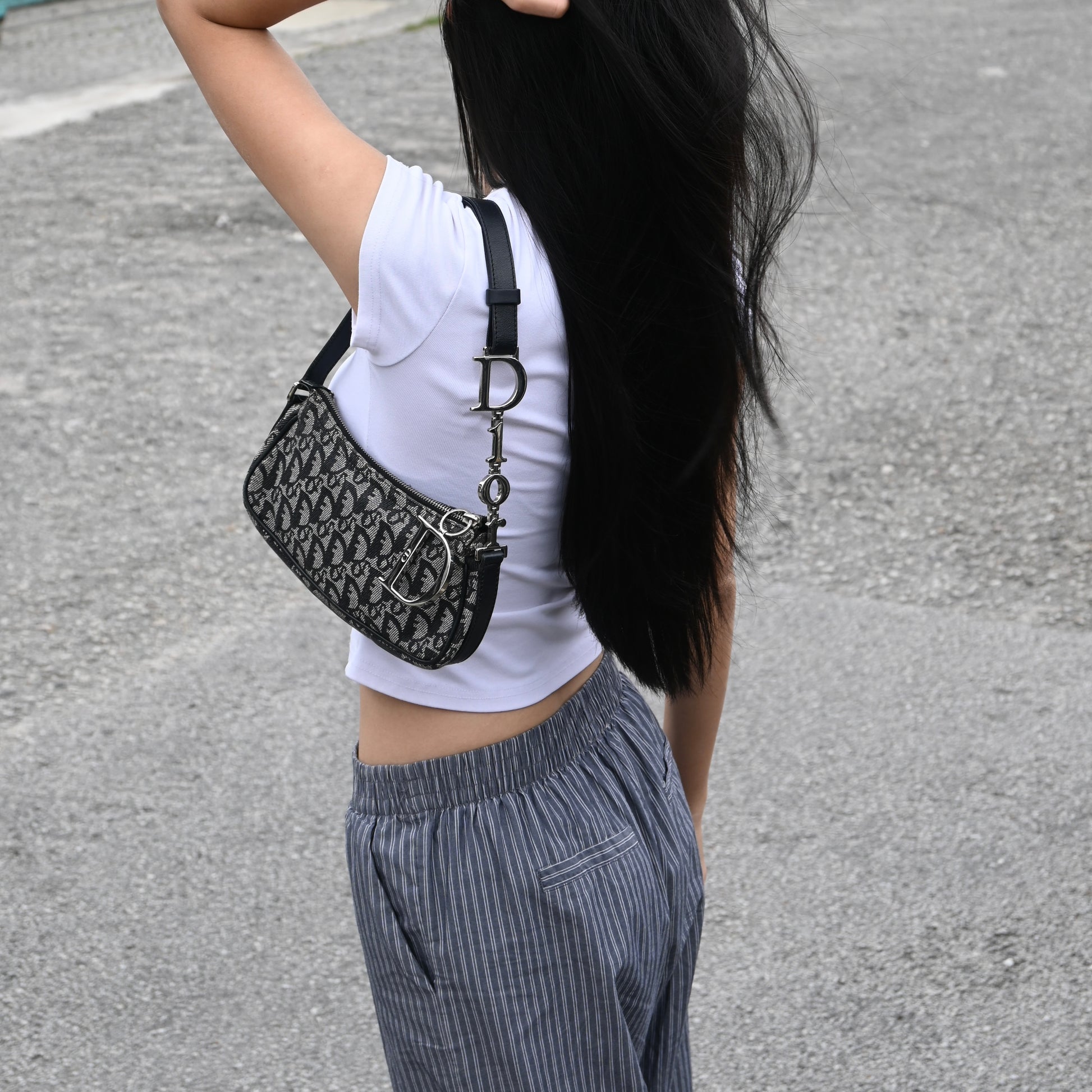 The highly coveted Dior "D" Charm bag, adorned with gleaming Dior alphabet hardware. A timeless piece that turns heads wherever it goes.