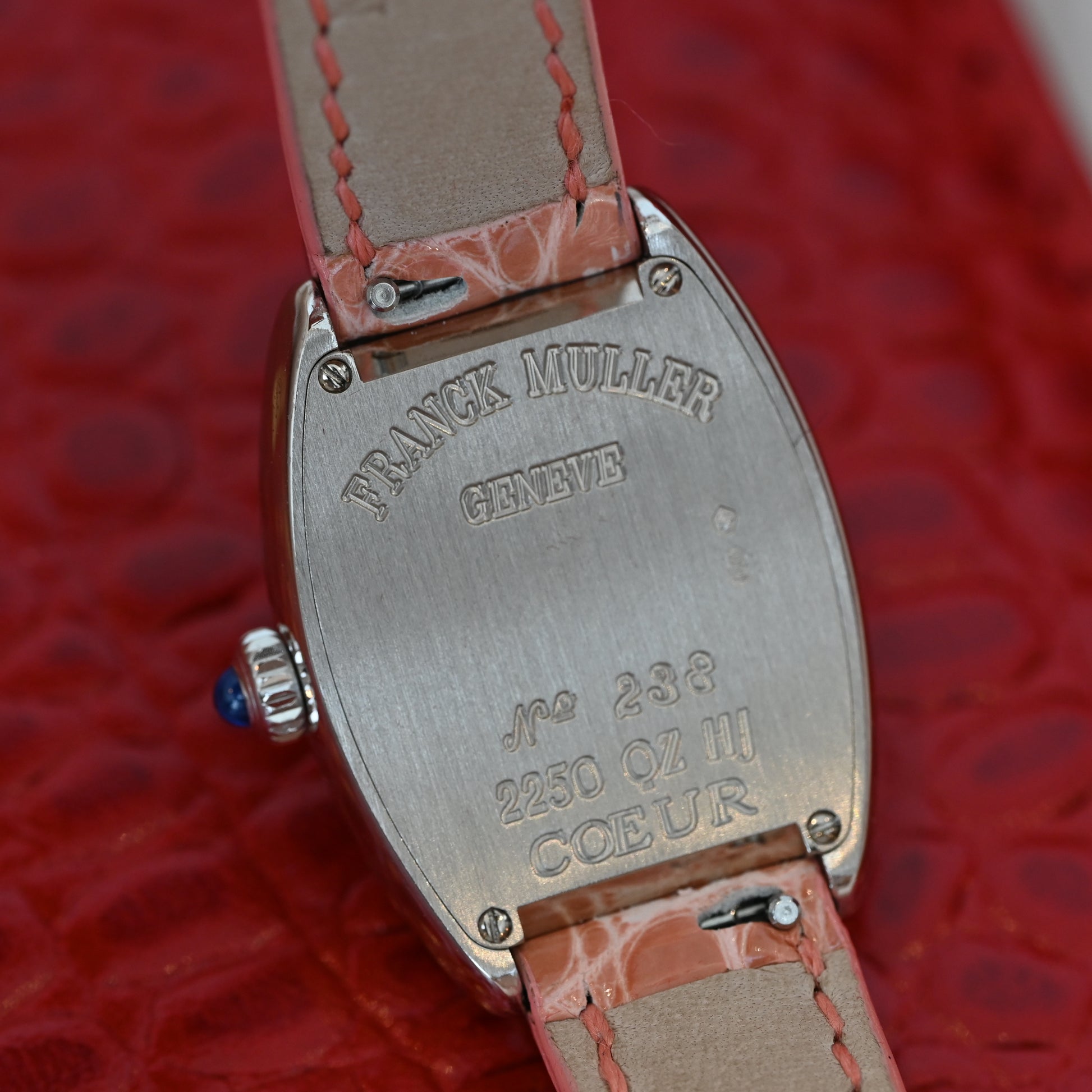 A pink guilloché dial bursting with whimsy, oversized numerals dancing across the face, and diamond-studded hearts sealing the romance—this Franck Muller is timekeeping with a heartbeat.