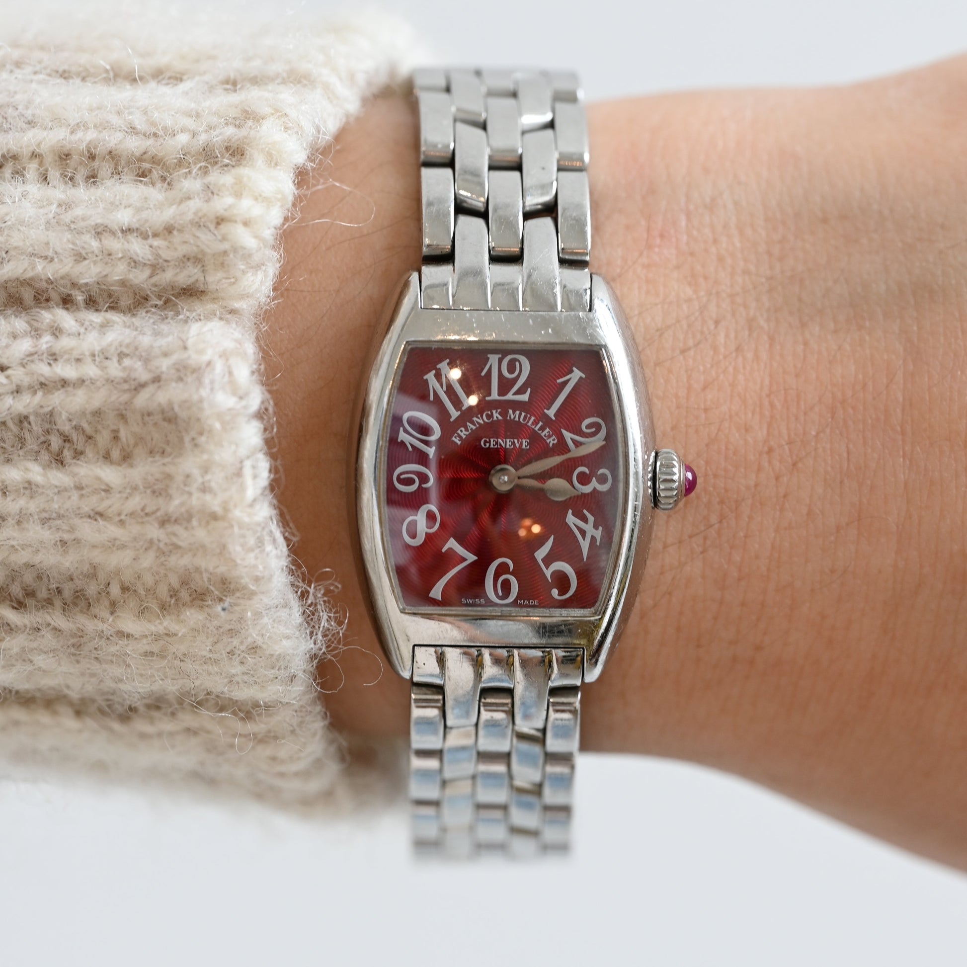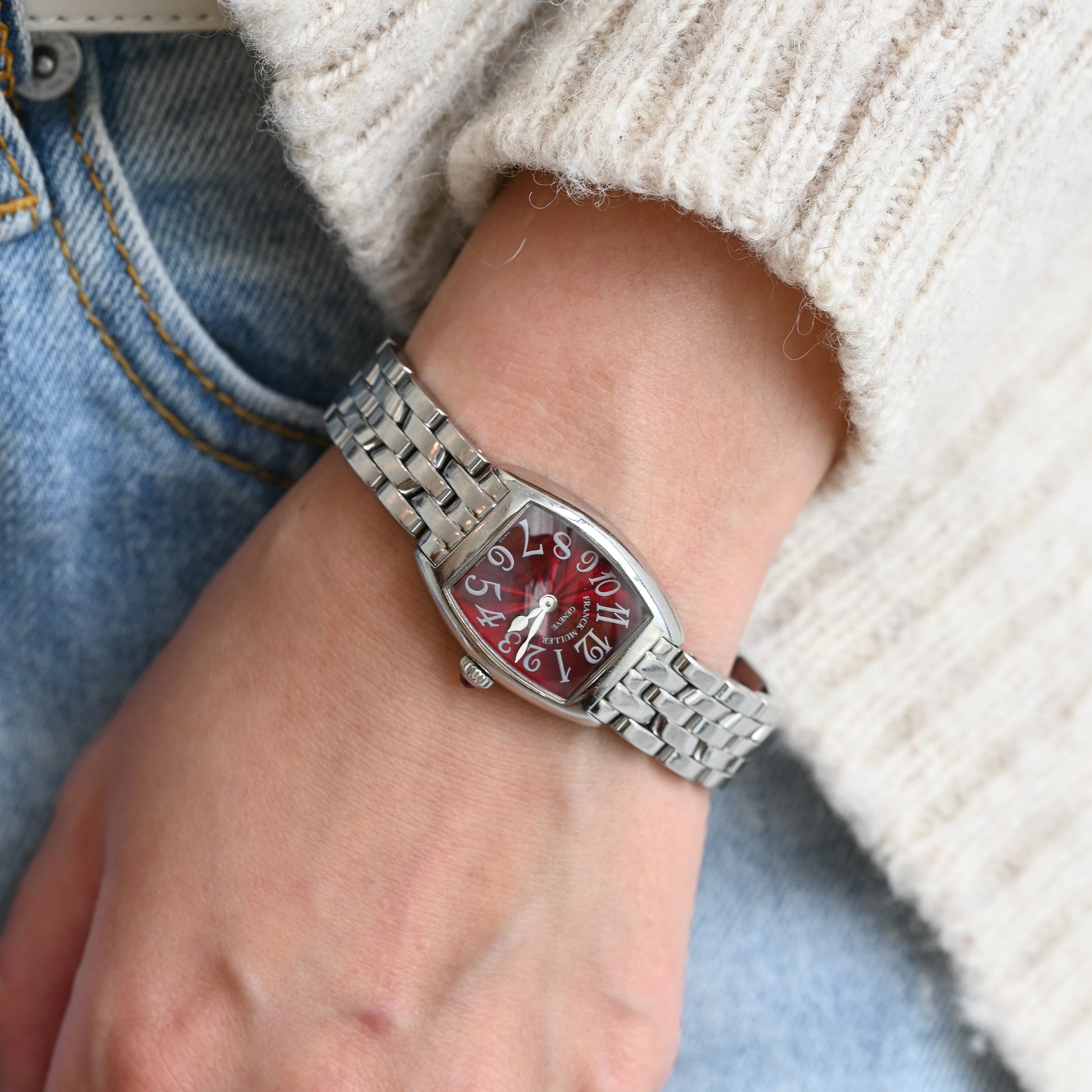The iconic Tonneau Curvex case, with its elegant curved profile, is a signature of Franck Muller’s design-driven rise in haute horology. Paired with a striking red dial that evokes a refined festive, Christmas-season elegance, it makes a bold yet timeless statement on the wrist.