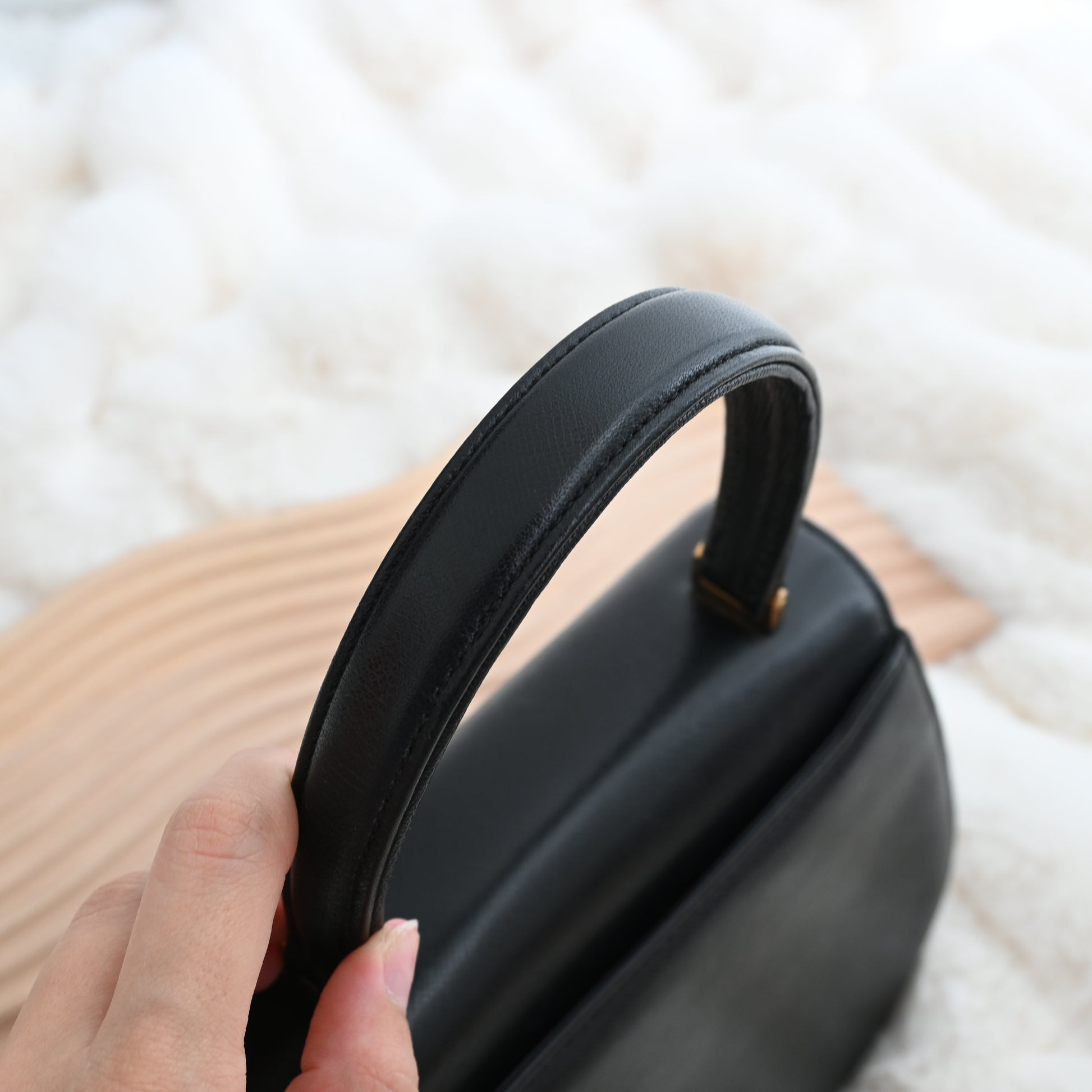 Sleek, structured, and oh-so-classy—this top handle bag stuns with its curvy silhouette, luxe black leather, and a bold gold turn-lock closure. Minimalist design, maximum impact—your go-to for instant chic!