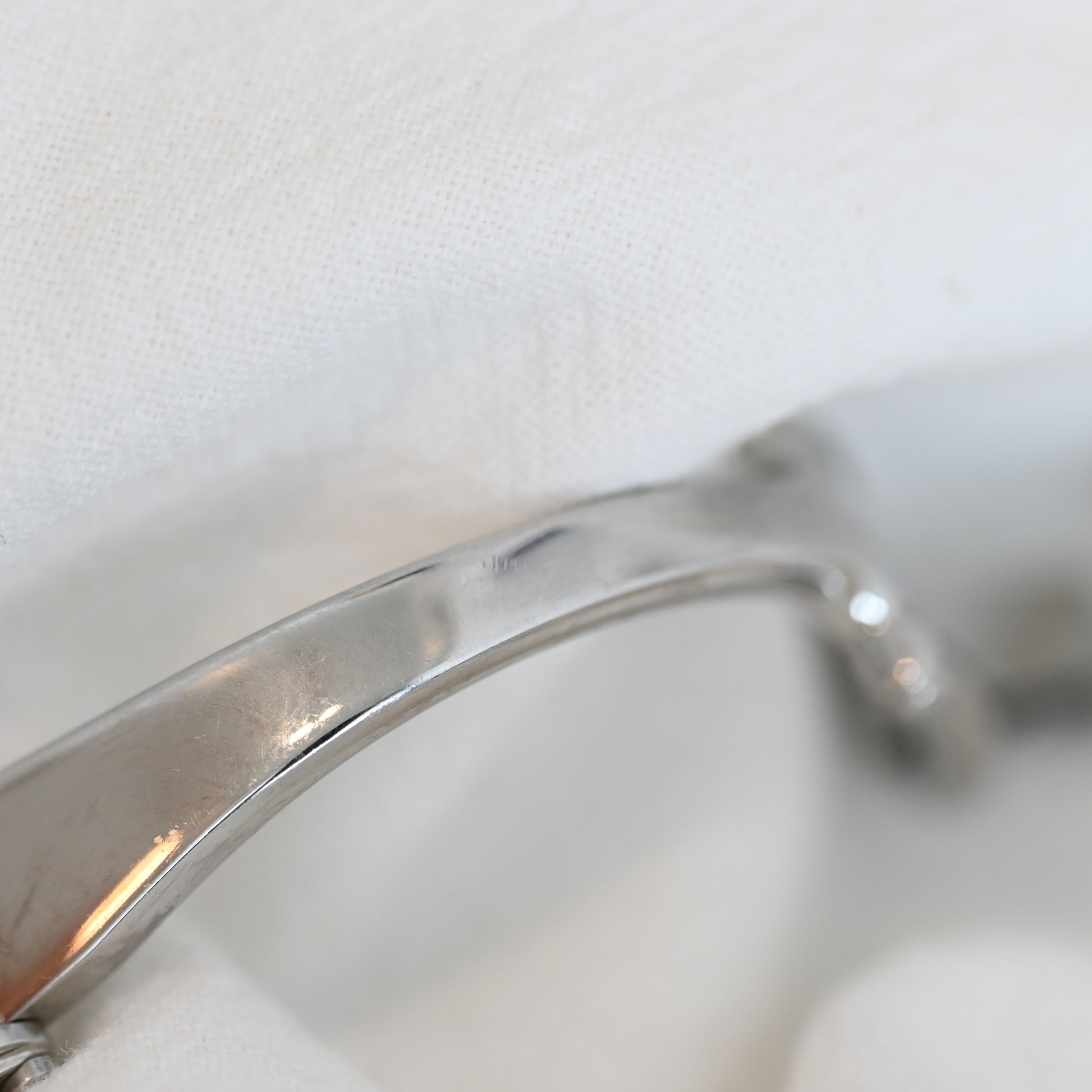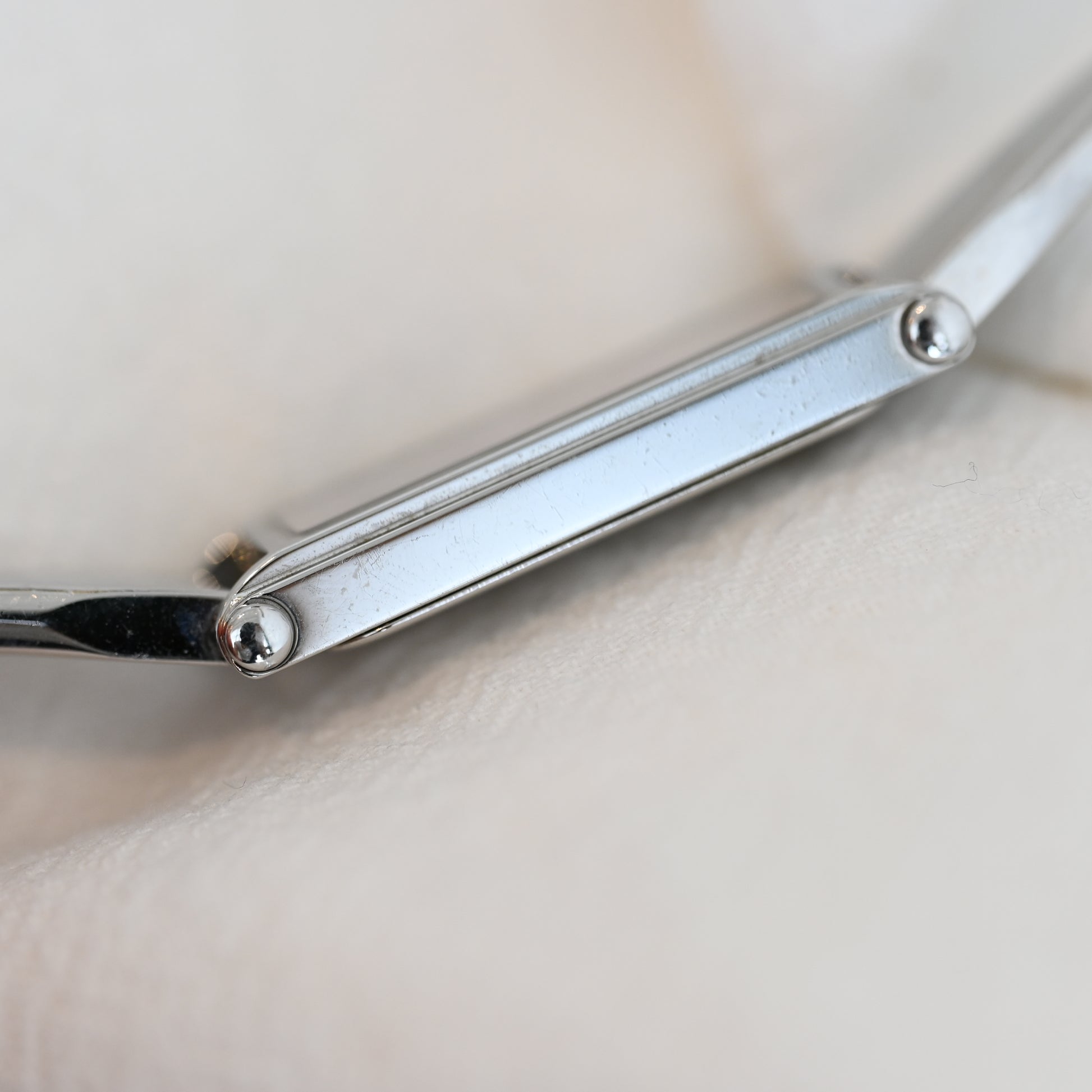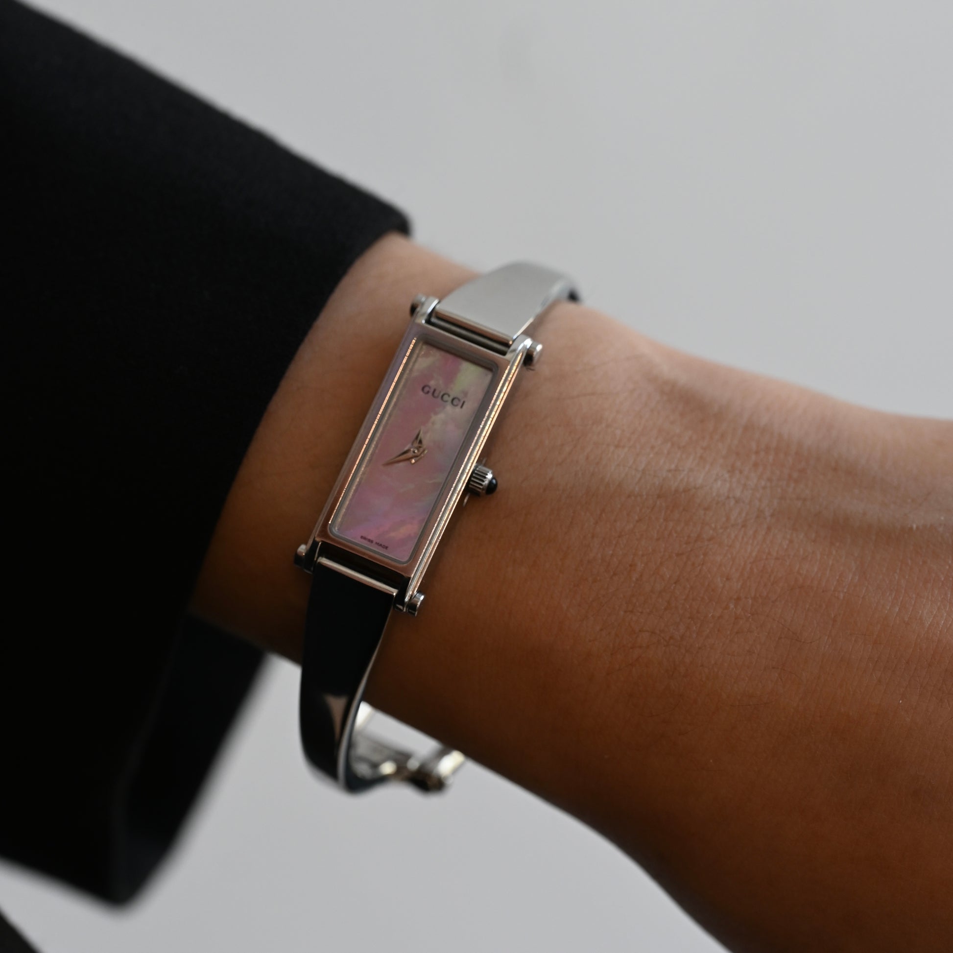 Iconic Gucci 1500L. This slender stainless steel bangle watch features a sleek, minimalist aesthetic. The iridescent pink mother-of-pearl dial provides a gorgeous backdrop for the signature Gucci logo, making it the perfect accessory for both formal and everyday wear.