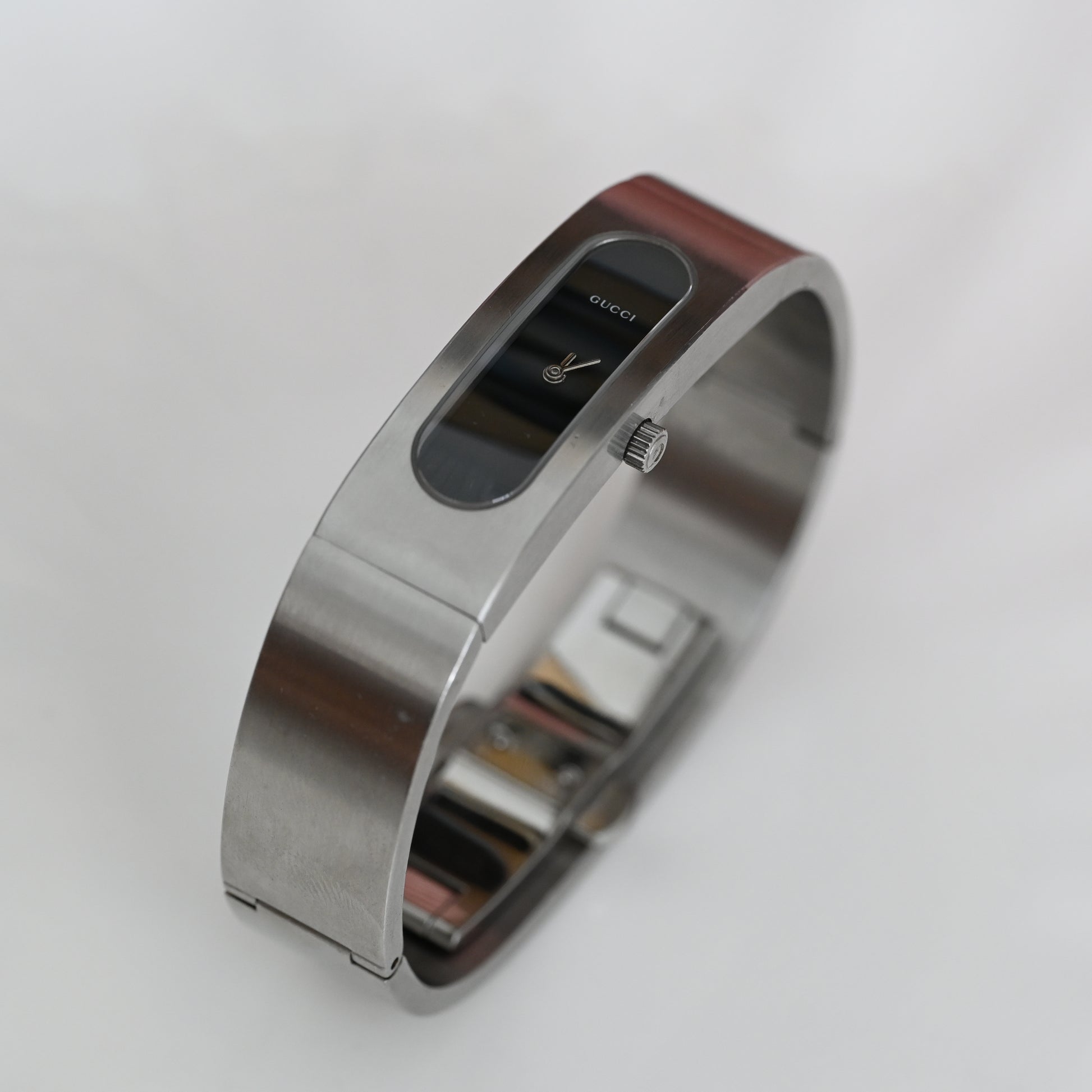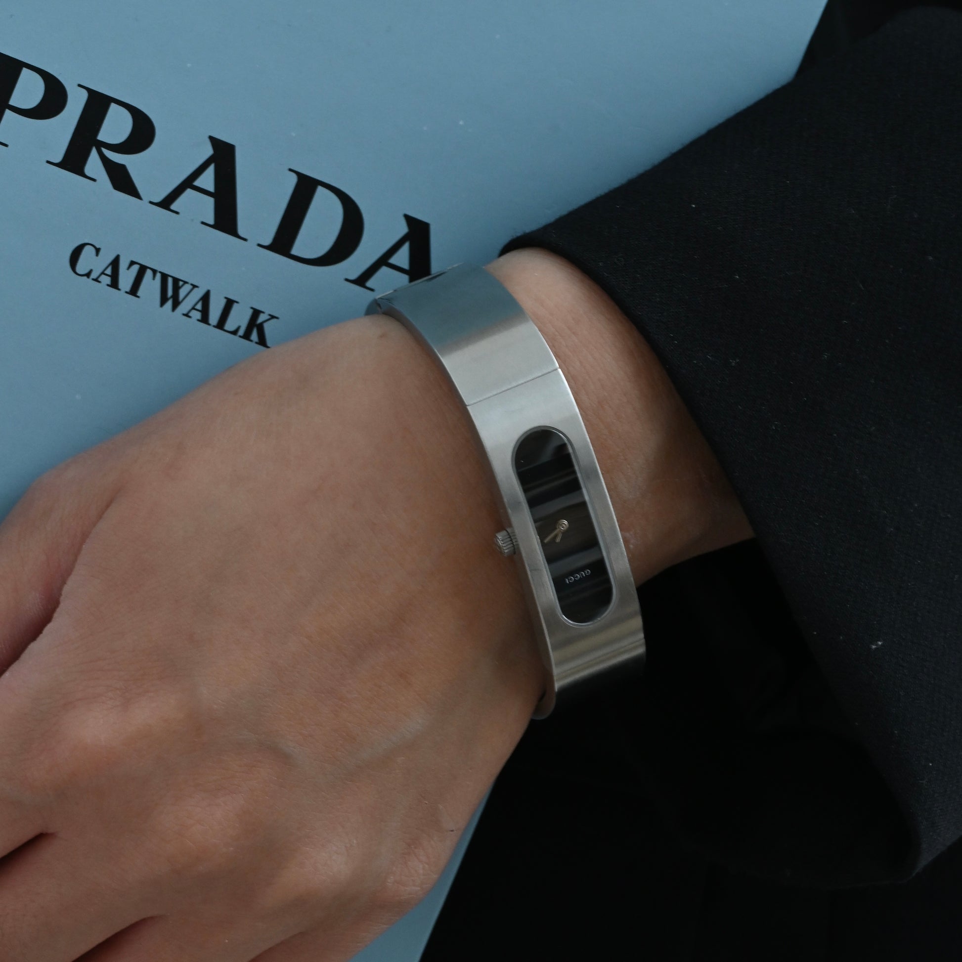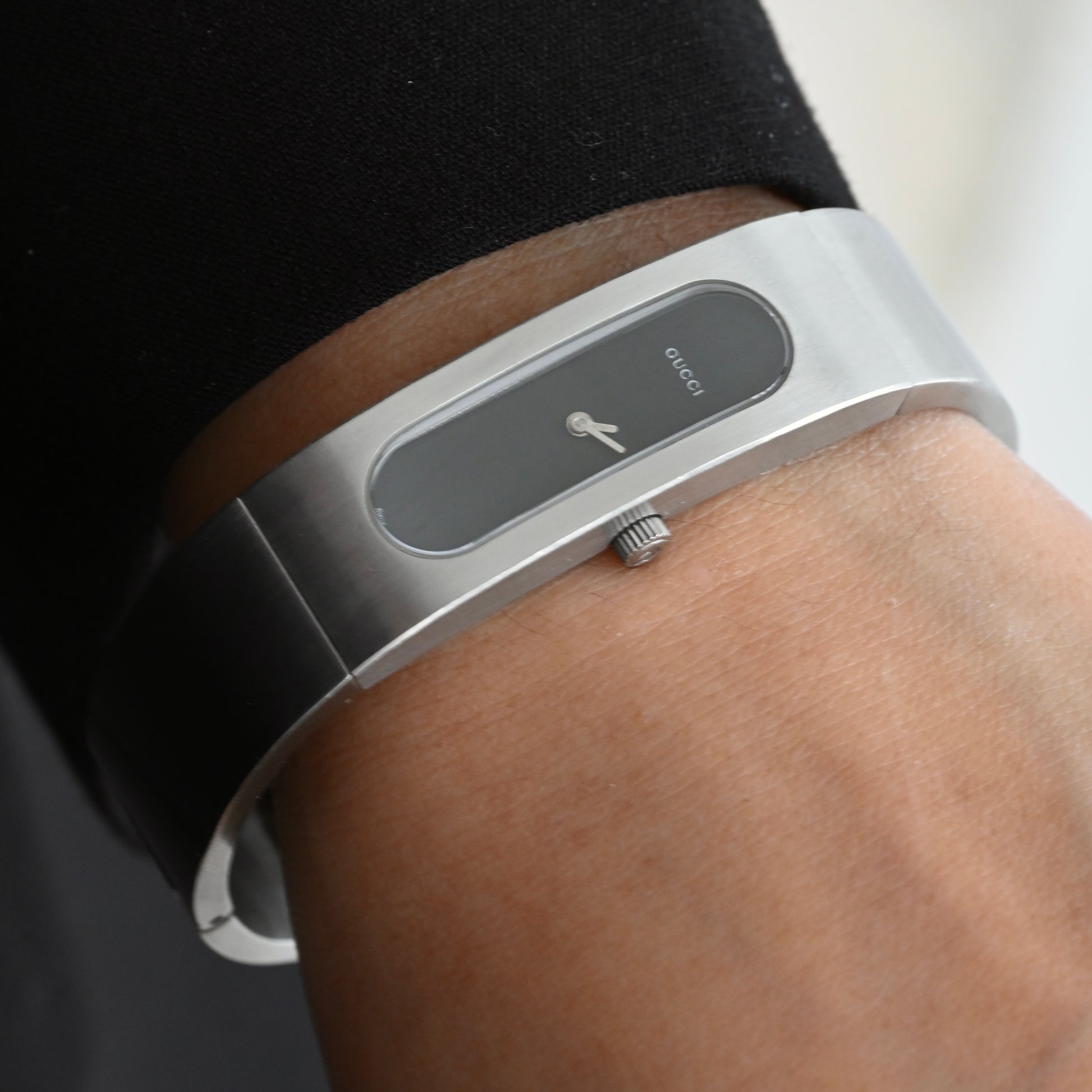 Where runway meets wristwear — this ultra-slim Gucci bangle watch pairs a jet-black dial with sculpted steel for a look that’s effortlessly modern, unapologetically chic.