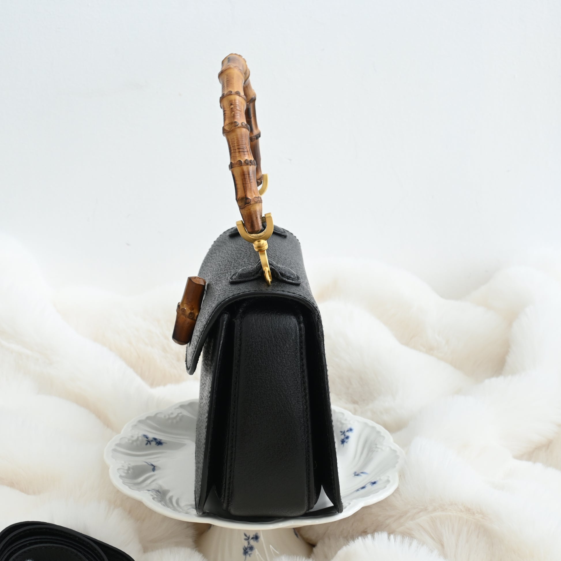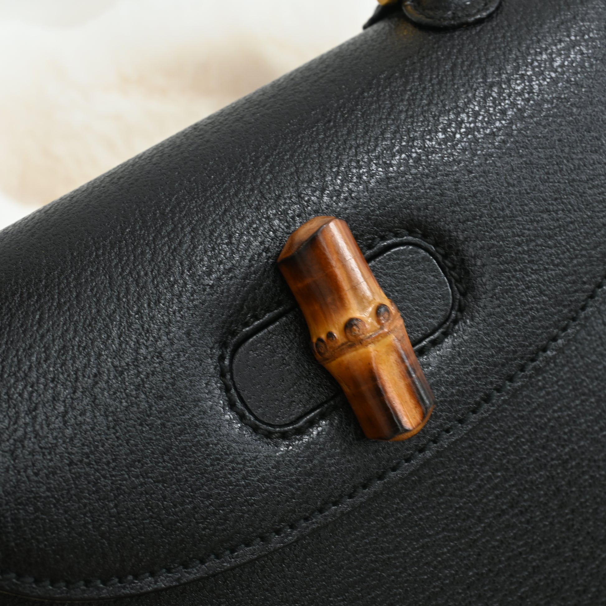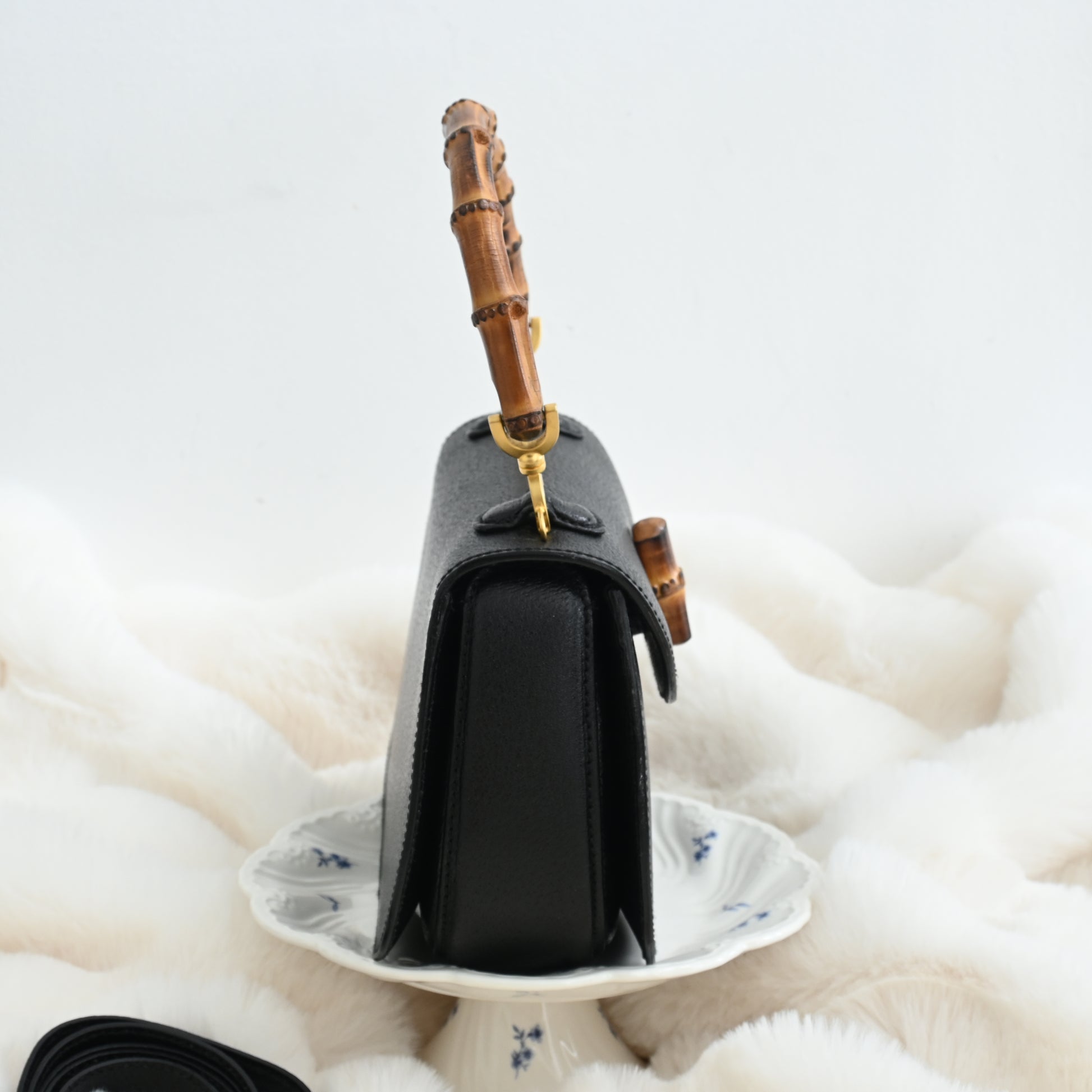 It contrasts a sculpted, pebble-grain leather body with the raw elegance of hand-shaped bamboo. The arched top handle and central bamboo toggle echo mid-century design sensibilities, turning utility into art.