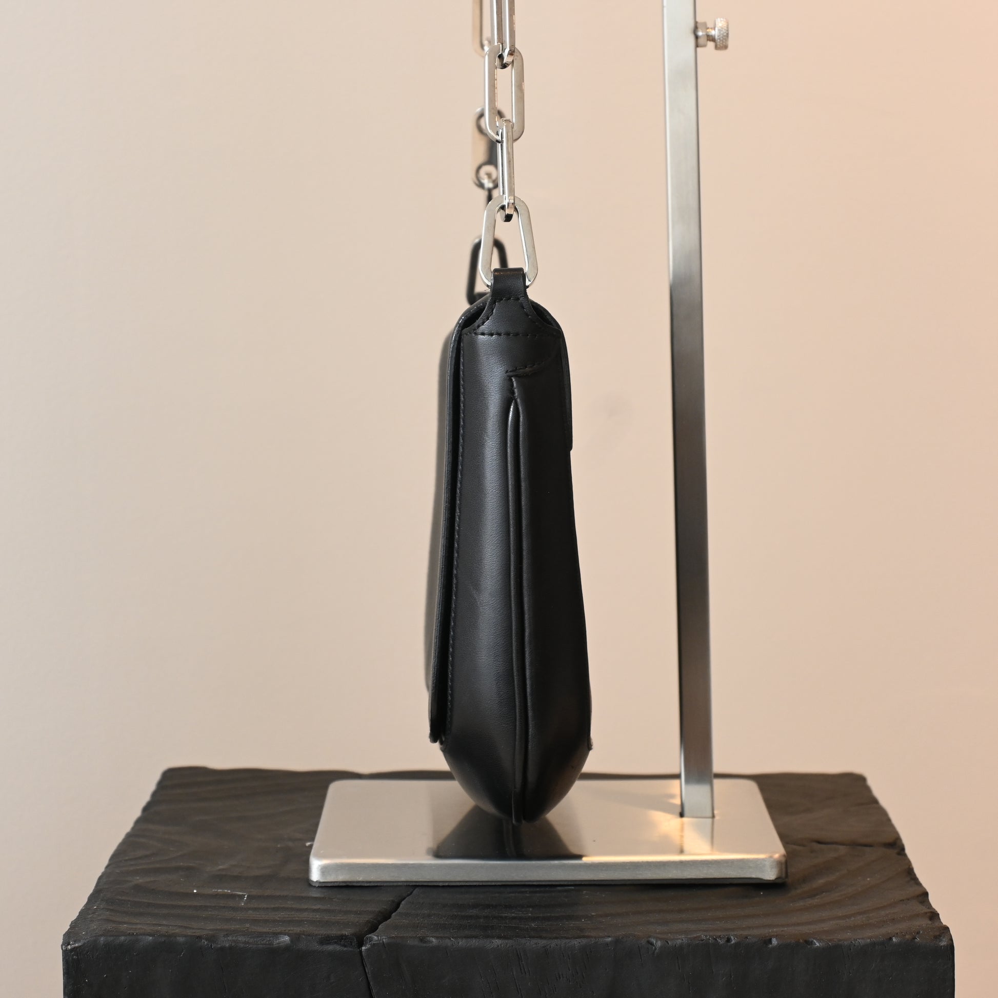 This late 1990s Gucci bag, a Tom Ford masterpiece, marries handcrafted black calfskin with a sleek, engraved silver chain strap. The magnetic flap secures your essentials, while the polished Gucci plaque embodies understated luxury.