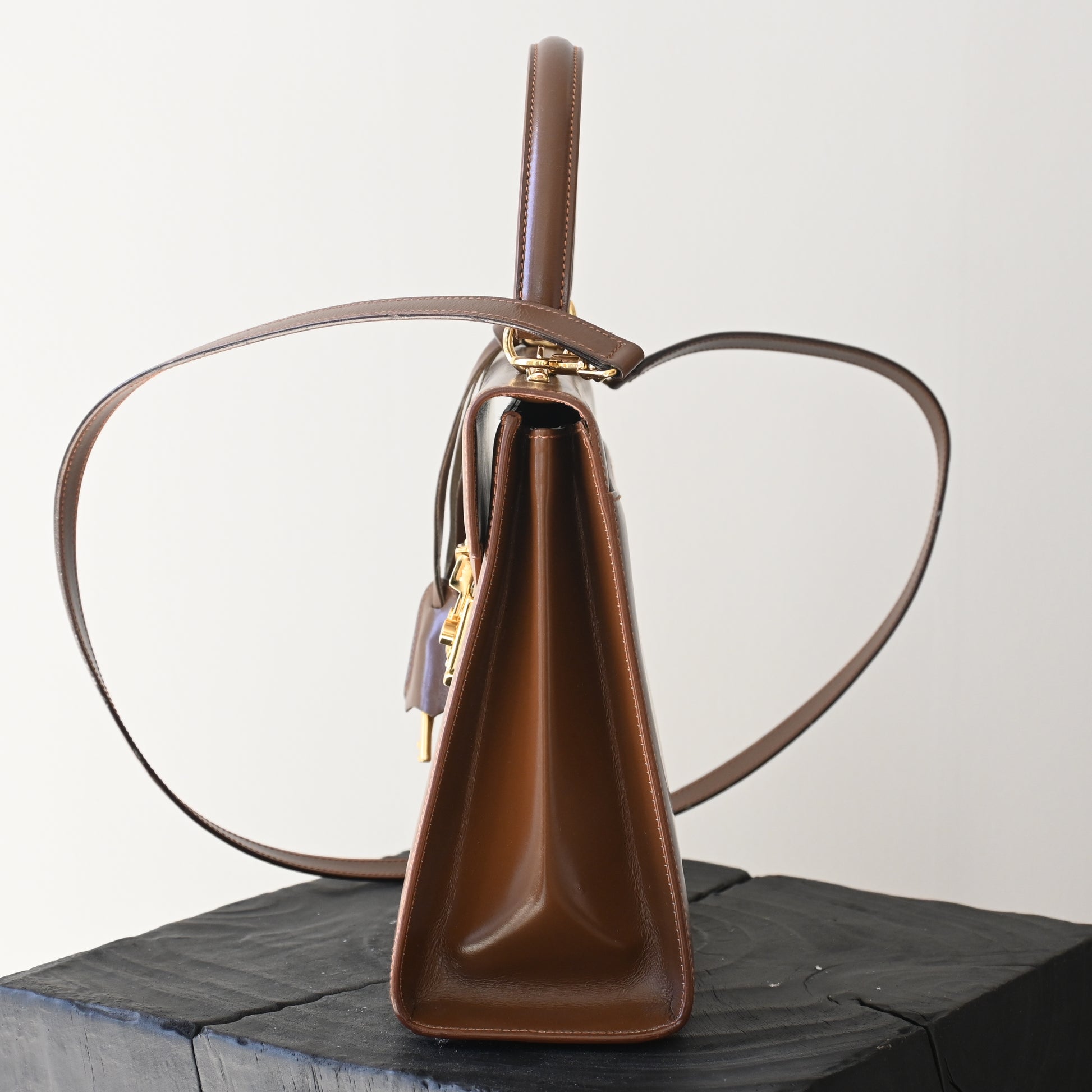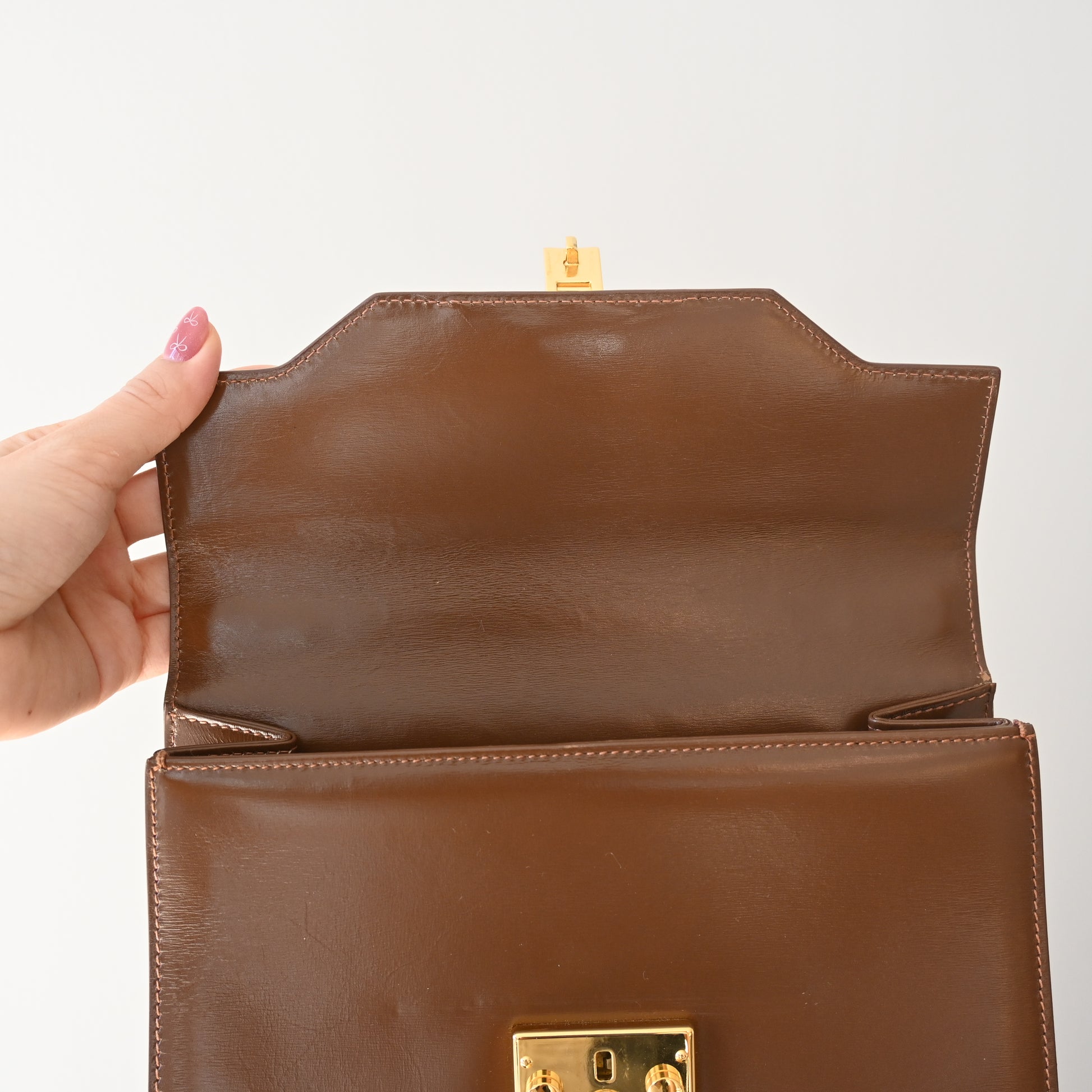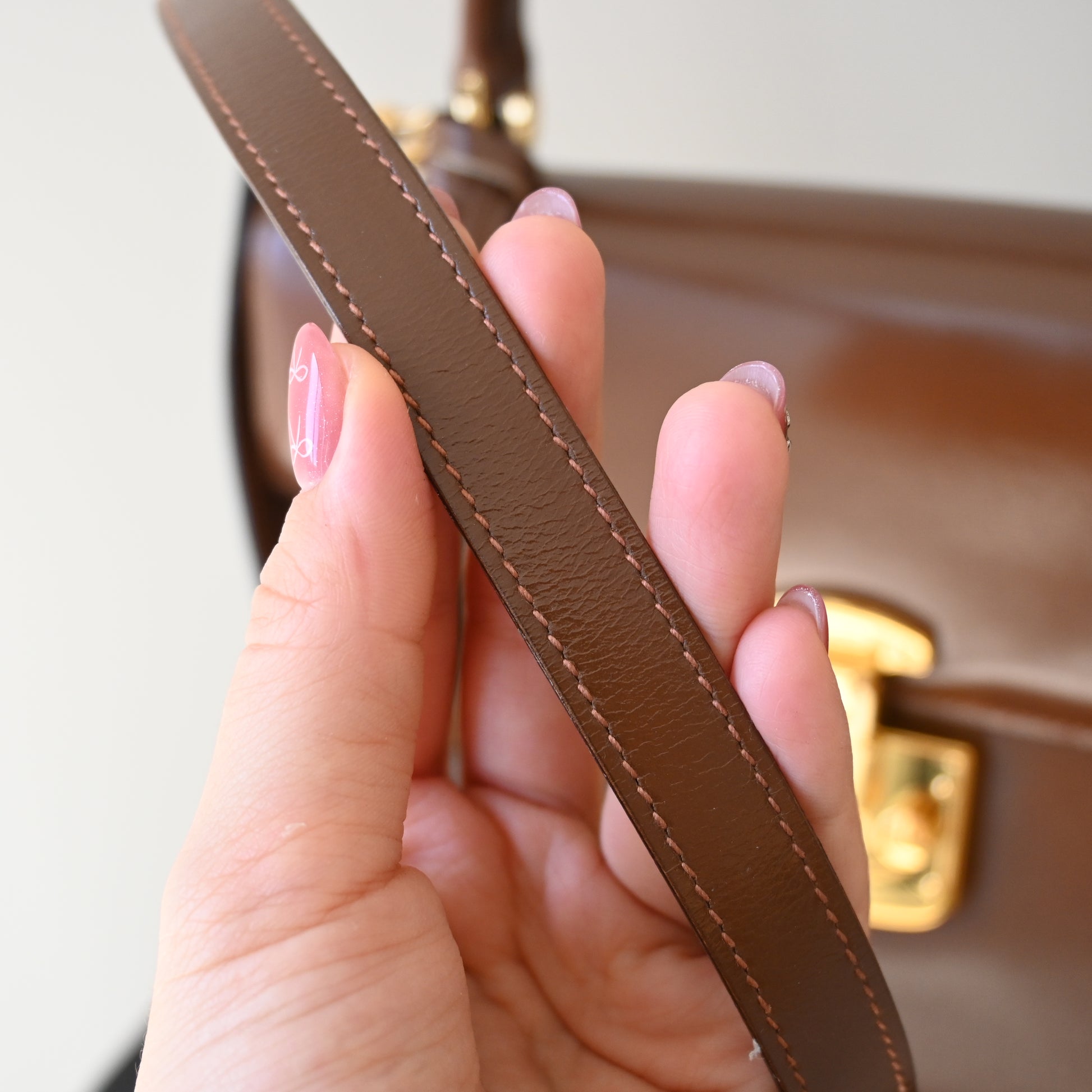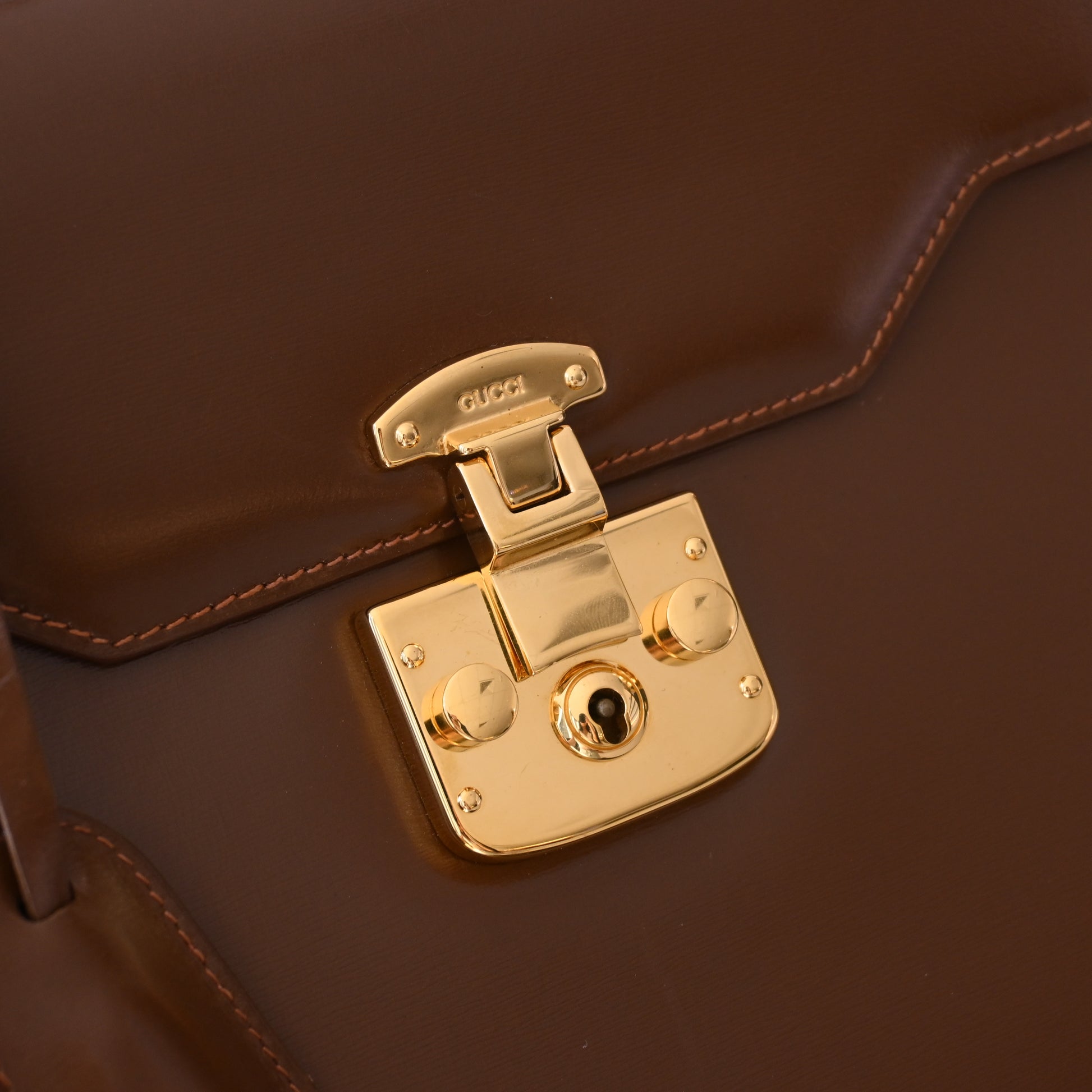 A timeless icon from Gucci’s vintage era, the Old Gucci Lady Lock Kelly Bag embodies classic elegance and refined craftsmanship. Crafted from smooth structured leather in a warm brown tone, this sophisticated silhouette is accented with the signature Lady Lock gold-tone closure for a polished finish.