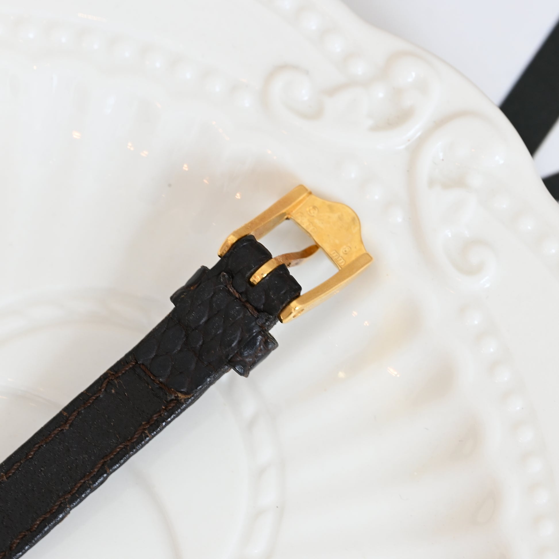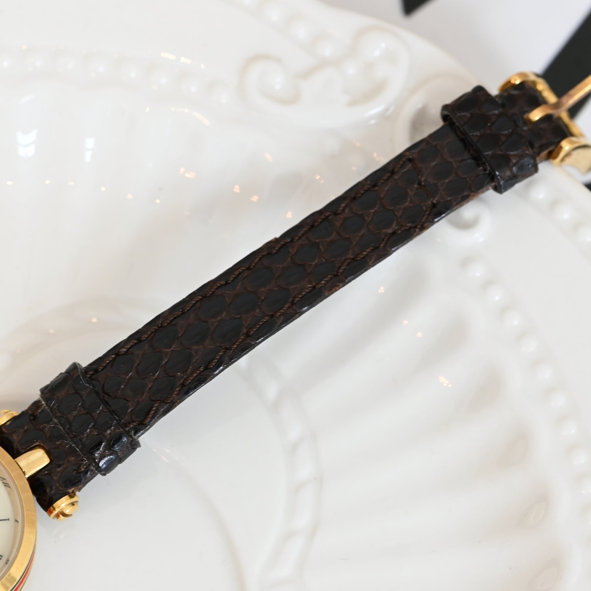Petite, elegant, and timeless - this gold case paired with the green-red enamel ring gives it that instantly recognizable Gucci signature without being loud. It wears like a piece of jewelry — perfect for everyday elegance or vintage styling.