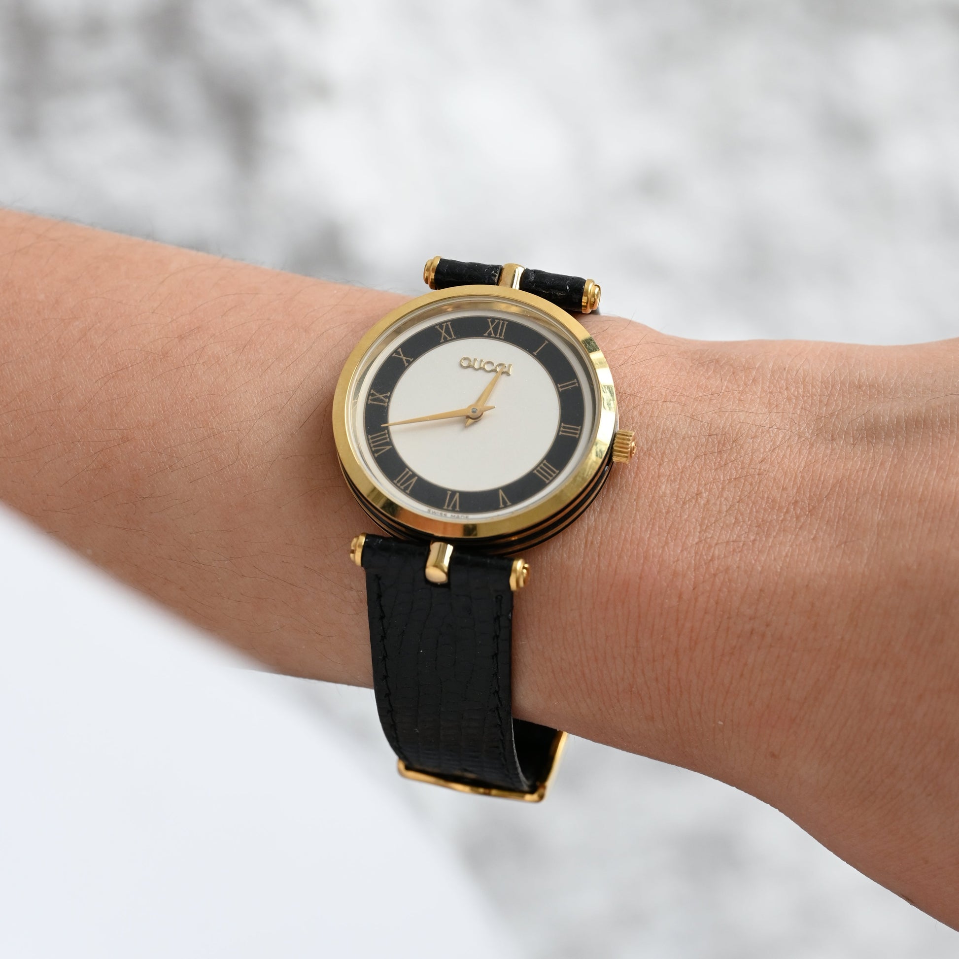 This version of the Gucci 2000L has a bolder, more eye-catching vibe with its sharp contrast between the black enamel ring and gold case. It gives off that effortless kind of luxury — polished but not trying too hard. The design blends timeless femininity with that signature 90s Gucci attitude — sleek, minimal, and quietly chic.