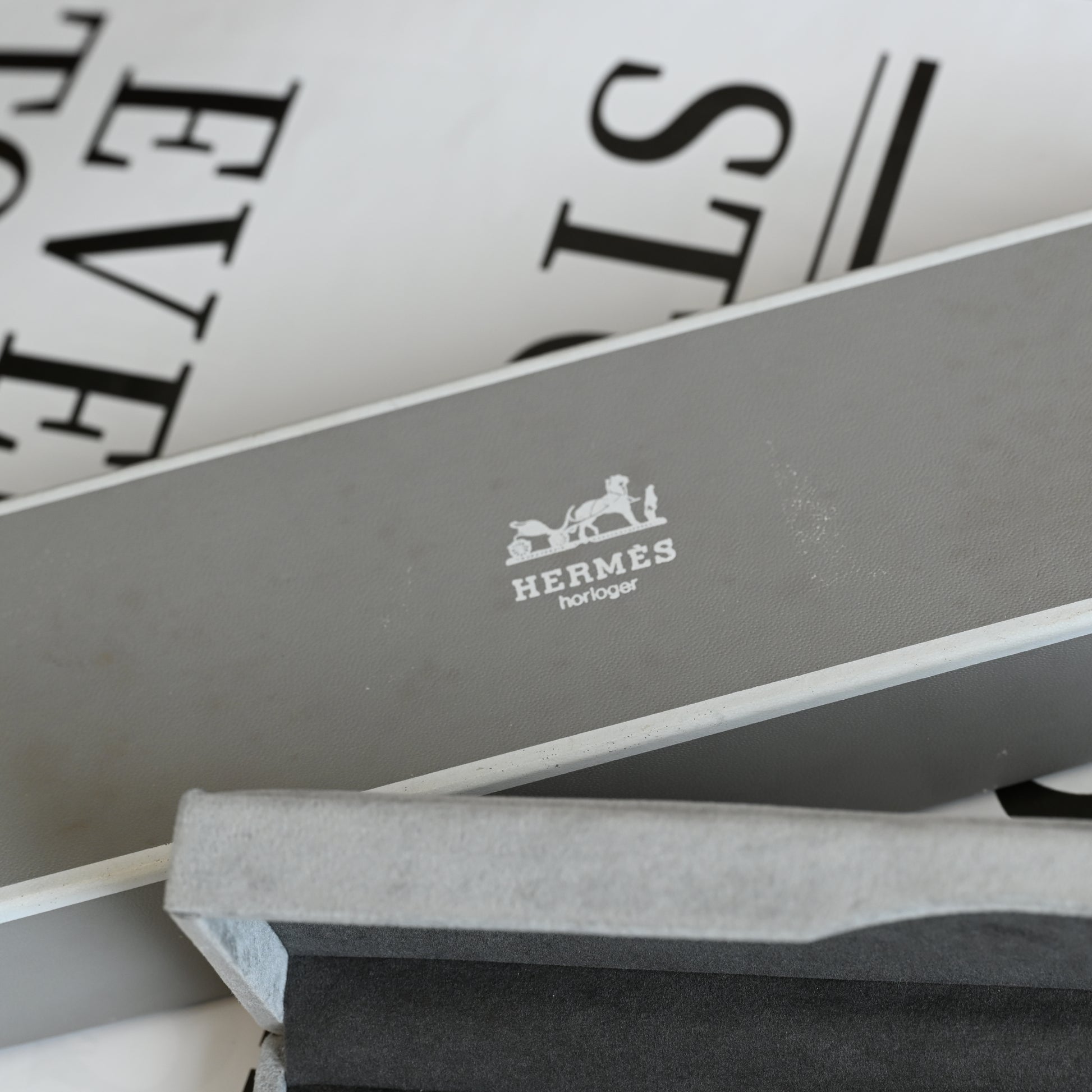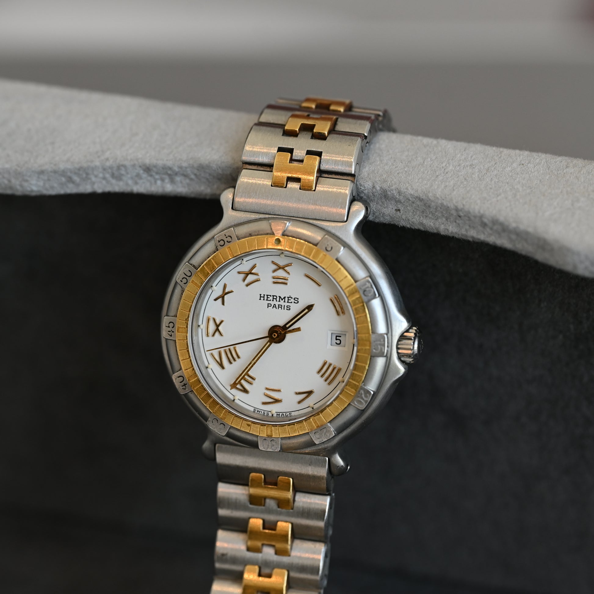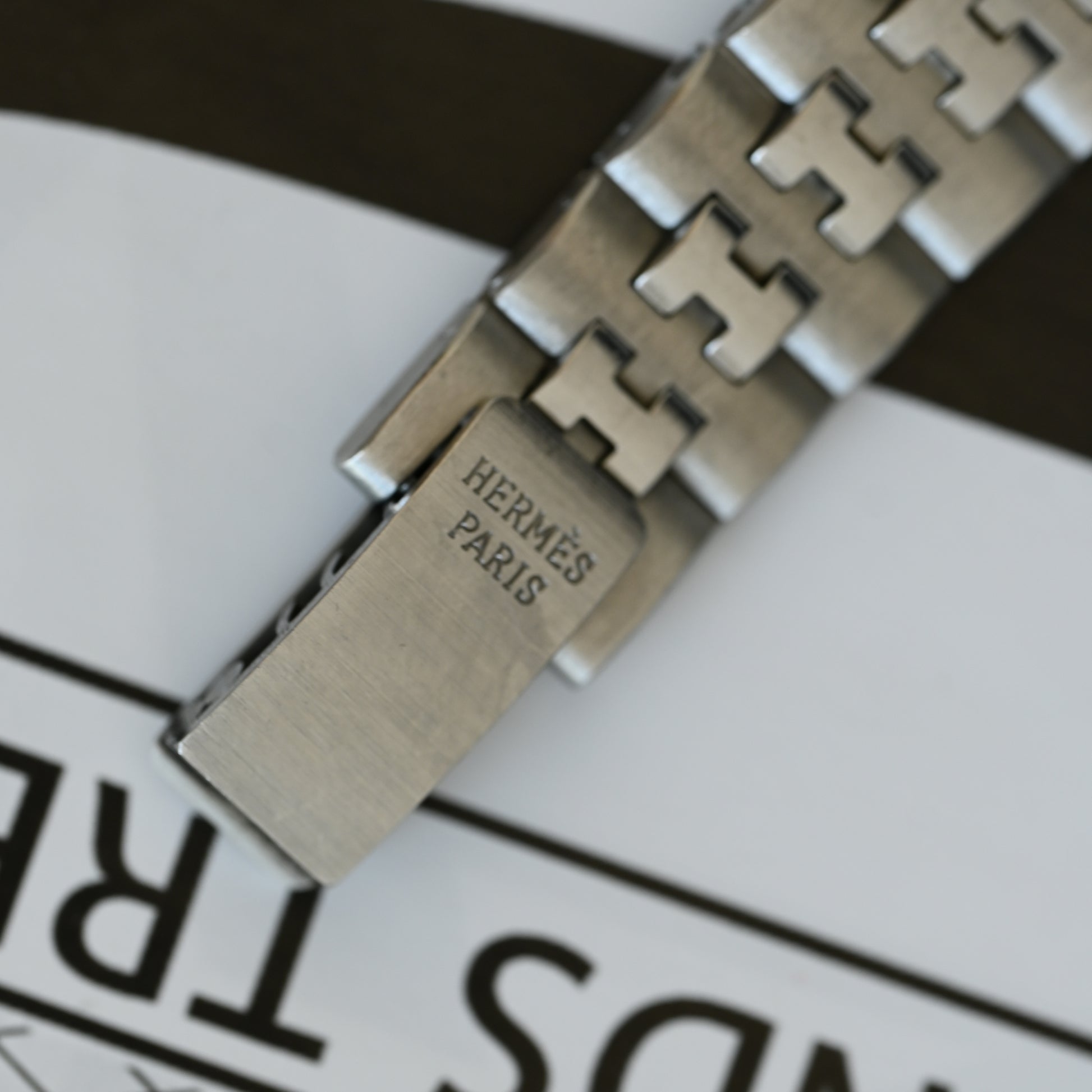 Who knew a bracelet could multitask as jewelry and timekeeper? Hermès did. With a bold mix of silver steel and gold accents, this Hermès beauty wraps your wrist in timeless flair. Roman numerals dance around the dial speak playfully.