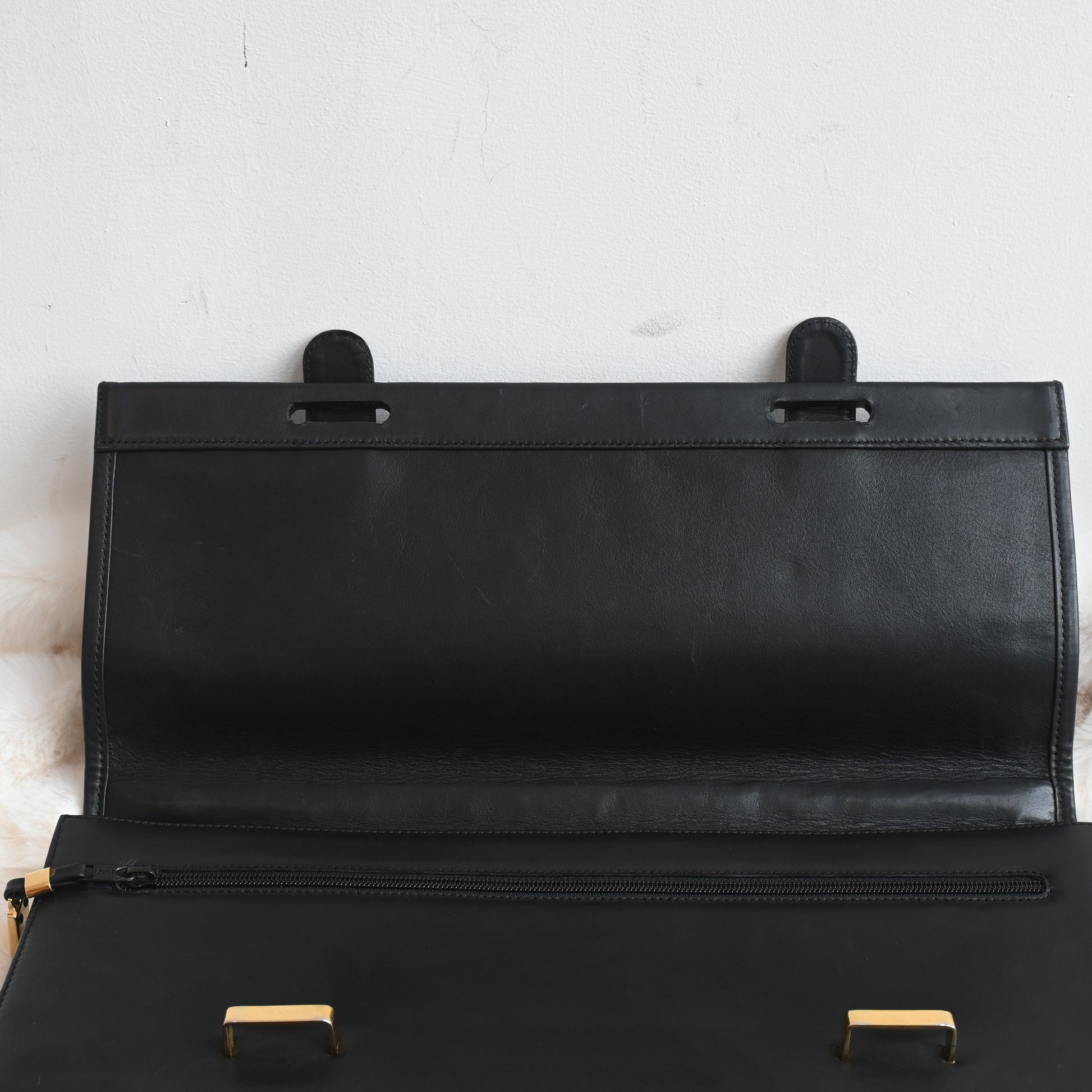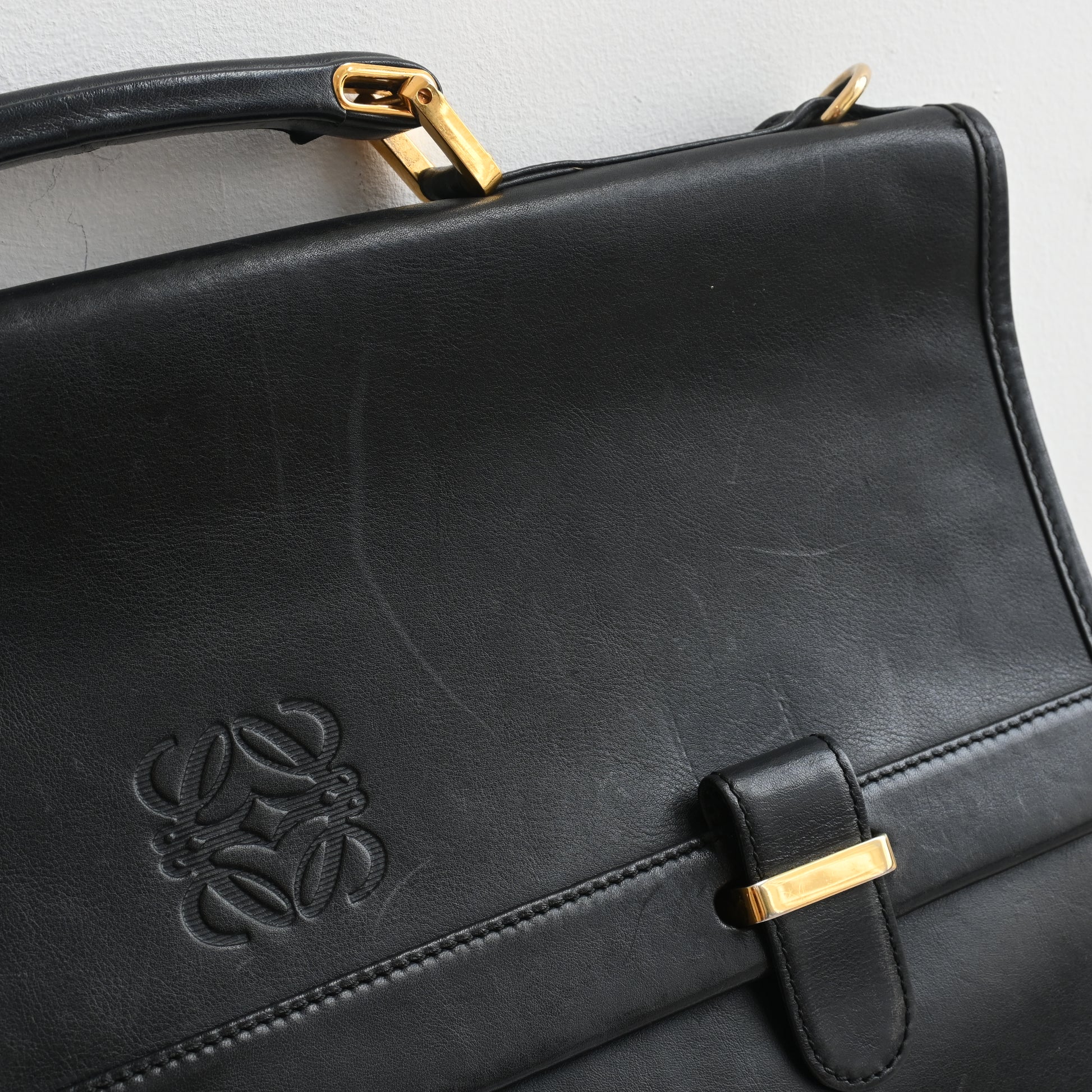 The definition of executive chic. This structured vintage Loewe black leather briefcase features signature gold-tone hardware. It offers the sophisticated Anagram detailing you love, plus the practical space required for your 16" laptop and daily documents.