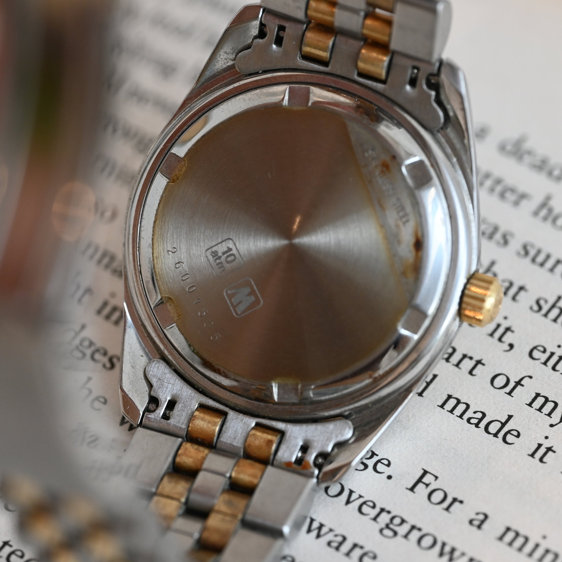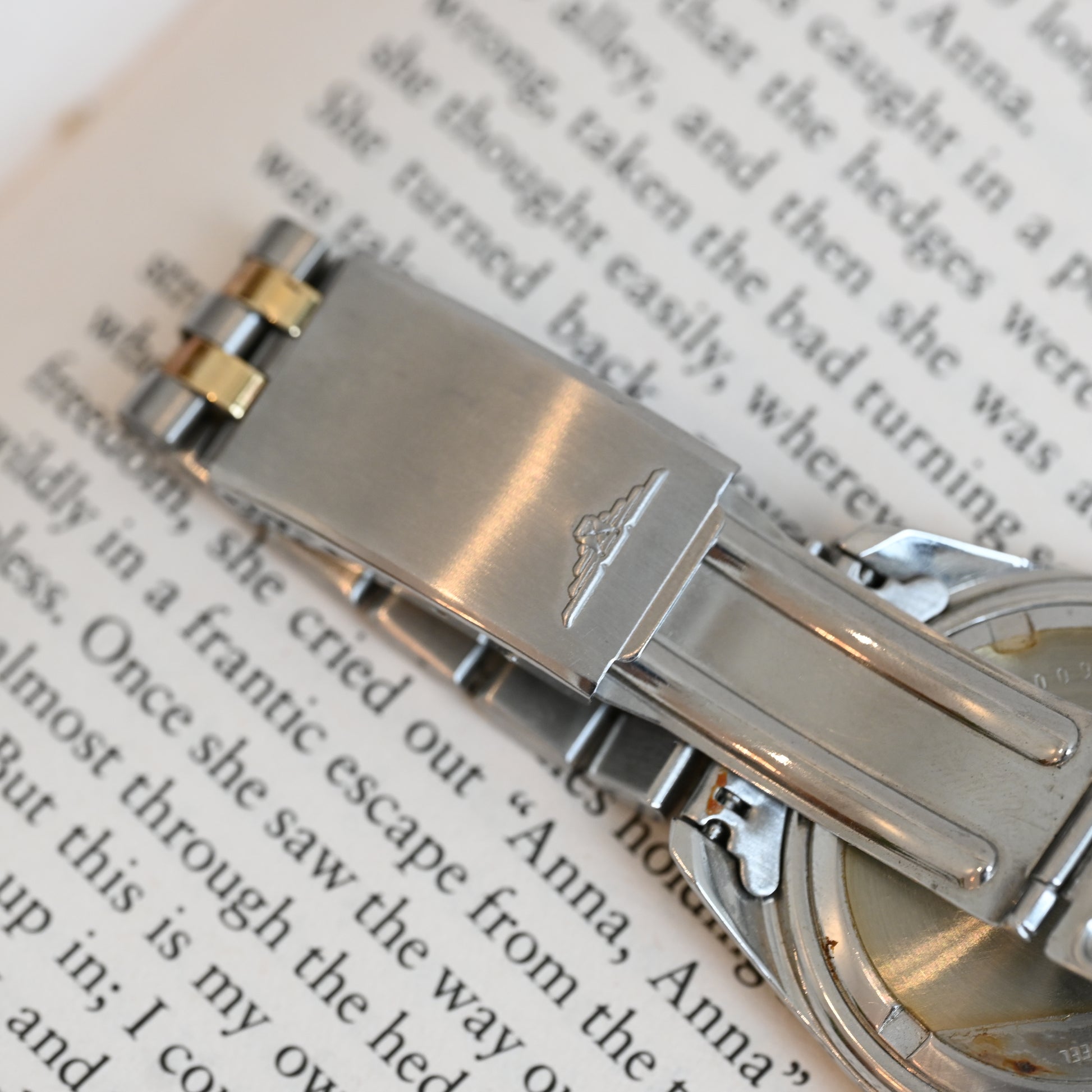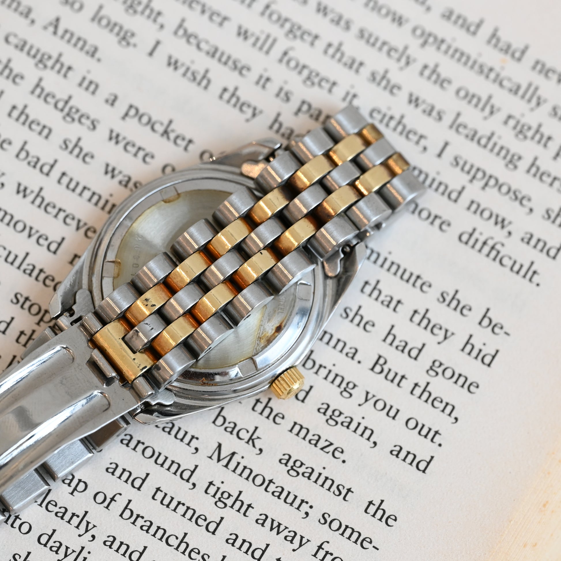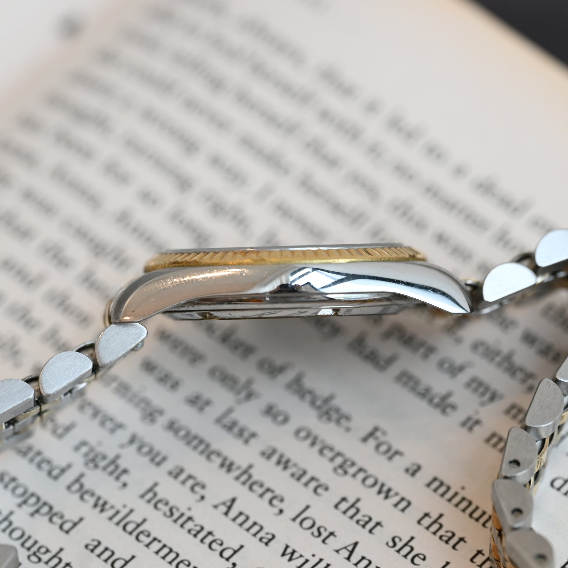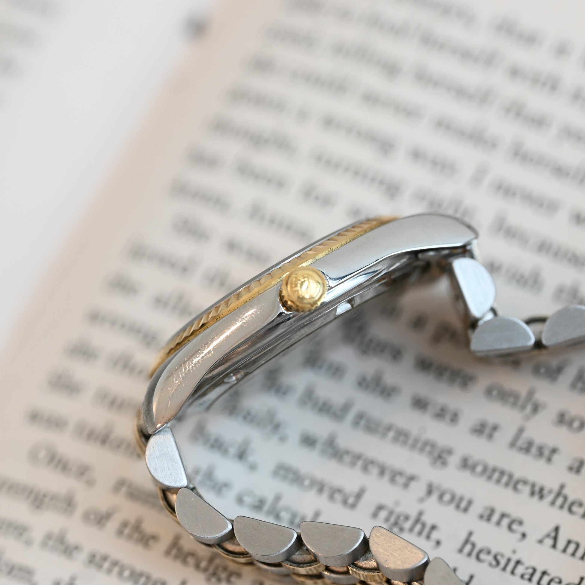 The fluted bezel and two-tone aesthetic give it a refined, dressy feel — reminiscent of more iconic “datejust”-style watches, but with a Longines twist. It is somewhat uncommon vintage model that originated from the 1970s, running in Quartz.