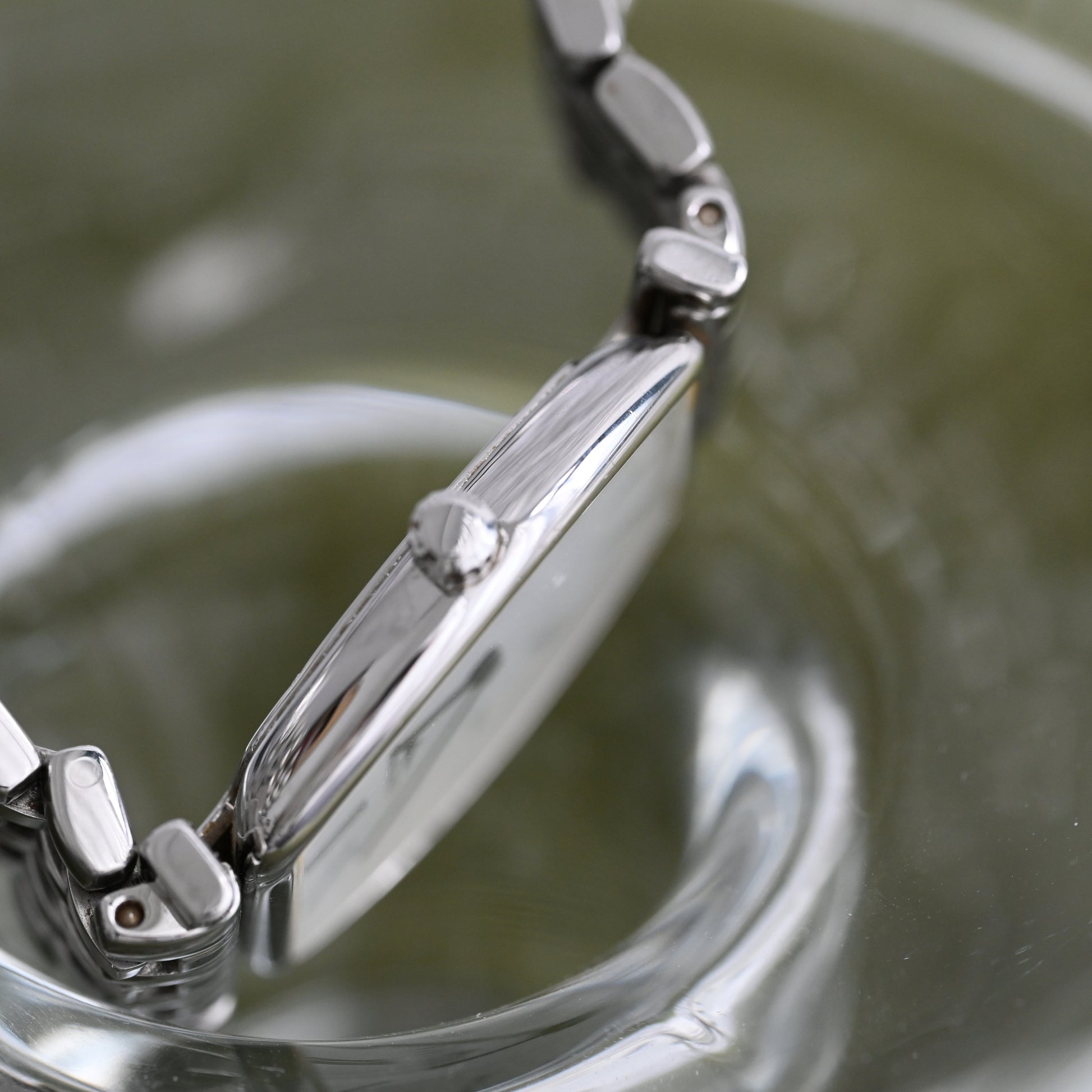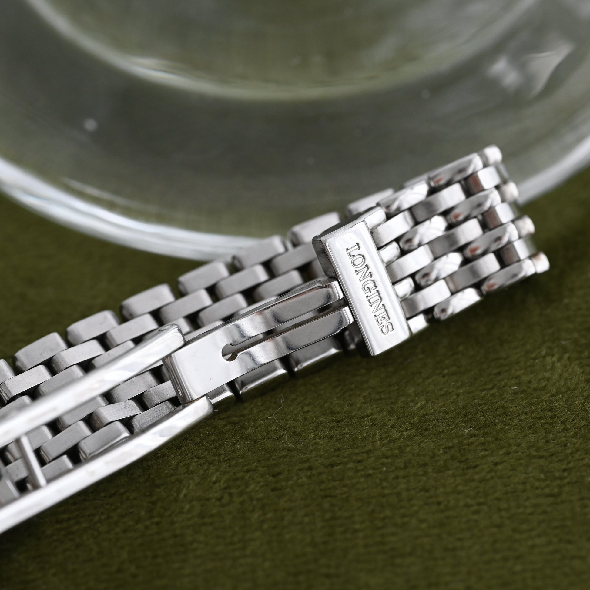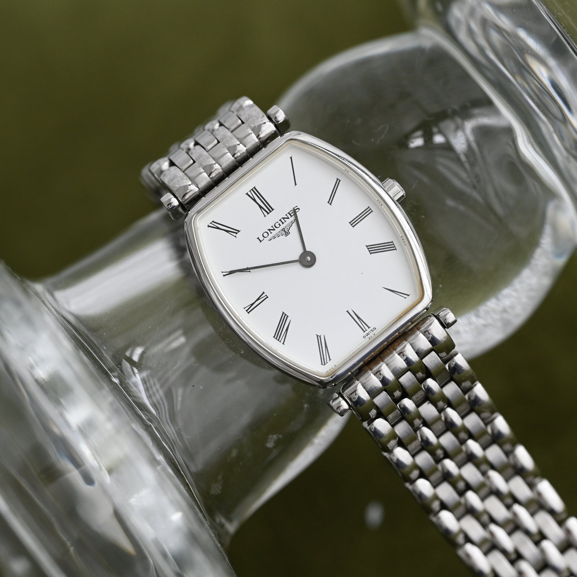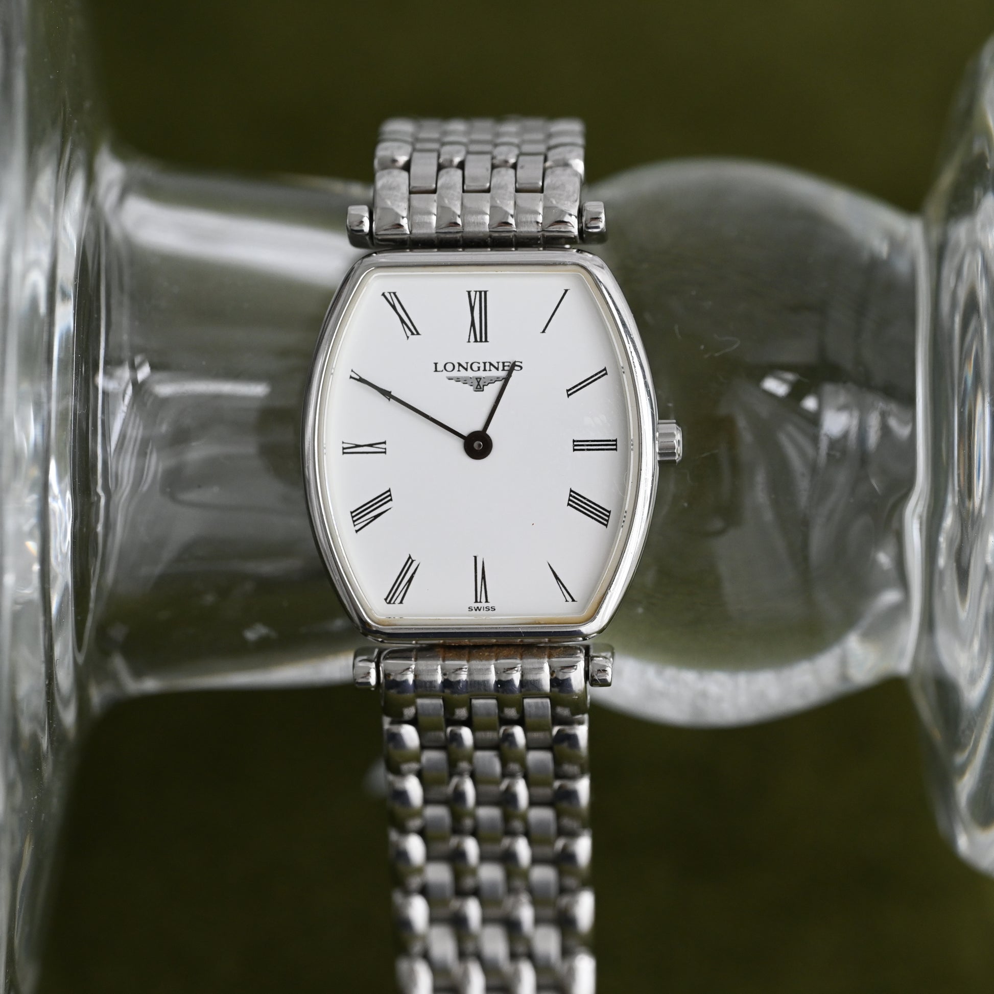 This Longines timepiece blends vintage grace with modern simplicity — featuring a clean white dial, slender Roman numerals, and a refined tonneau-shaped case. Paired with a classic multi-link bracelet, it’s a study in understated elegance that effortlessly elevates any wrist.