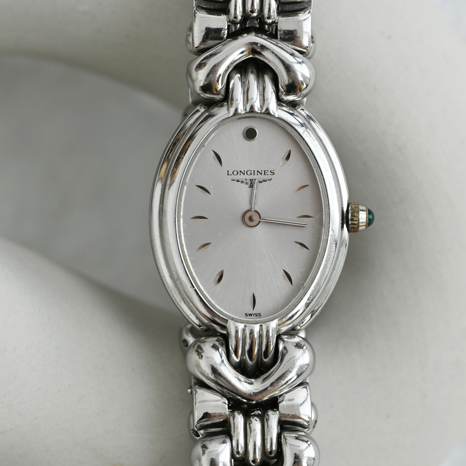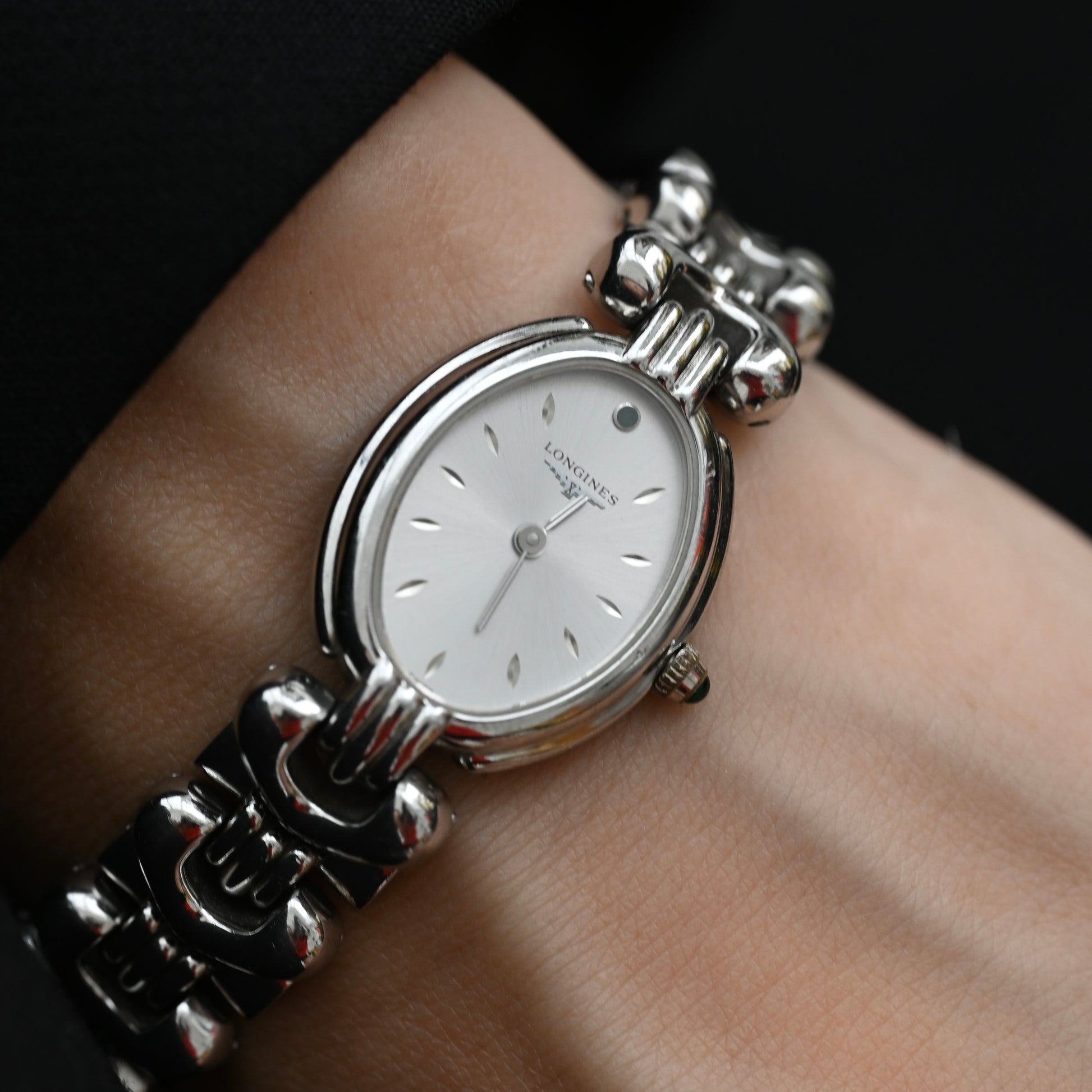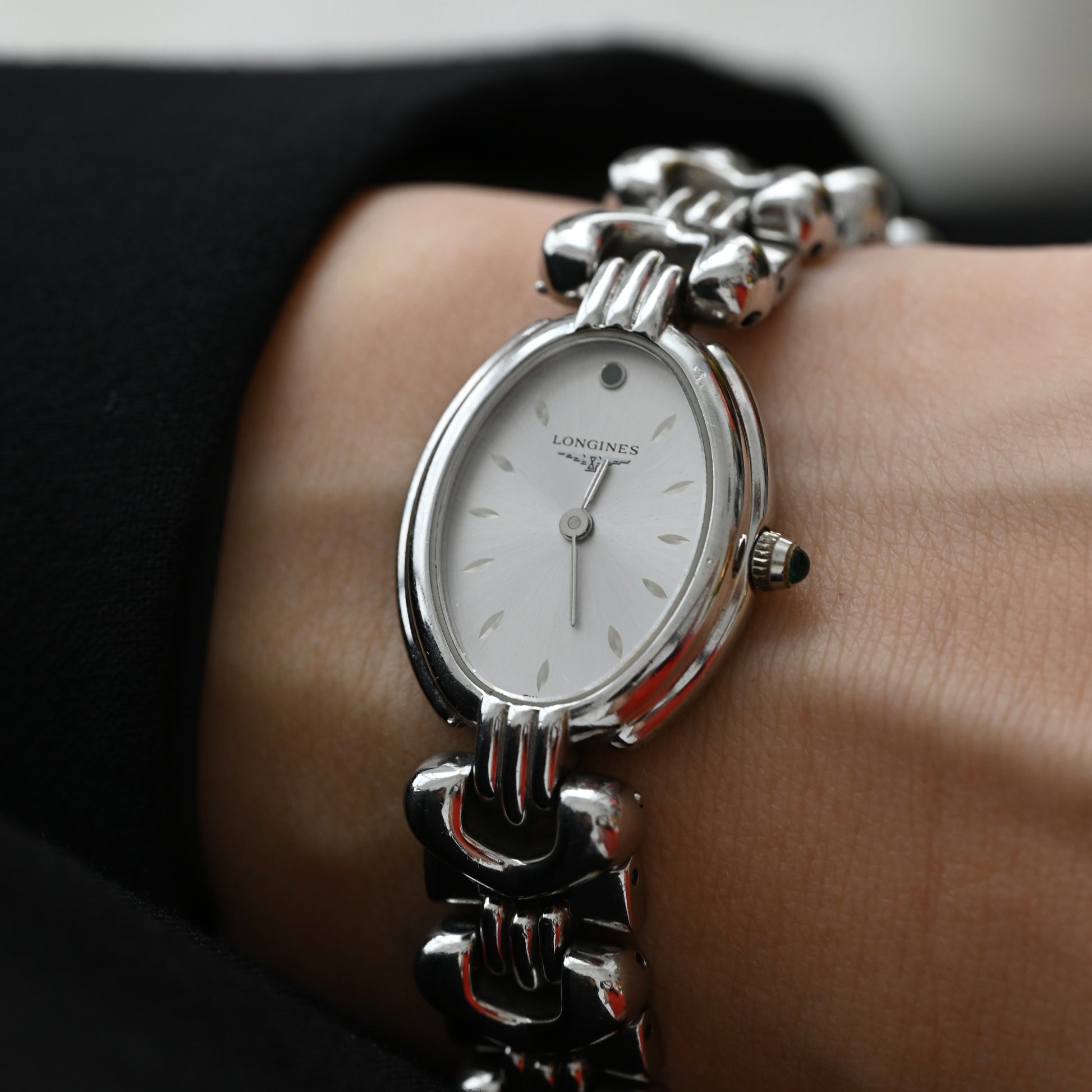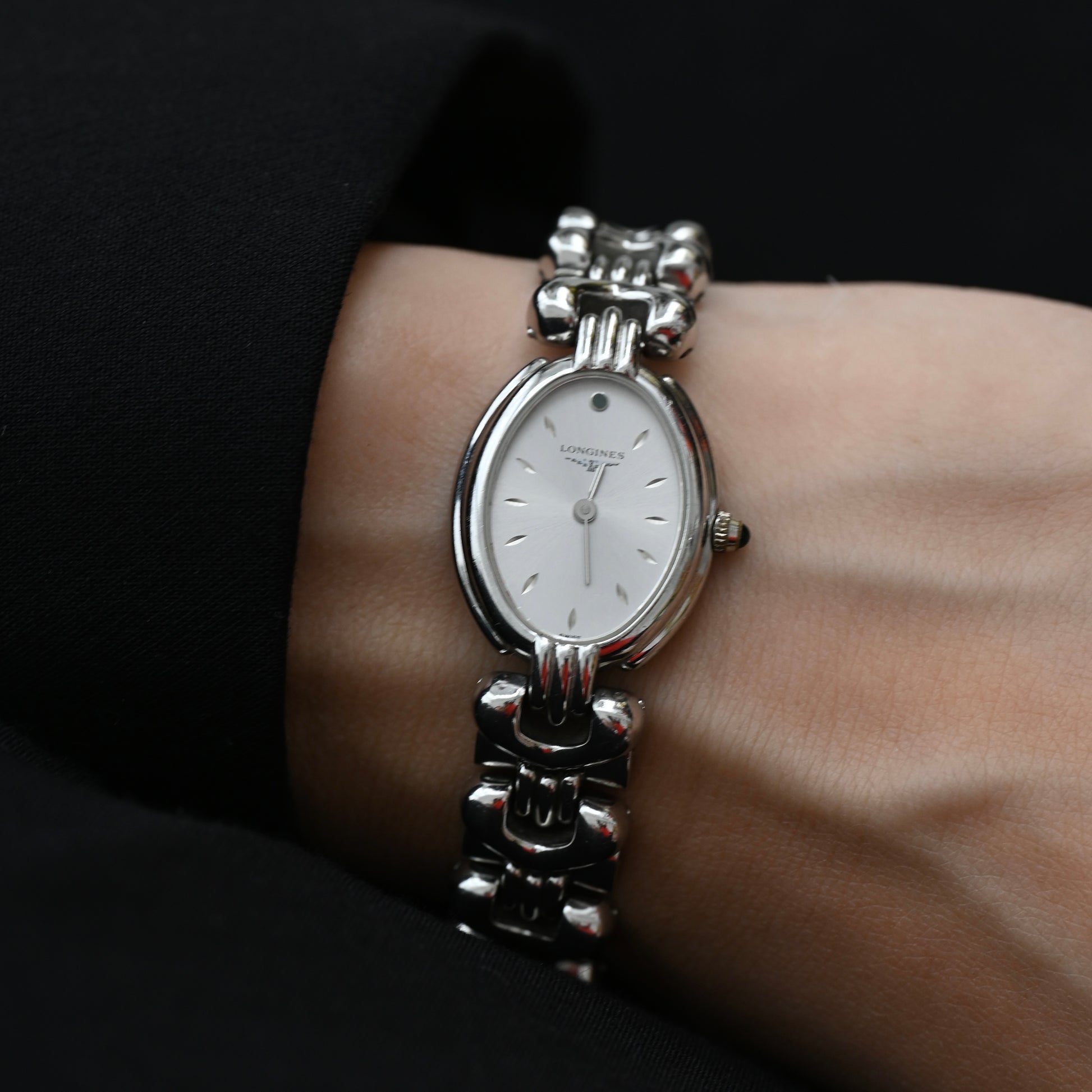 Time dances across a silken sunburst dial, kissed by water drop indices that glisten like morning dew. Encased in an oval mirror of polished steel, this Longines timepiece is not worn — it is witnessed. A sculpture of grace on your wrist, where every second shimmers with quiet power.