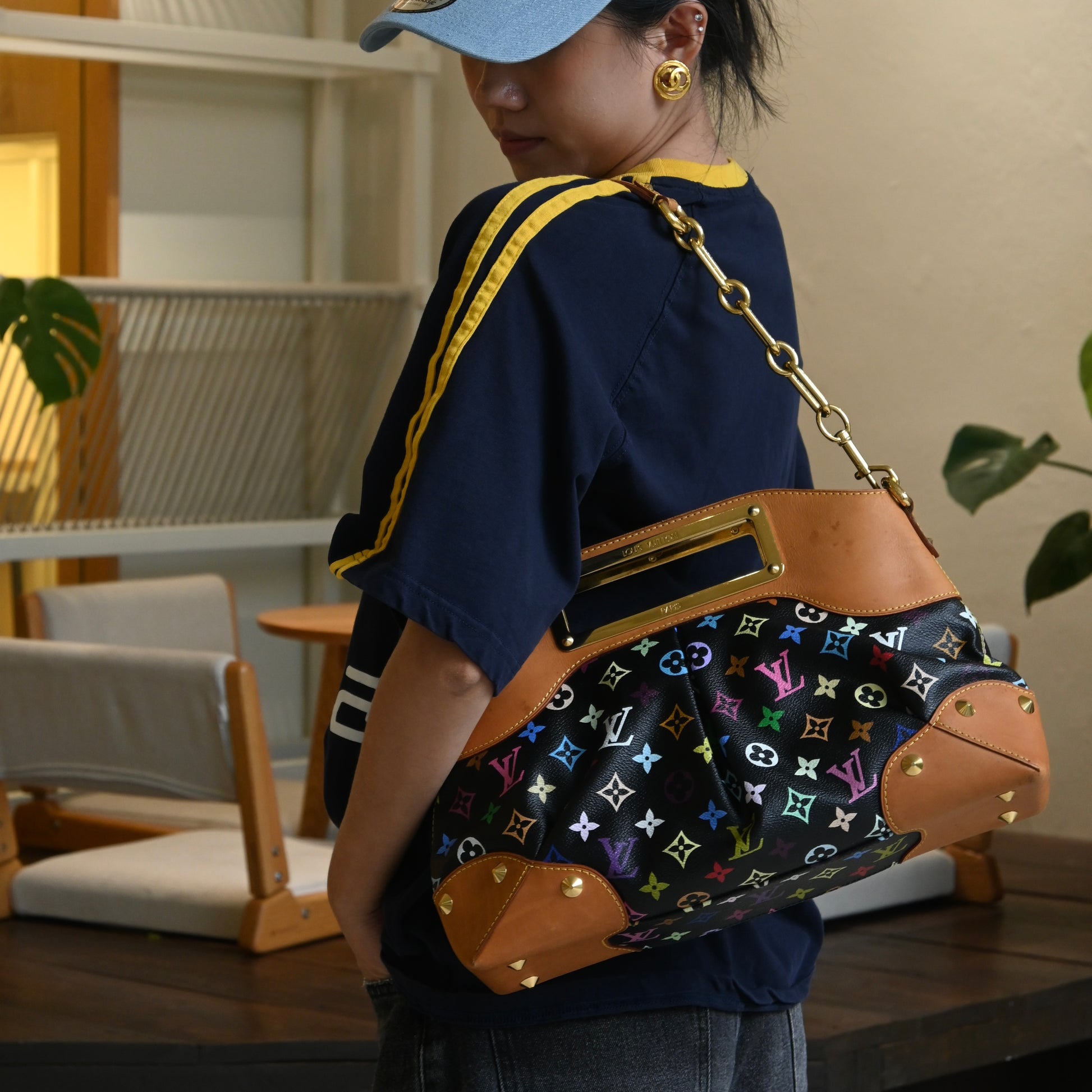 The Judy MM is where artistry meets architecture. Its bold gold-tone cut-out handle is more jewel than hardware — a gleaming frame that elevates the playful Murakami multicolour canvas. Add the detachable leather strap, and you’ve got two looks in one: a glamorous hand-held statement or an easy, chic shoulder companion.
