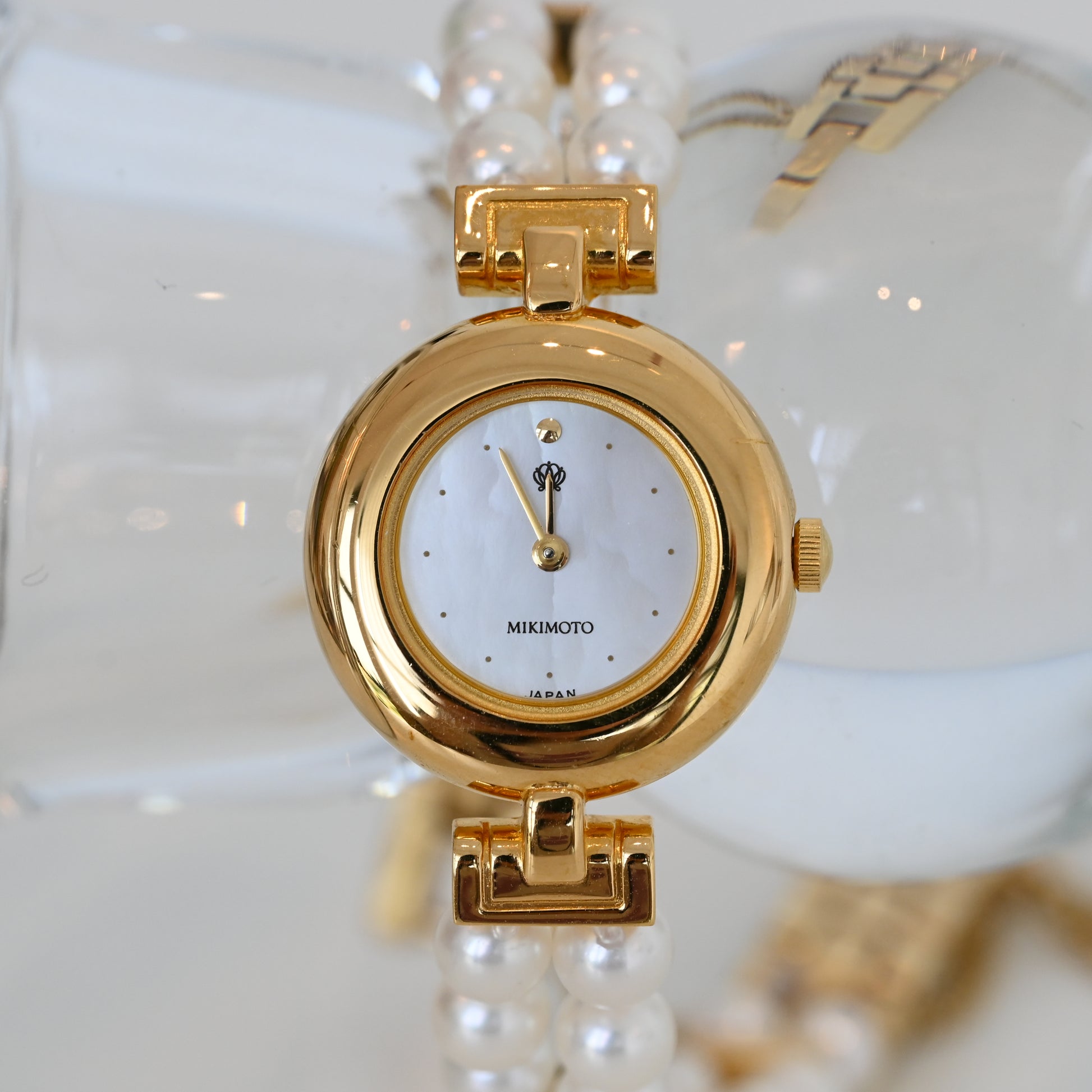The watch features a delicate round case finished in gold tone and a soft mother-of-pearl dial that reflects light beautifully. Its most distinctive feature is the double-strand pearl bracelet, which gives the watch the look and feel of a refined jewelry bracelet rather than a typical wristwatch. Inside, it runs on a reliable quartz movement, offering both precision and easy maintenance.