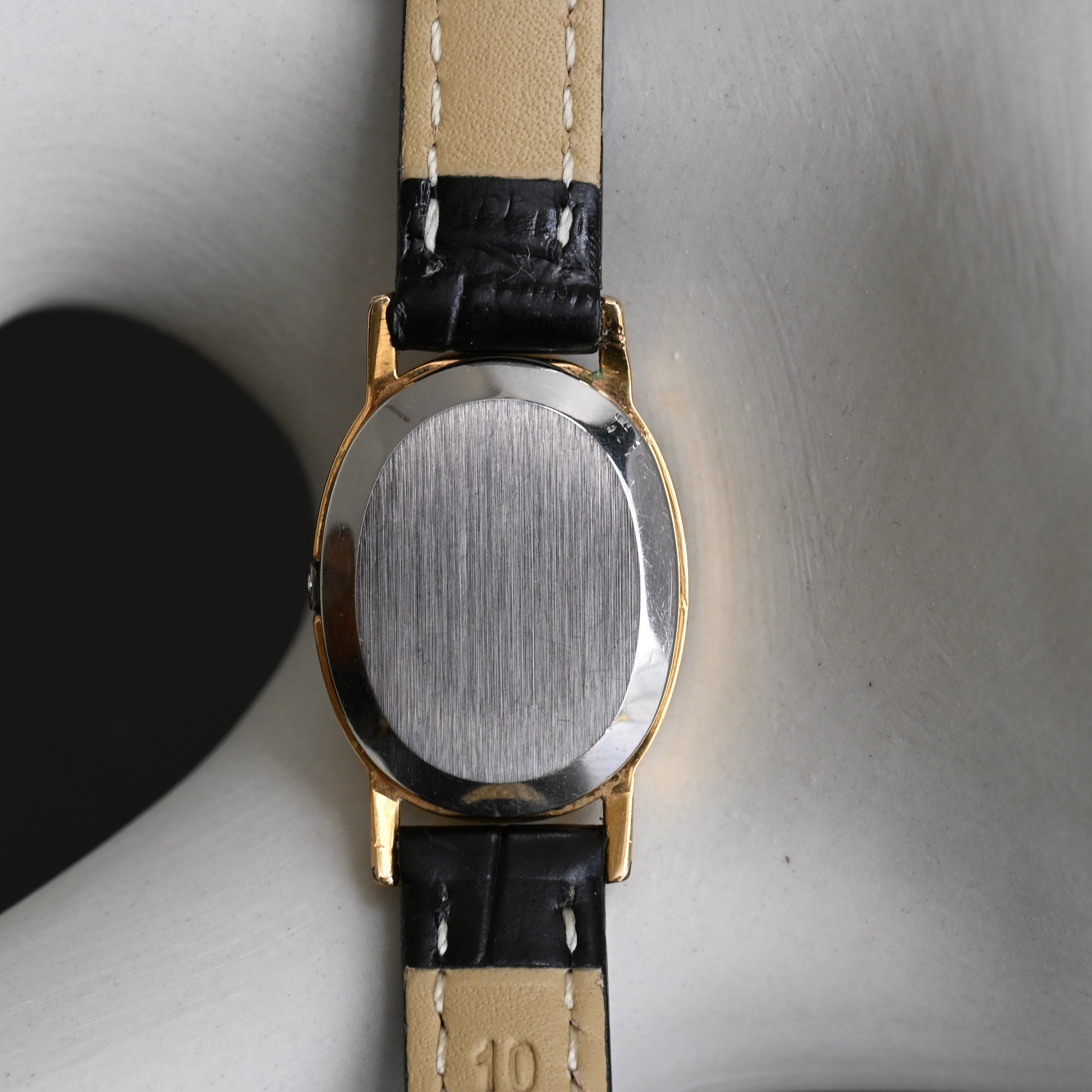 Sleek, Subtle, Iconic — The golden oval dial of this Omega De Ville Quartz radiates understated elegance. With minimalist baton hour markers and a warm champagne hue.