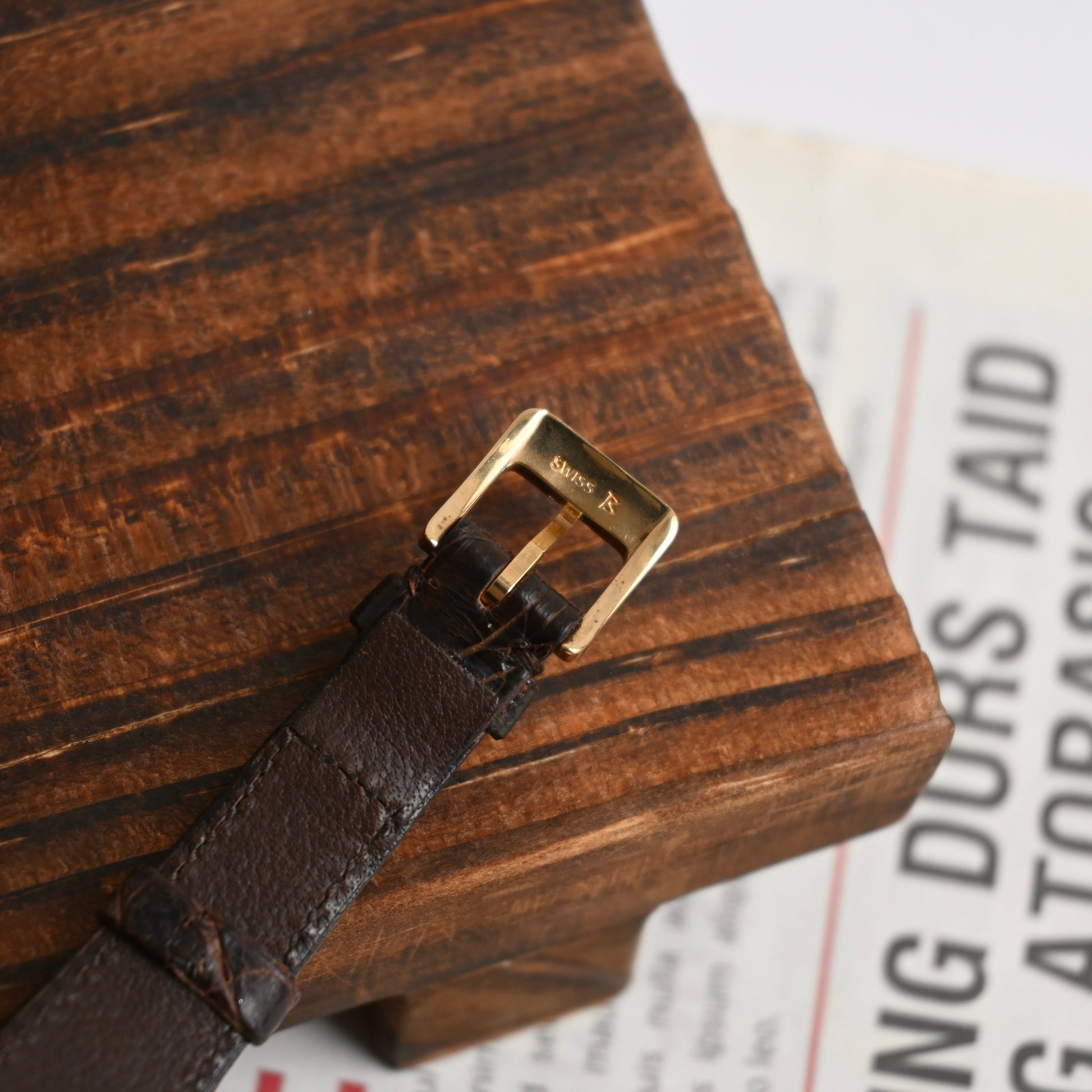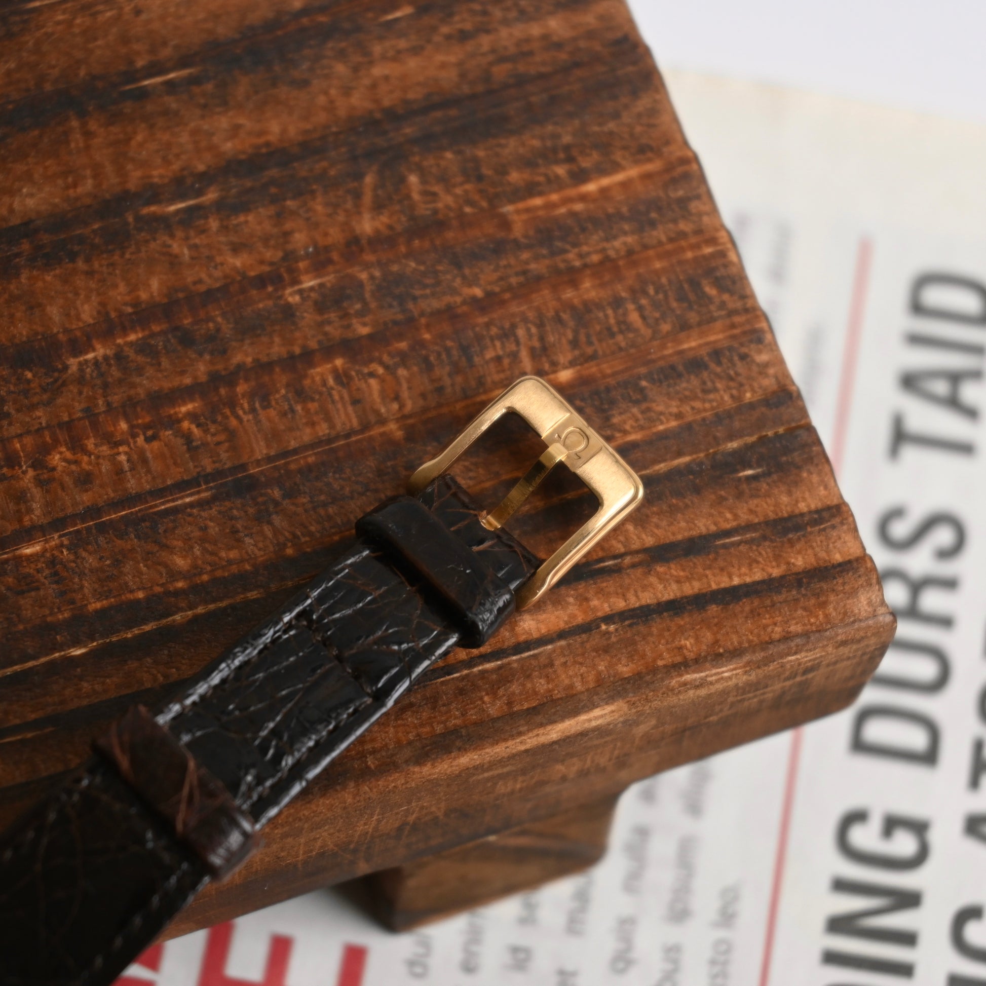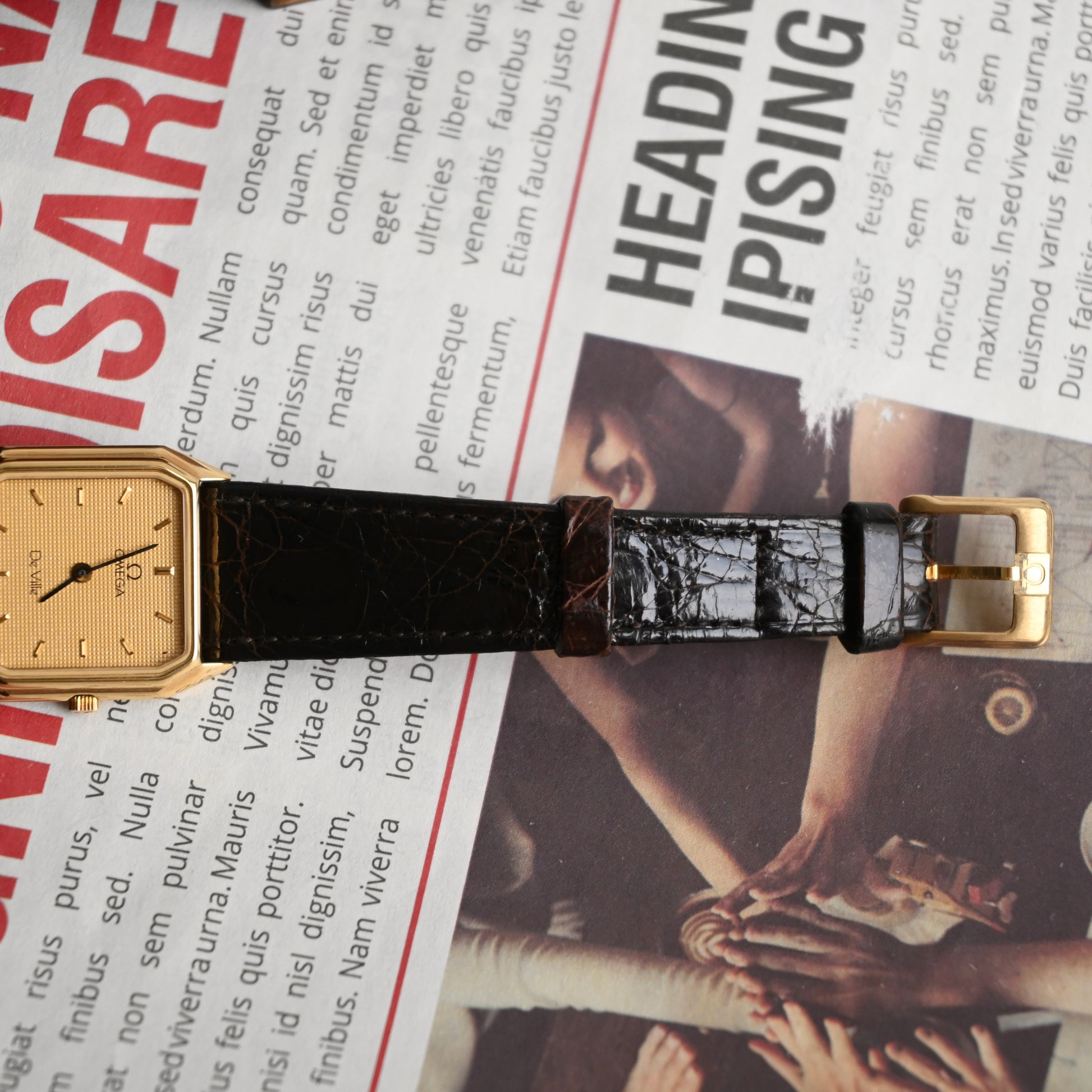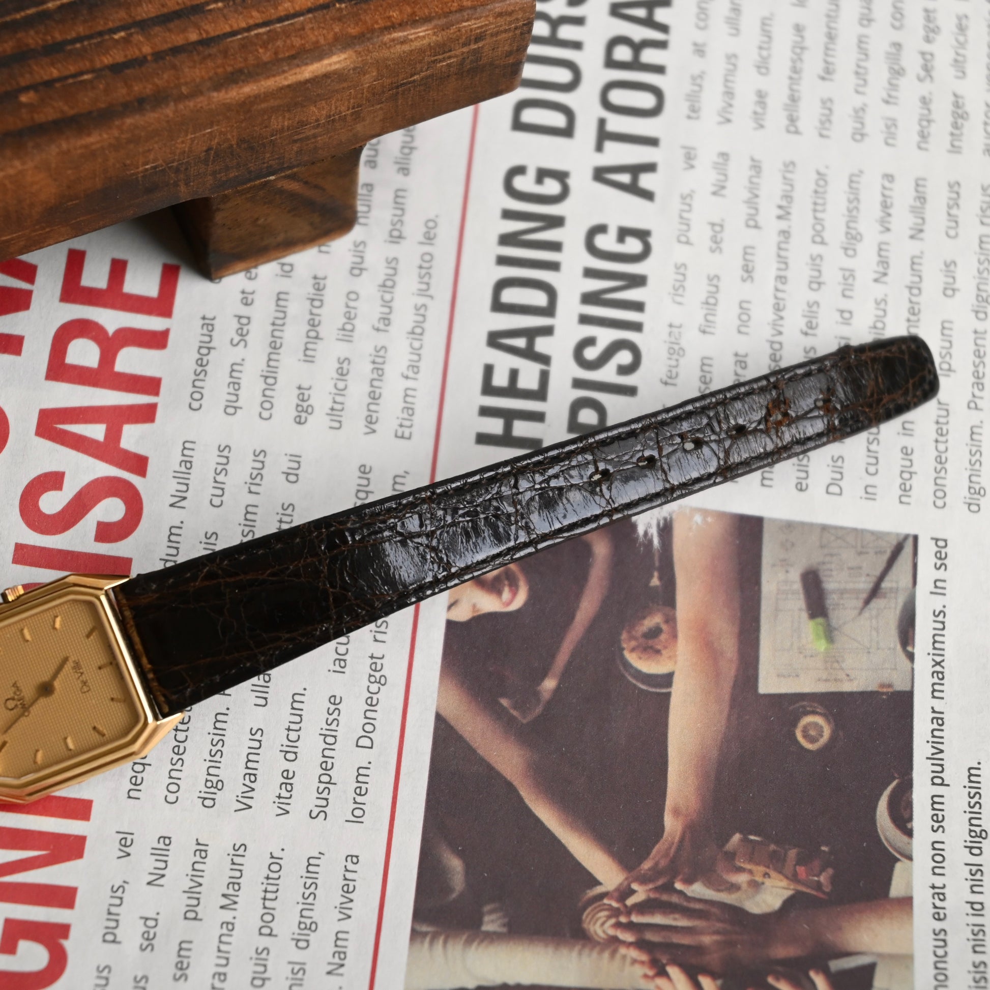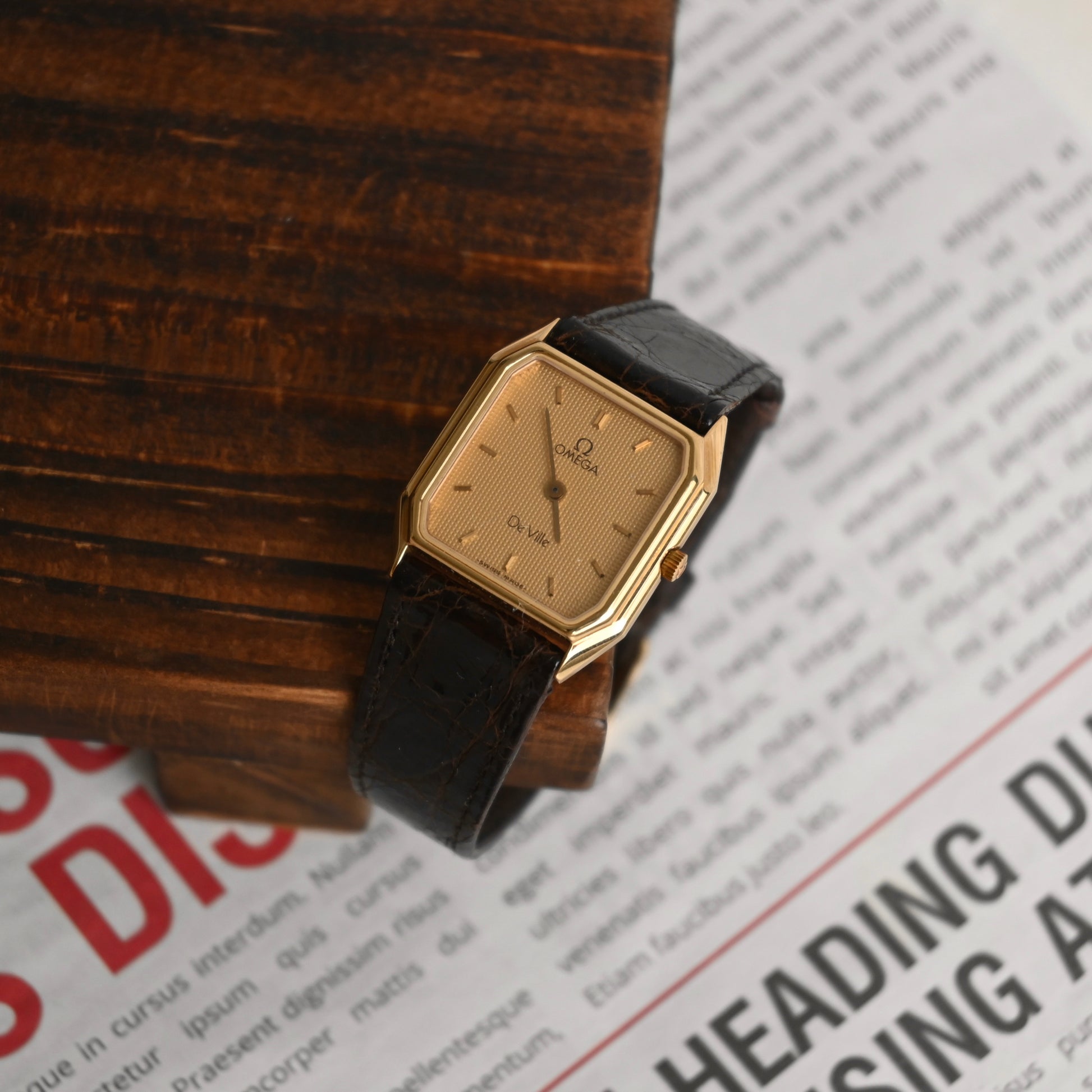 Omega De Ville, dressed in stepped octagonal gold bezel and finished with a deep black leather strap. Its Clous de Paris (also known as “hobnail”) textured dial adds a layer of refinement — tiny pyramid-like details that catch the light and elevate every glance. Classic, but never boring.