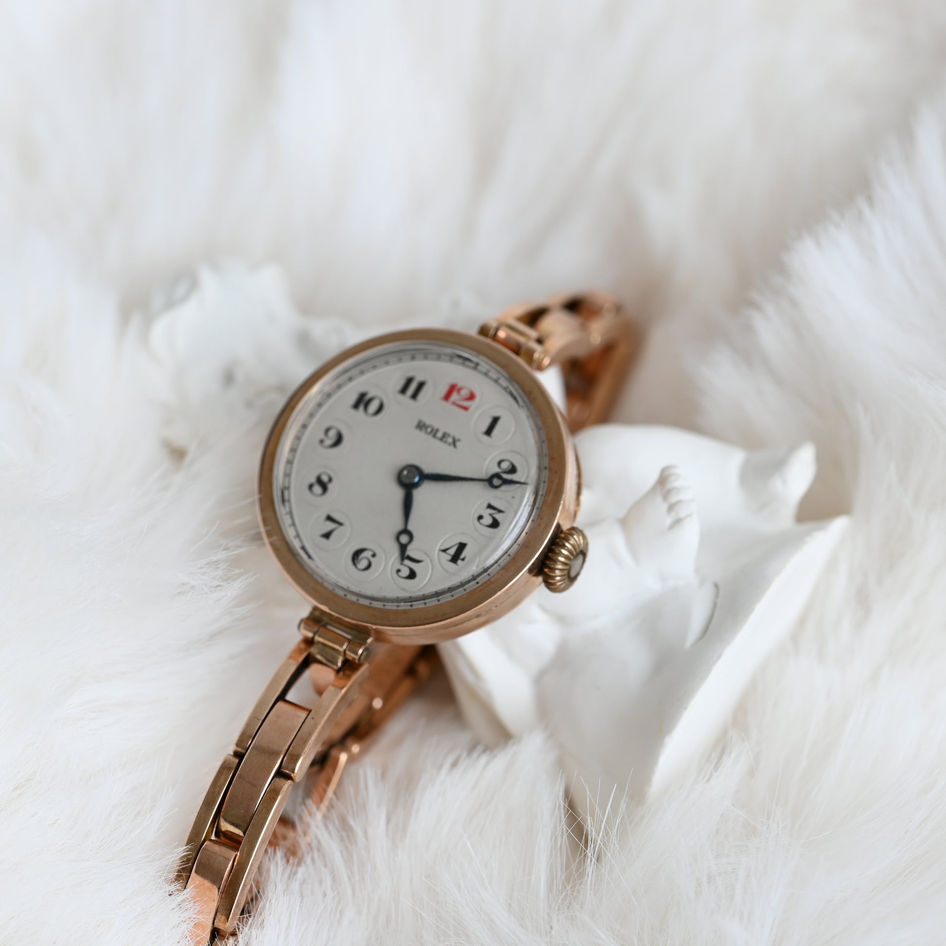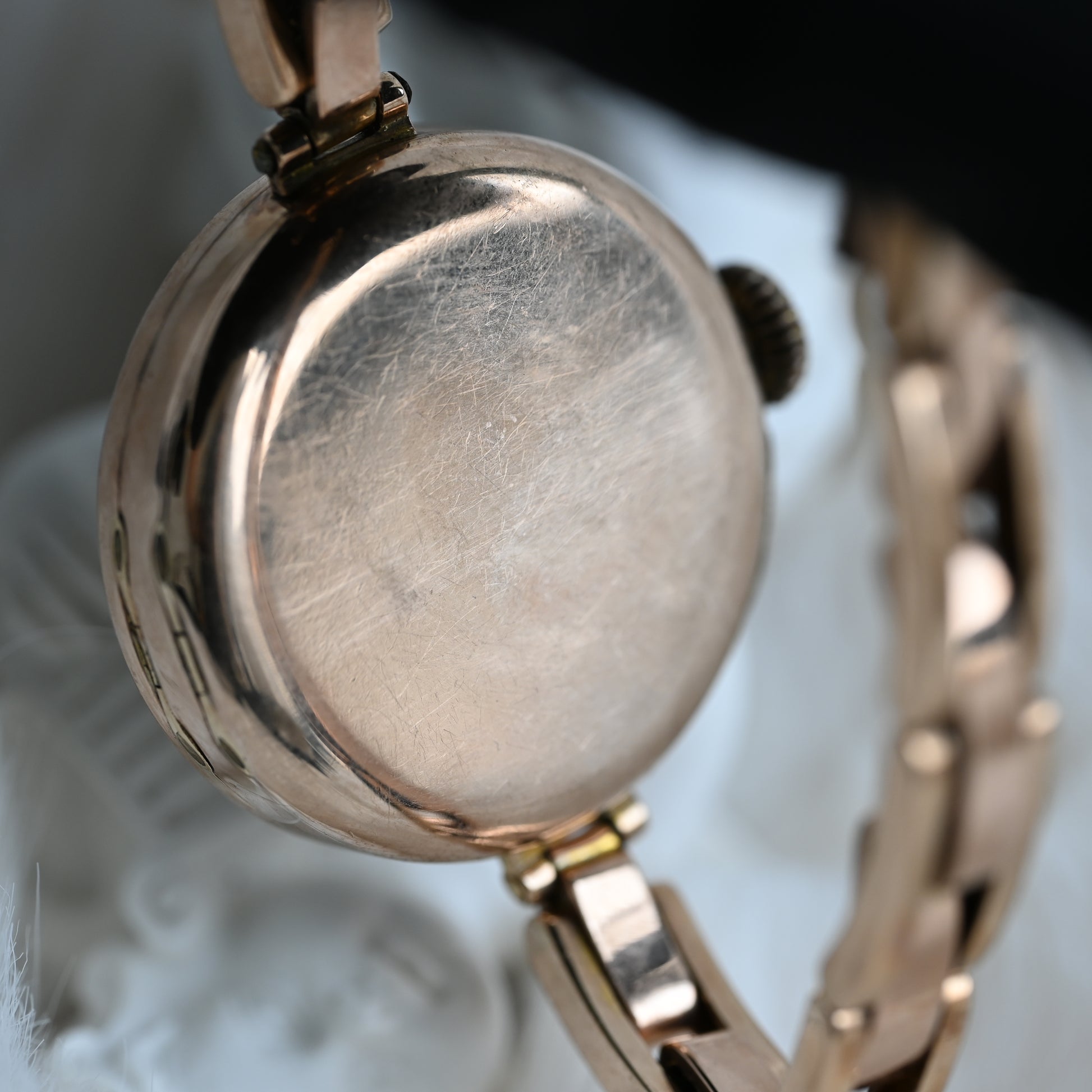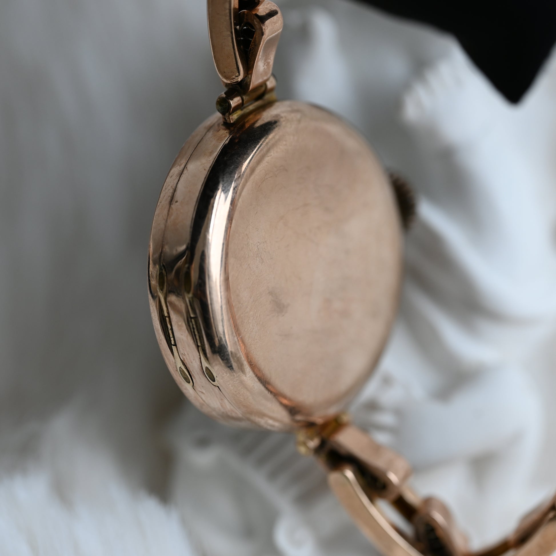 The Rolex ref. 24396/06 is a vintage watch with a 9K gold hunter case (hallmarked “375”) featuring a hinged cover to protect the dial. It comes with the rare Harrop Britannic bracelet, patented in 1906 and once marketed as “The Queen of Watch Bracelets” until its discontinuation decades ago.