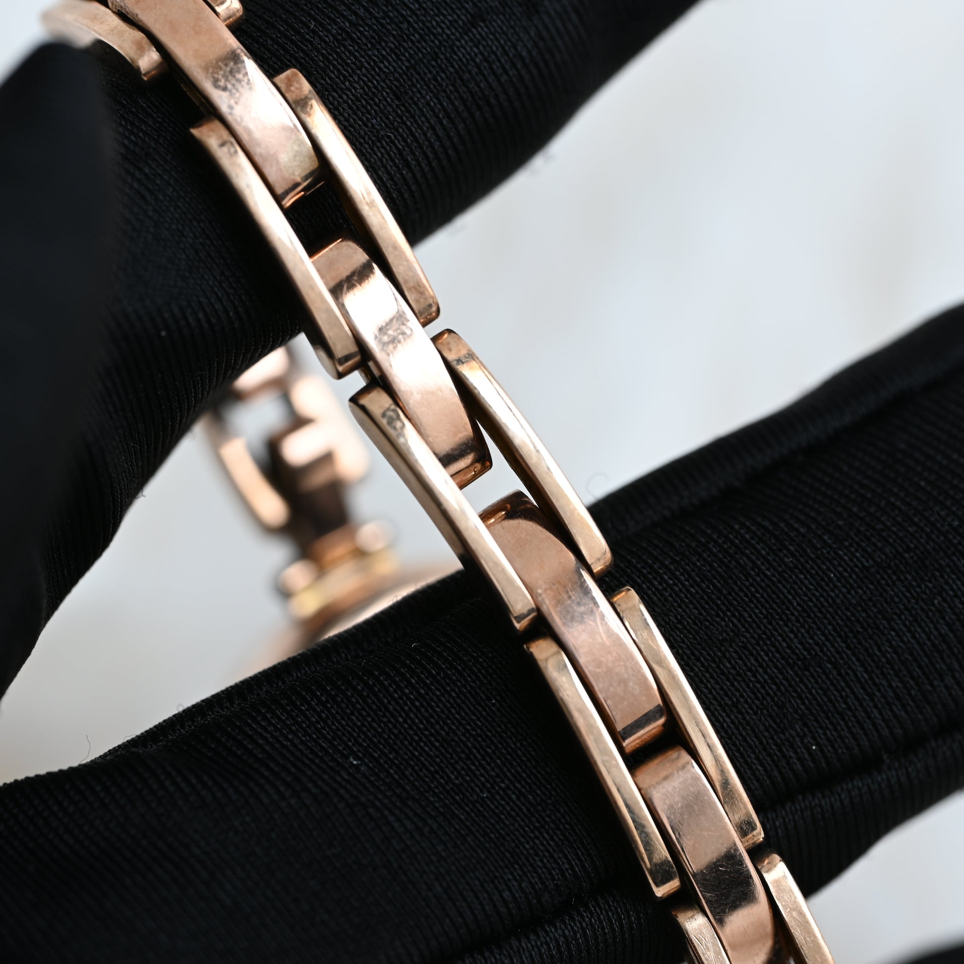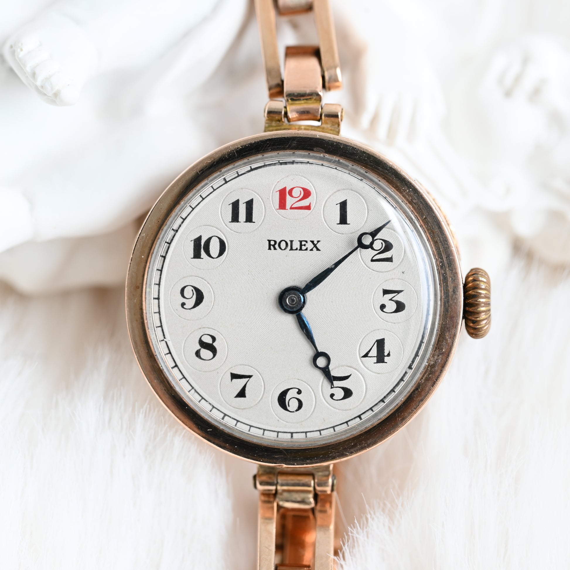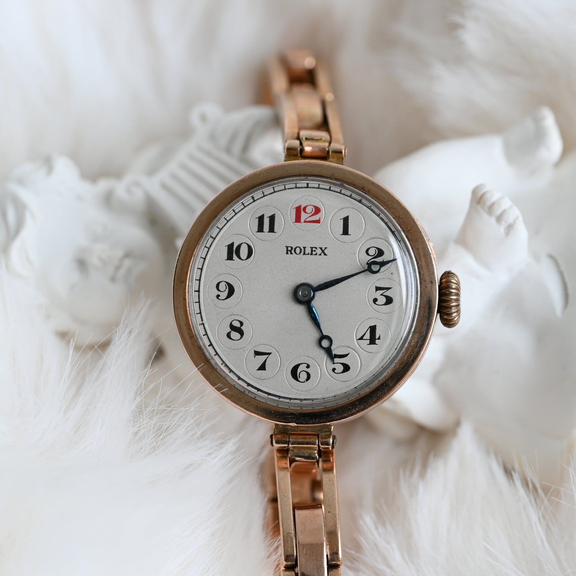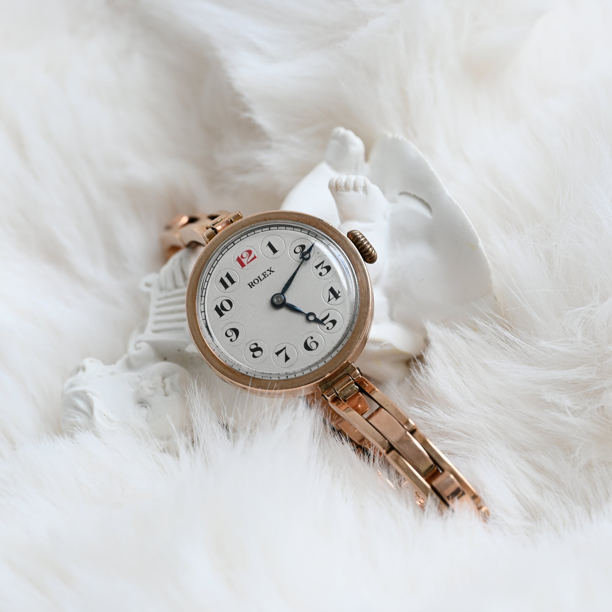 The Rolex ref. 24396/06 is a vintage watch with a 9K gold hunter case (hallmarked “375”) featuring a hinged cover to protect the dial. It comes with the rare Harrop Britannic bracelet, patented in 1906 and once marketed as “The Queen of Watch Bracelets” until its discontinuation decades ago.