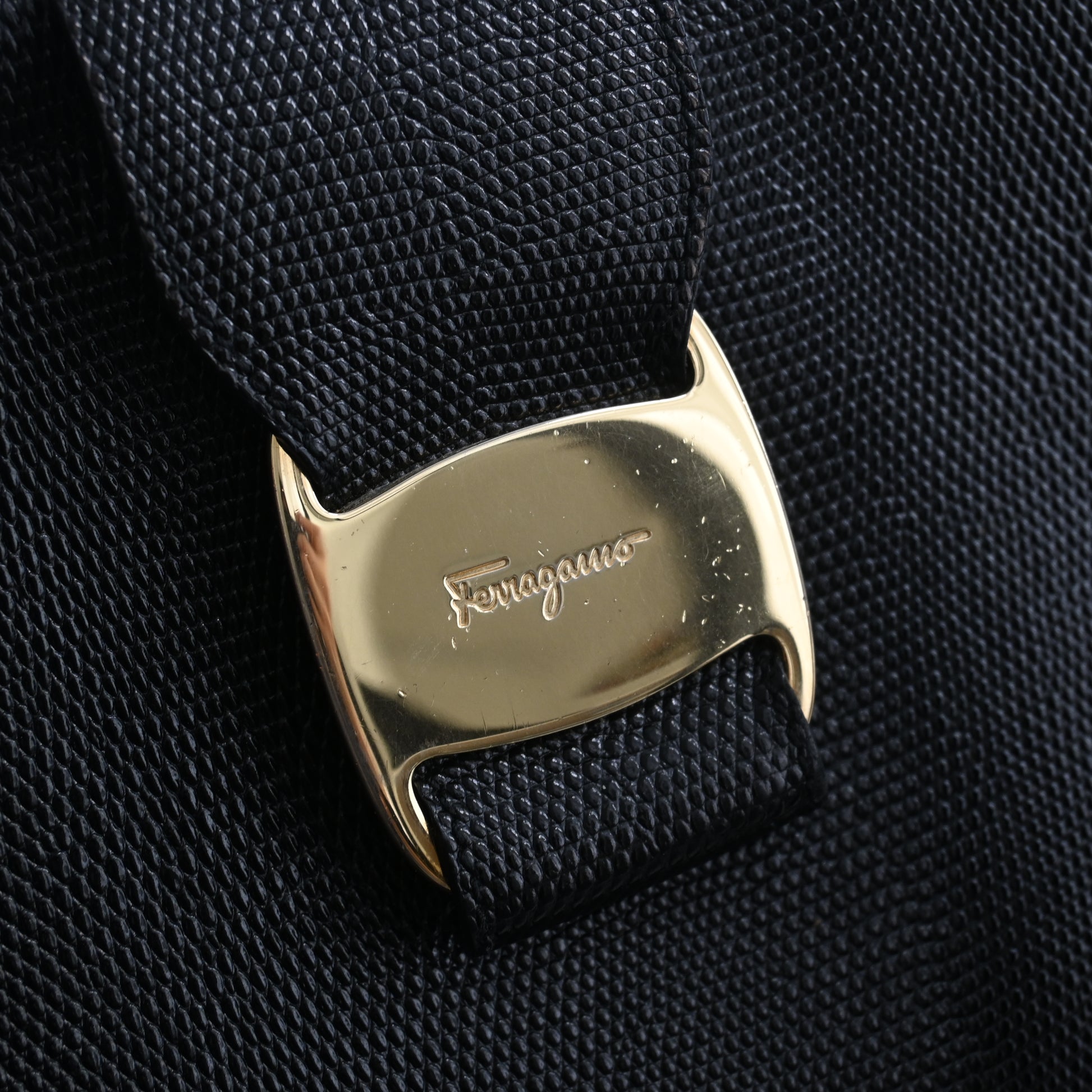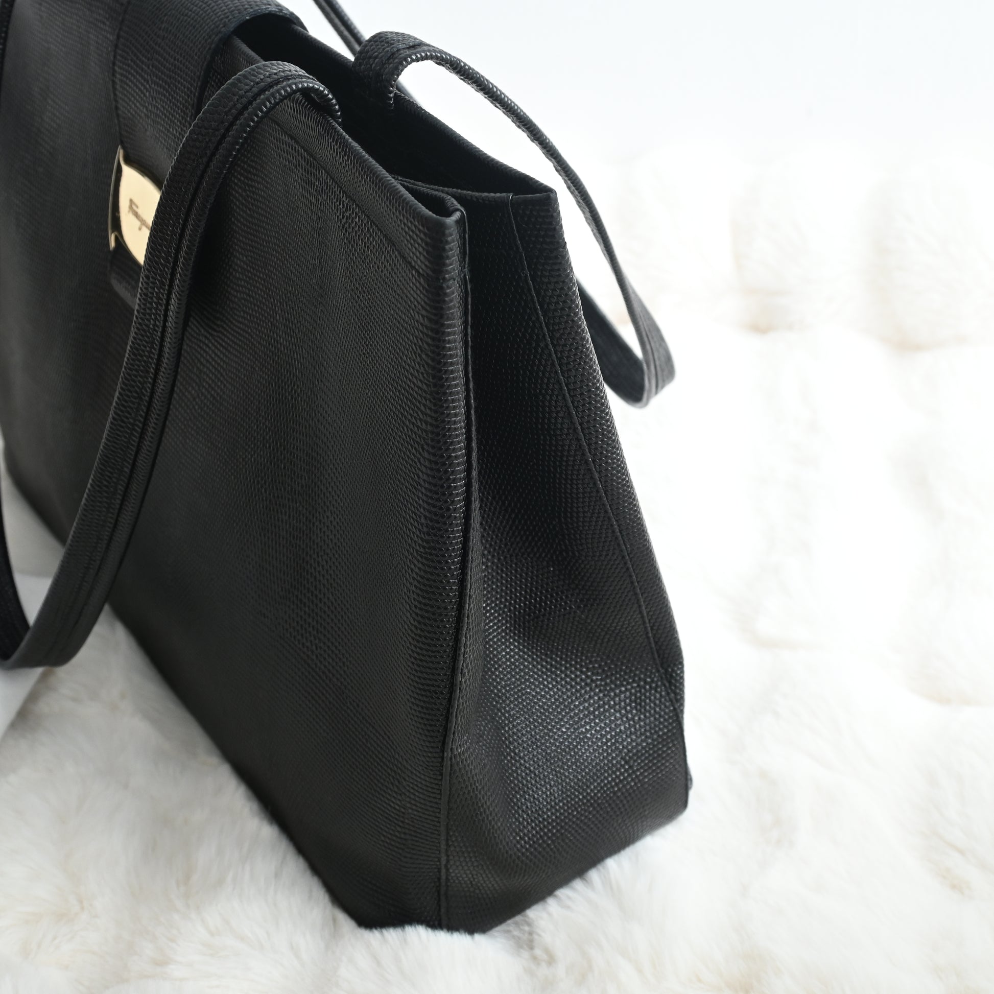 Ferragamo finesse: embossed lizard leather, the timeless Vara bow, and a shoulder strap that carries vintage glamour with ease. Structured in shape, rich in texture — roomy enough for your laptop, chic enough for a mummy on the move.