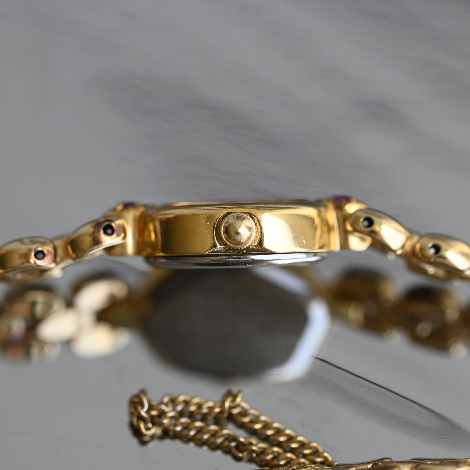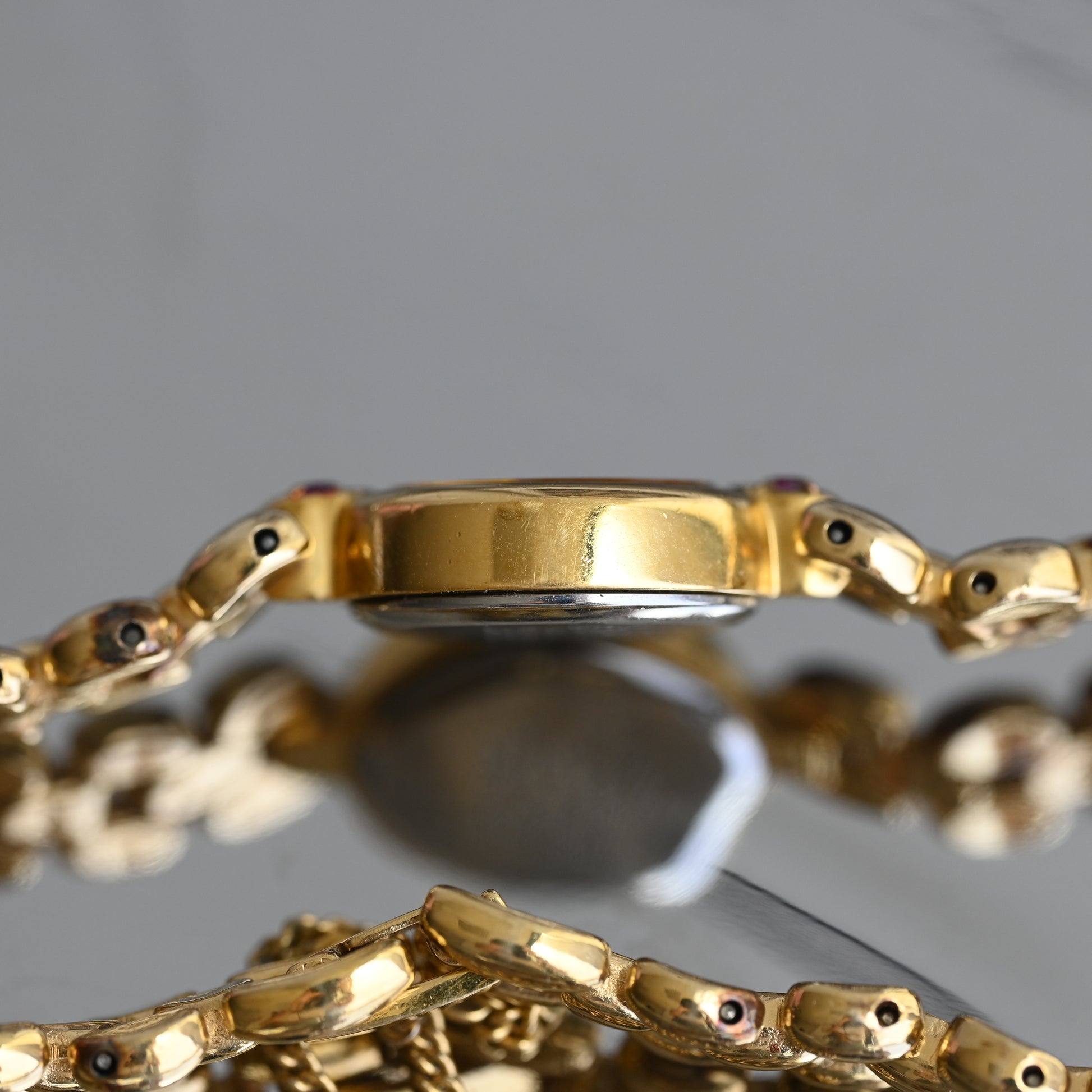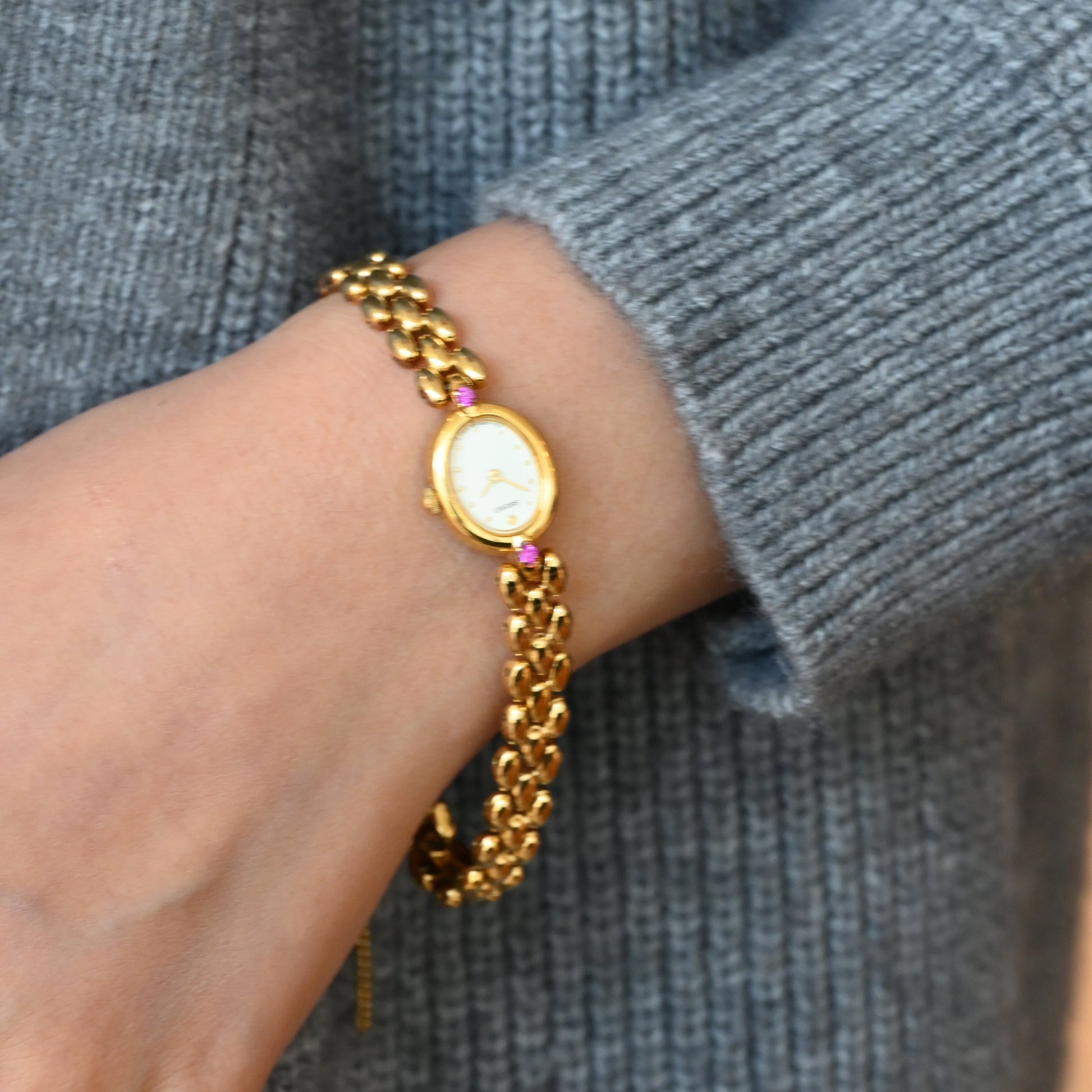 Crafted in a gold-tone oval case, this watch features a clean white dial with minimalist dot hour markers and slim hands for a refined, graceful look. The petite case is elevated by decorative lugs adorned with vibrant pink stones, adding a subtle touch of color and sophistication. Paired with its sculptural gold-tone bracelet design, it wears more like a jewelry piece than a traditional watch.