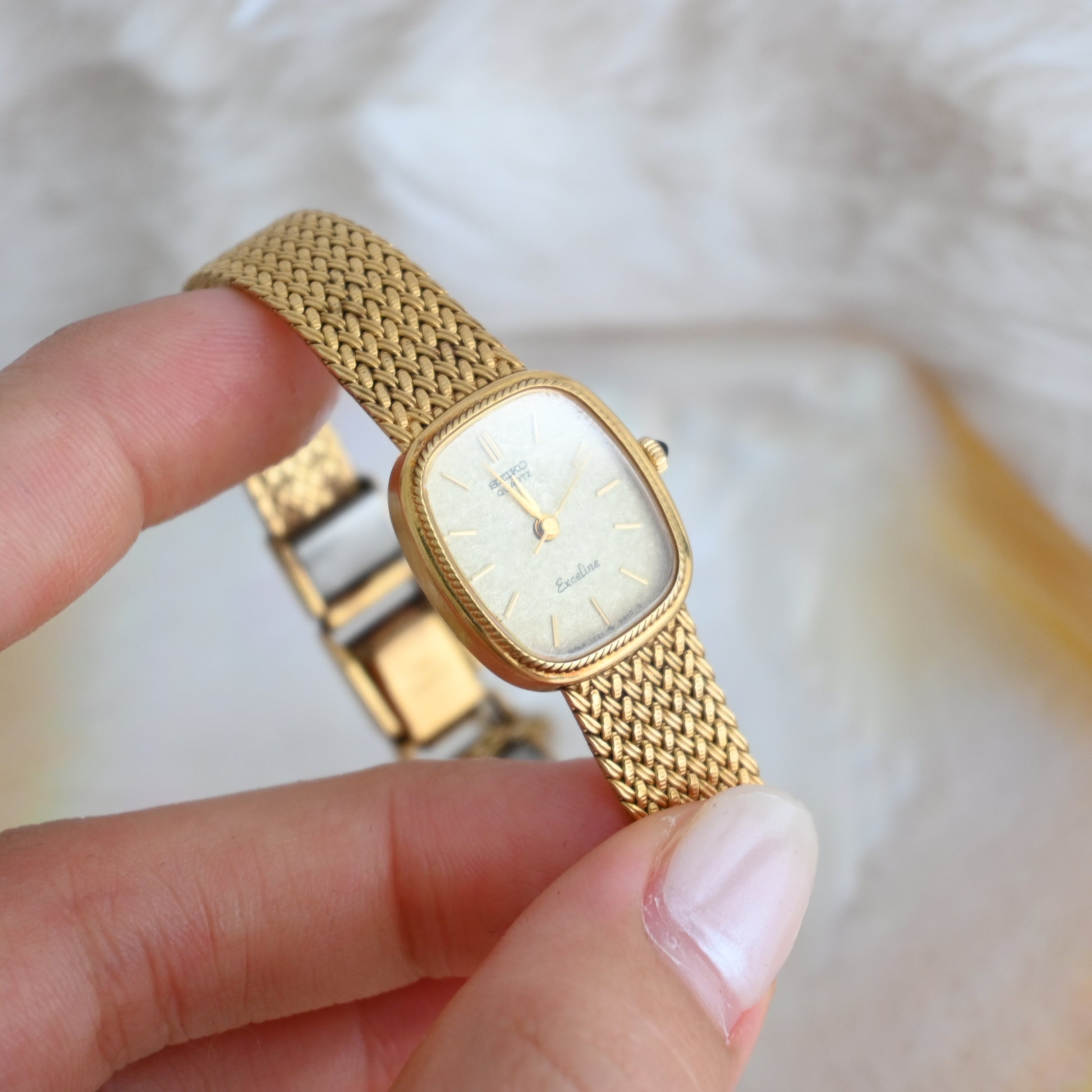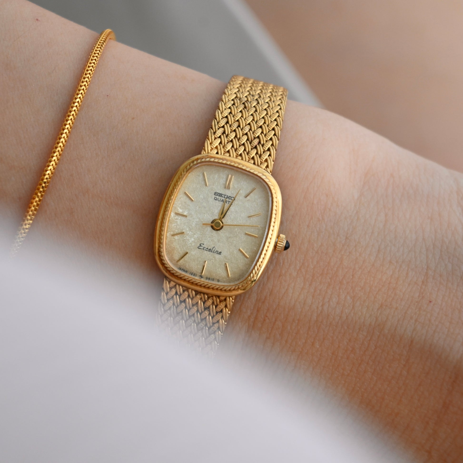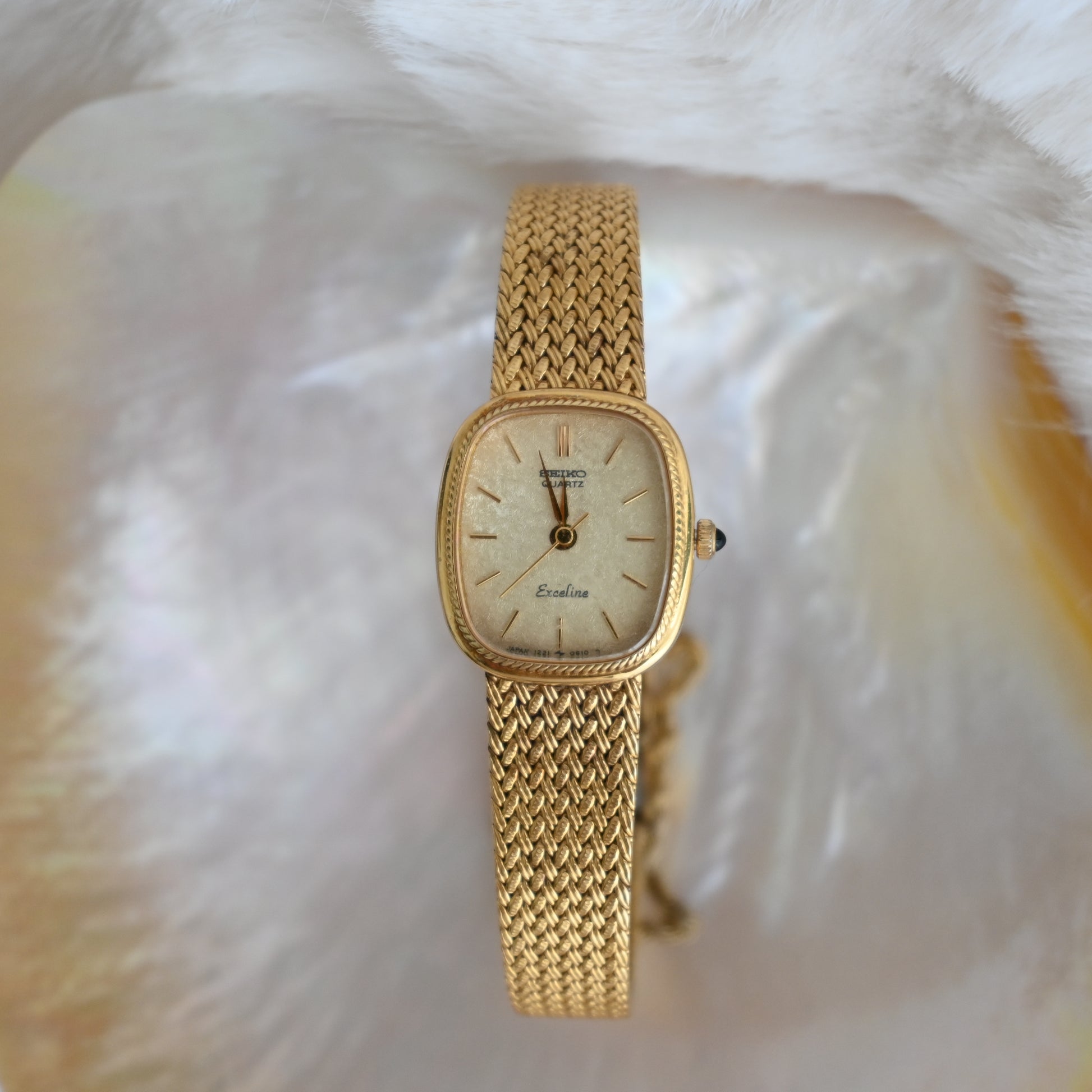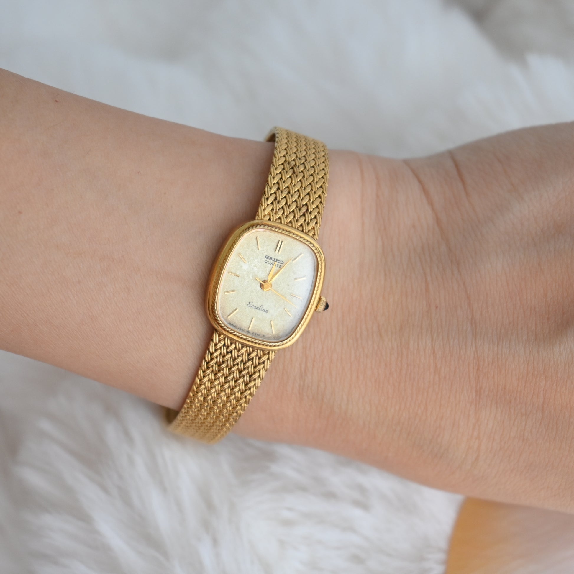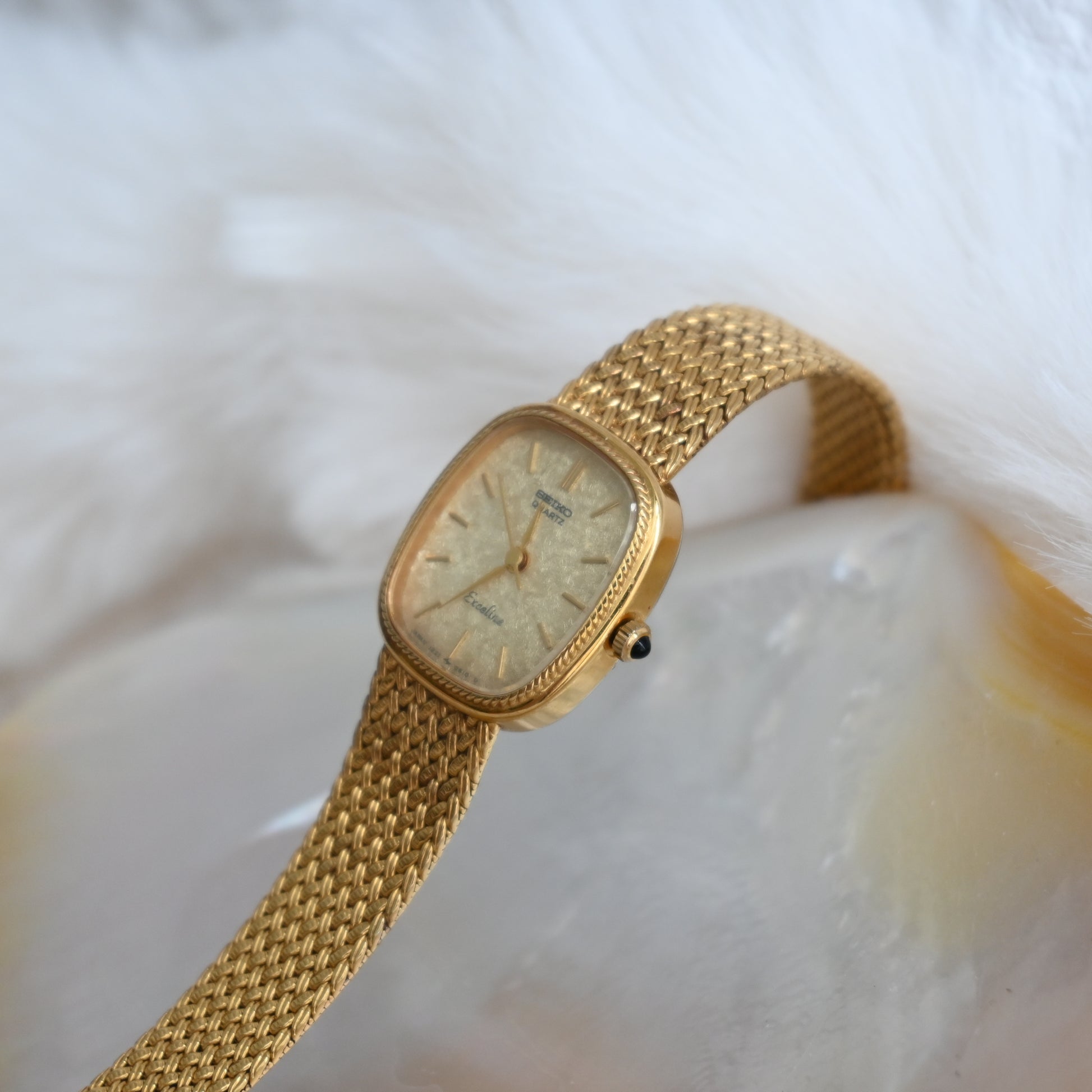 A whisper of vintage charm with a whole lot of shine — this Seiko Exceline wraps your wrist in gold-toned elegance. The softly curved square case and woven mesh bracelet are pure retro glamour.