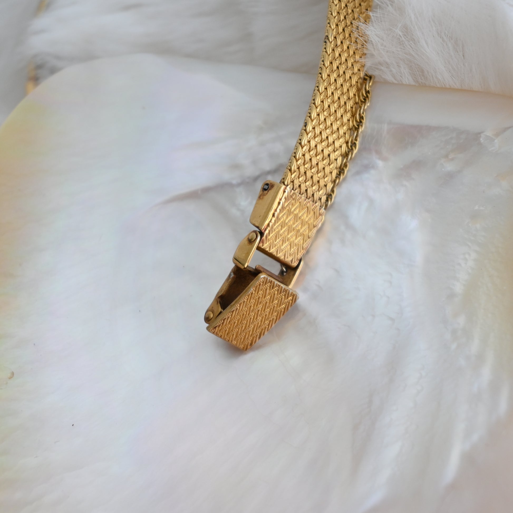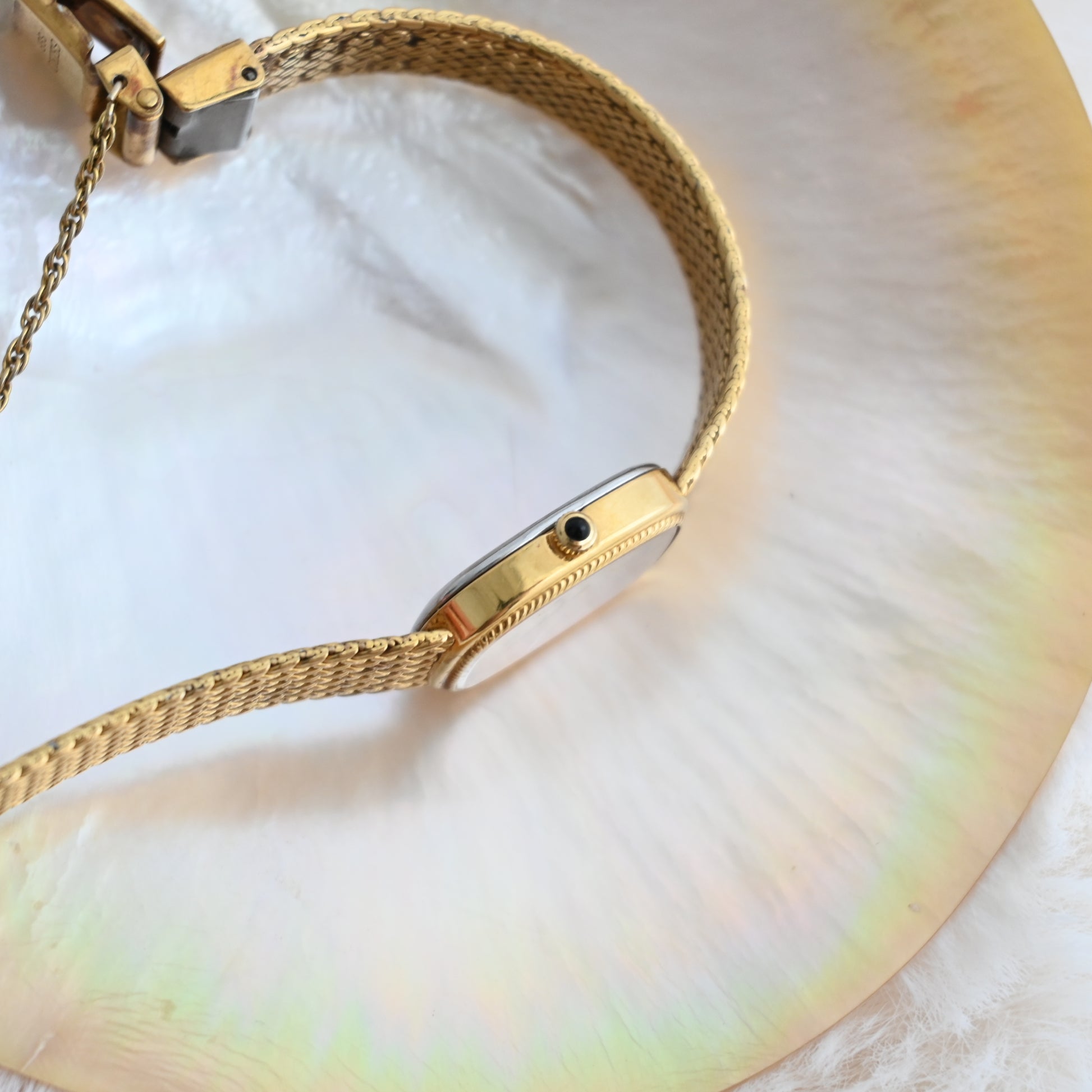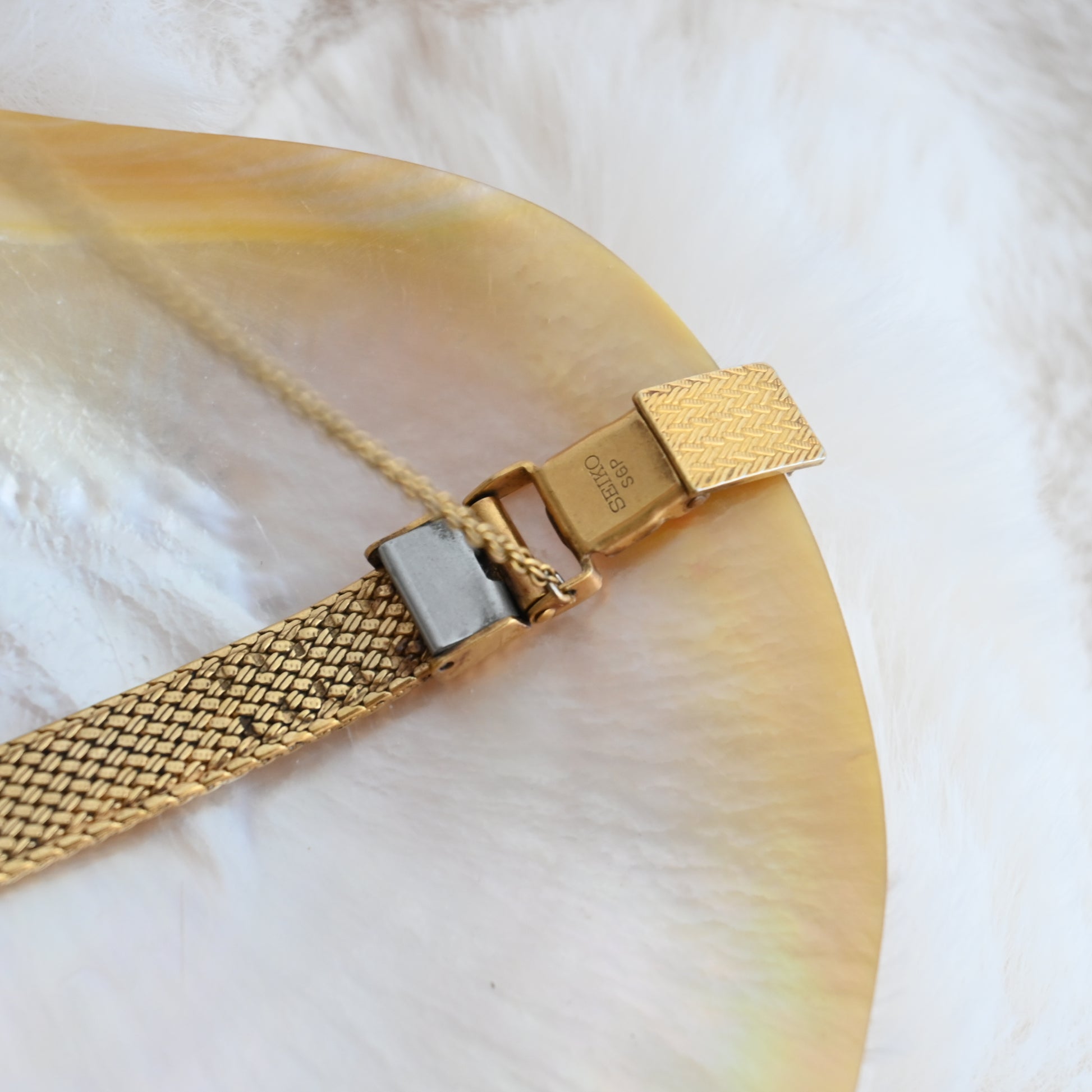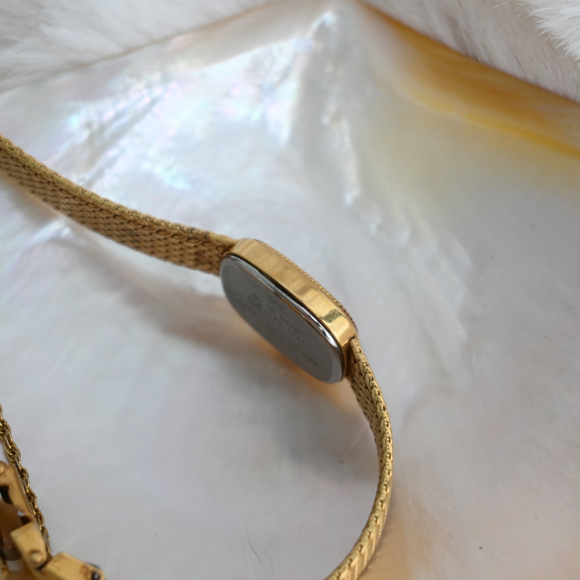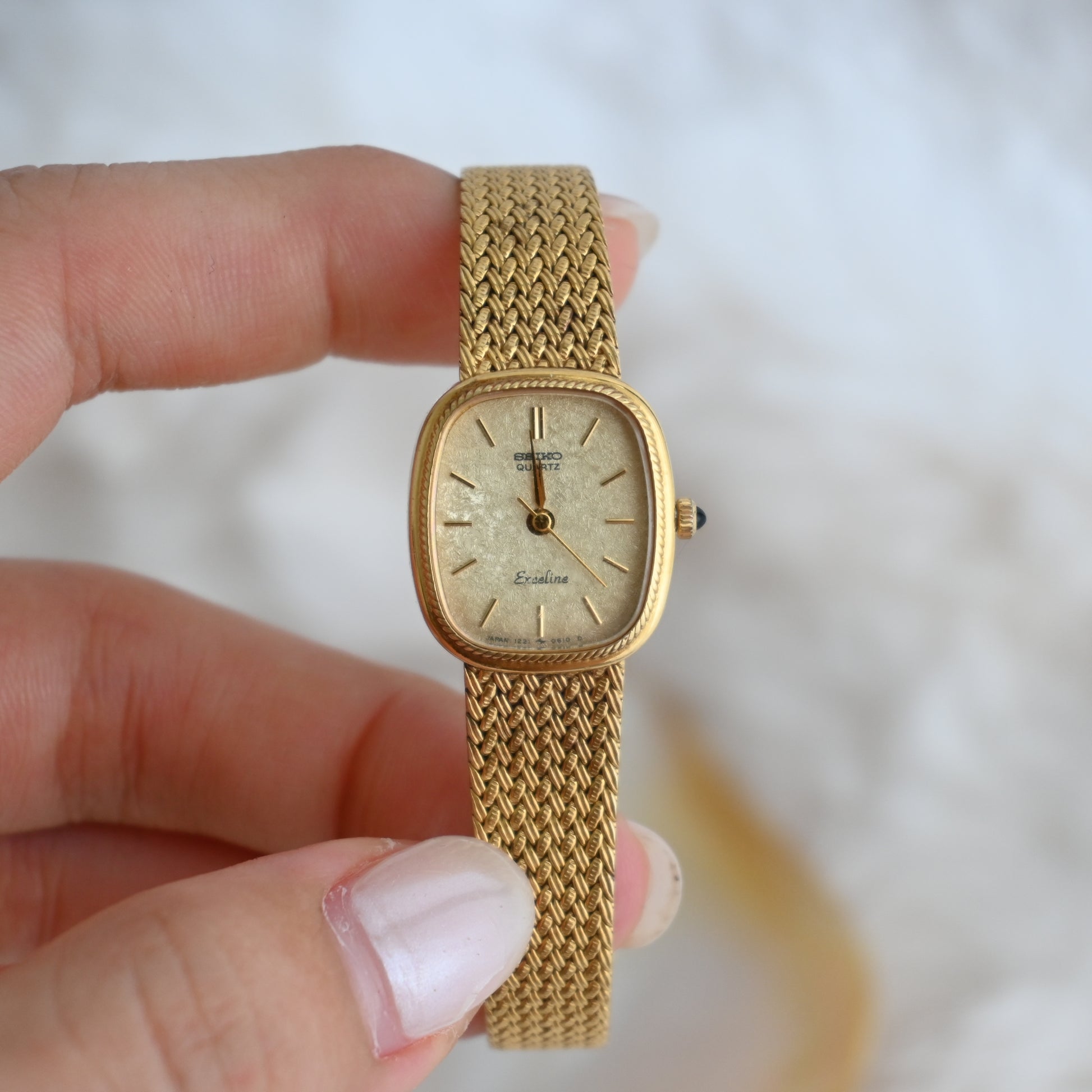 A whisper of vintage charm with a whole lot of shine — this Seiko Exceline wraps your wrist in gold-toned elegance. The softly curved square case and woven mesh bracelet are pure retro glamour.