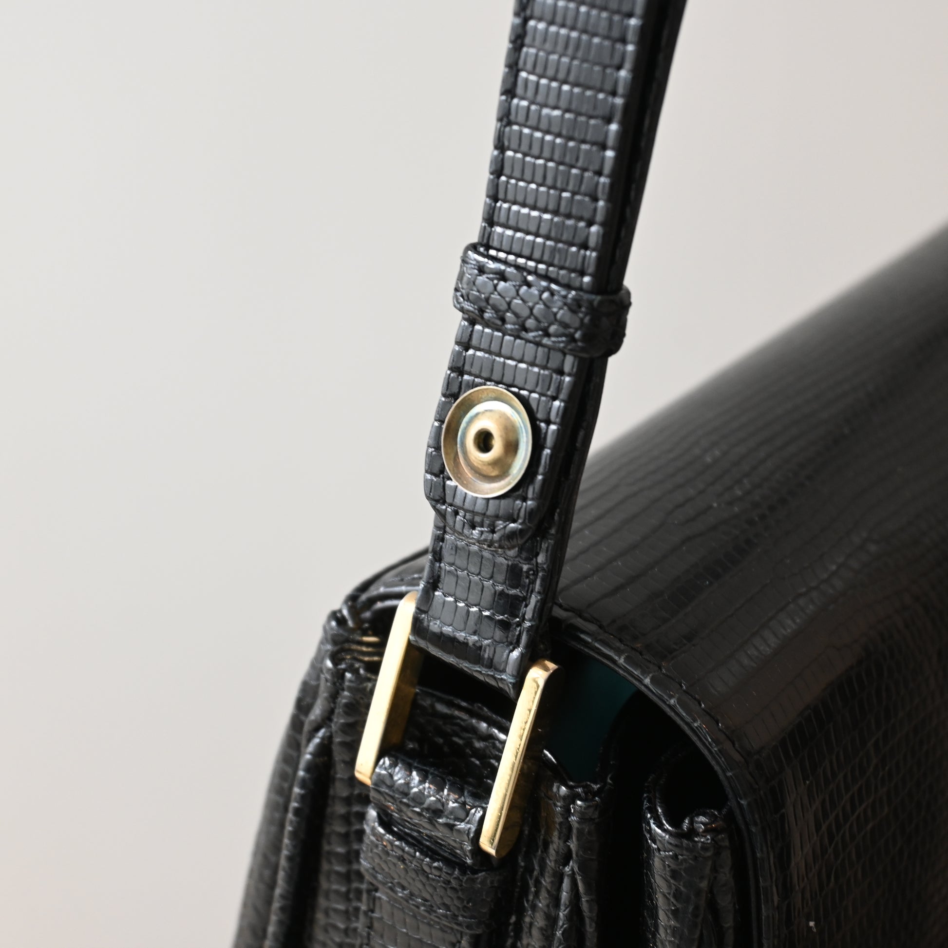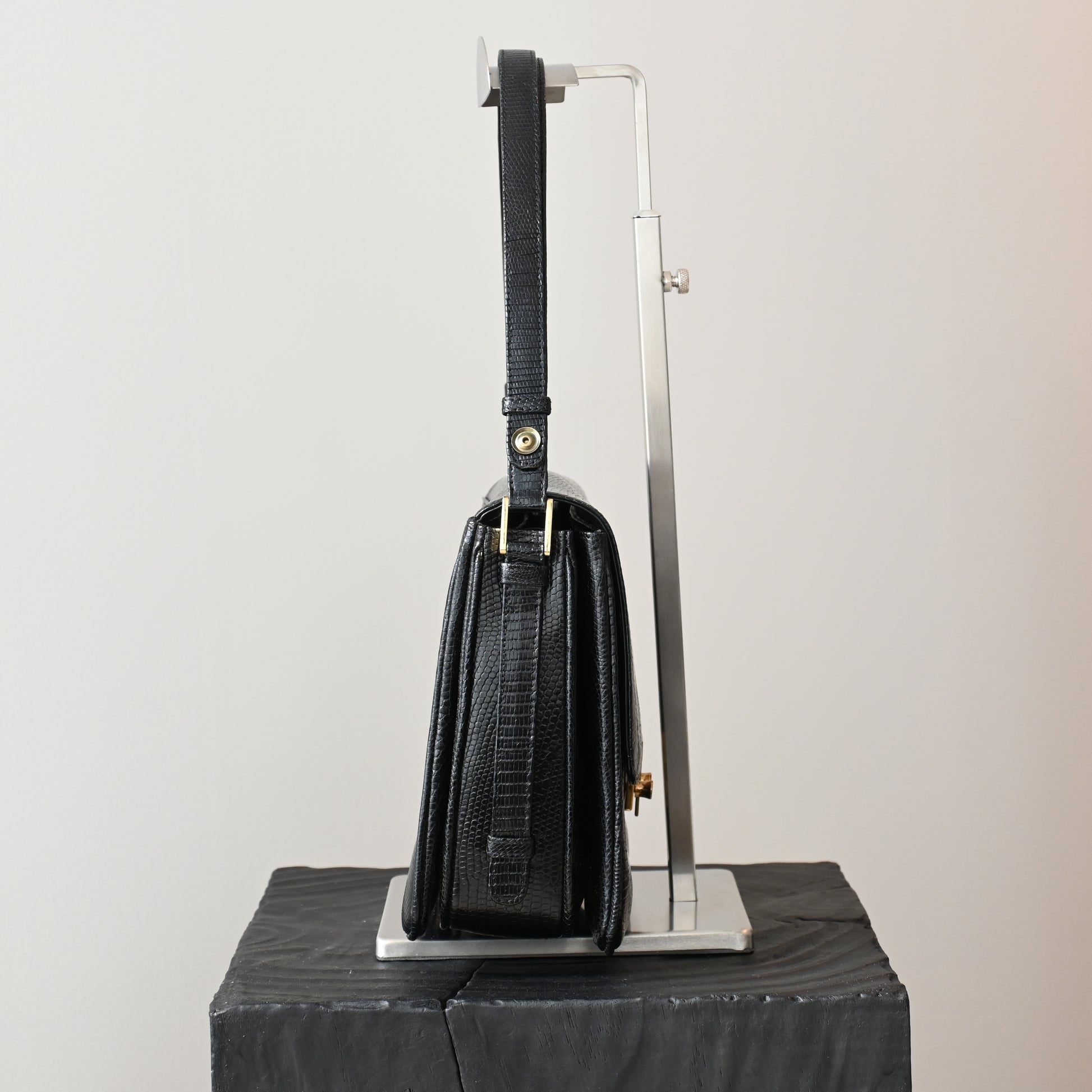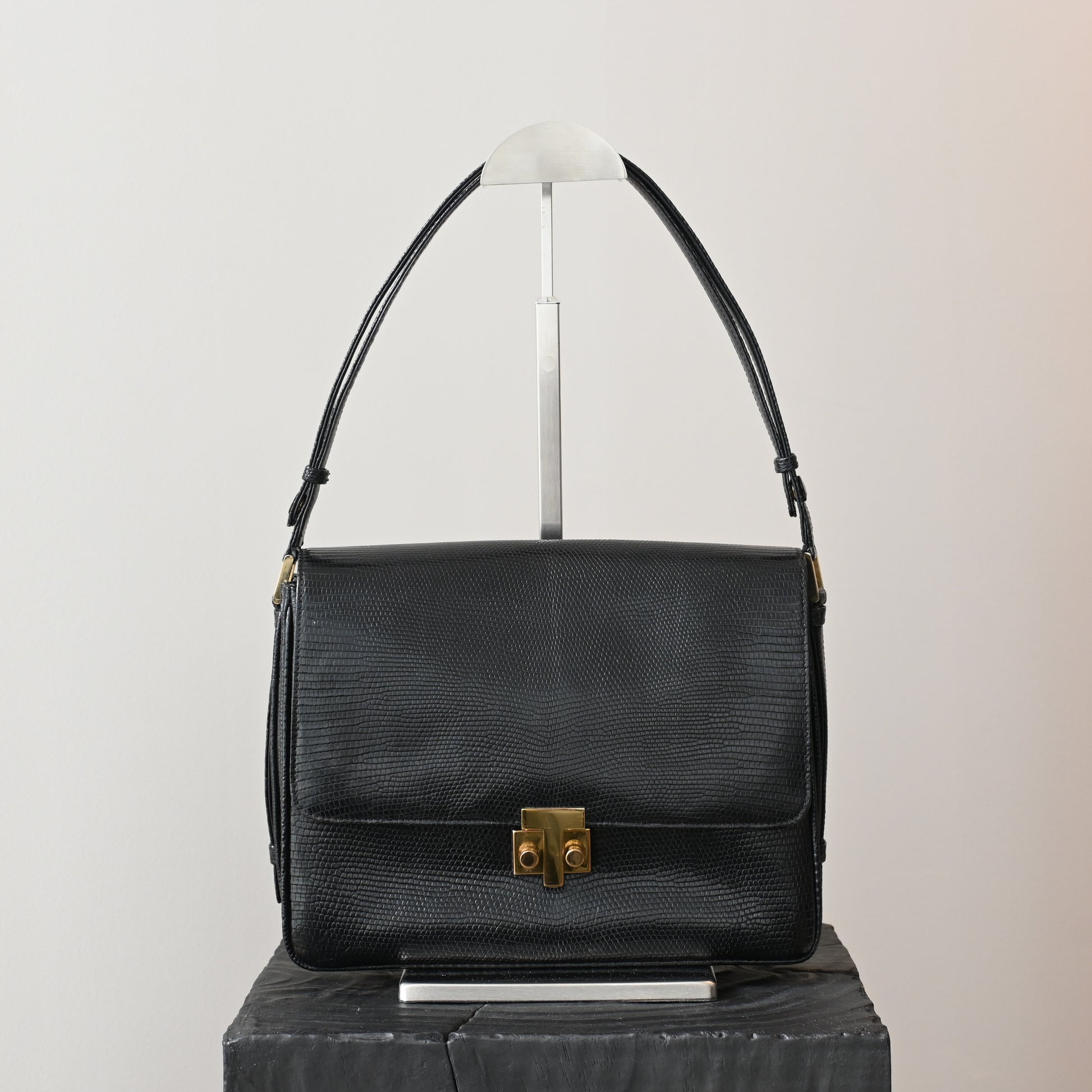 Crafted from beautifully textured lizard leather, this bag showcases a structured yet softly contoured silhouette that sits gracefully on the shoulder.