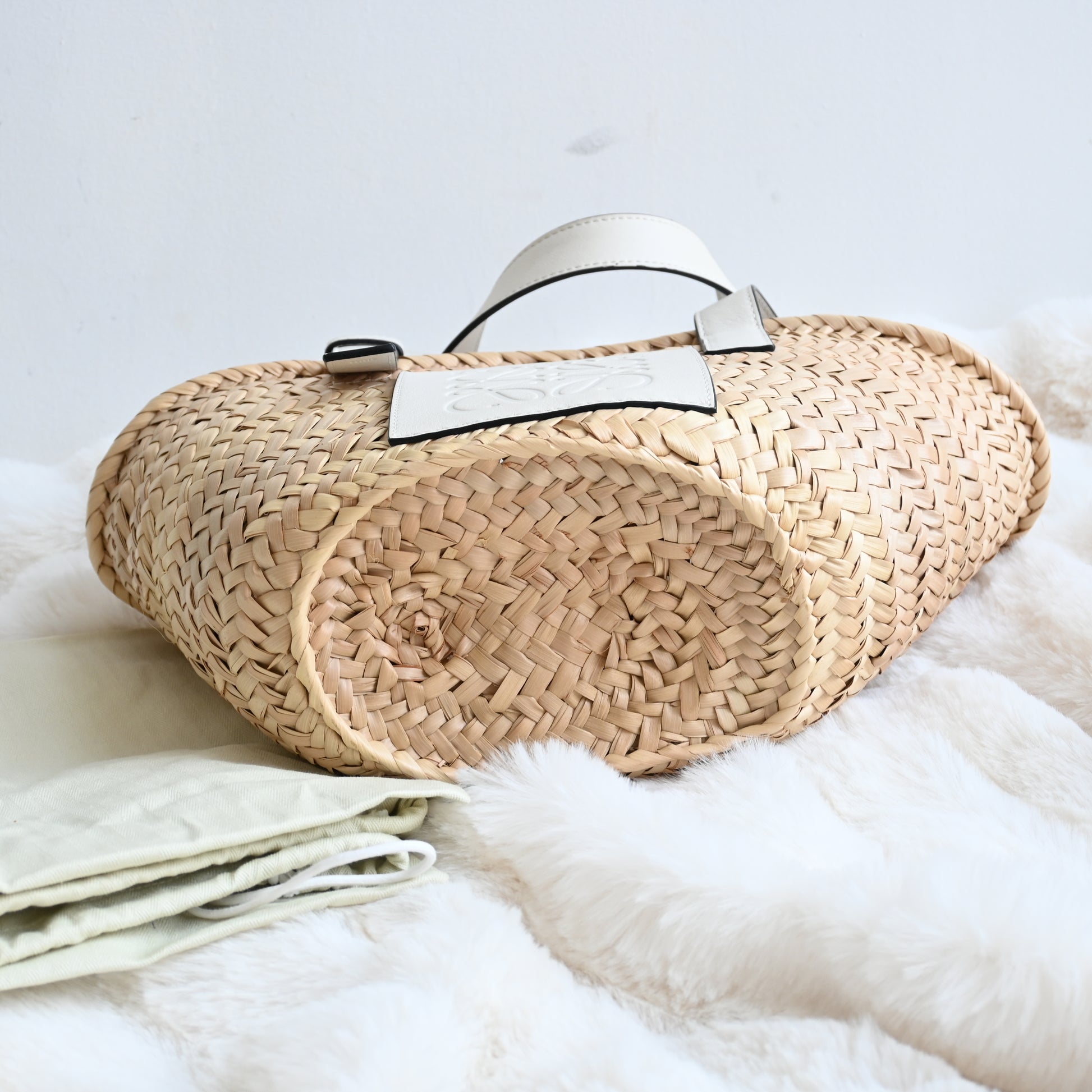 Ready for a vacation? This bag is definitely summer goals. The straw weave is giving effortless beach chic, but the crisp white leather straps and the giant, embossed Loewe Anagram patch.